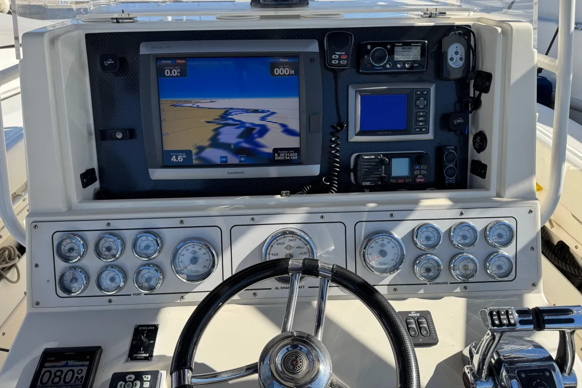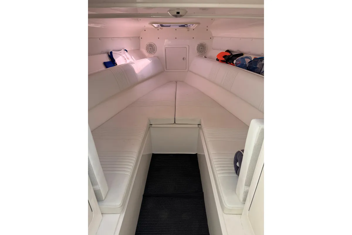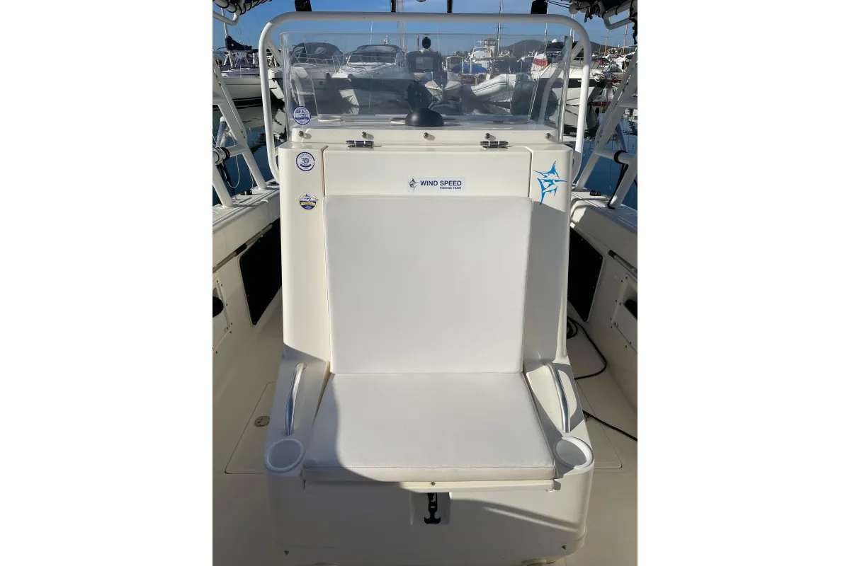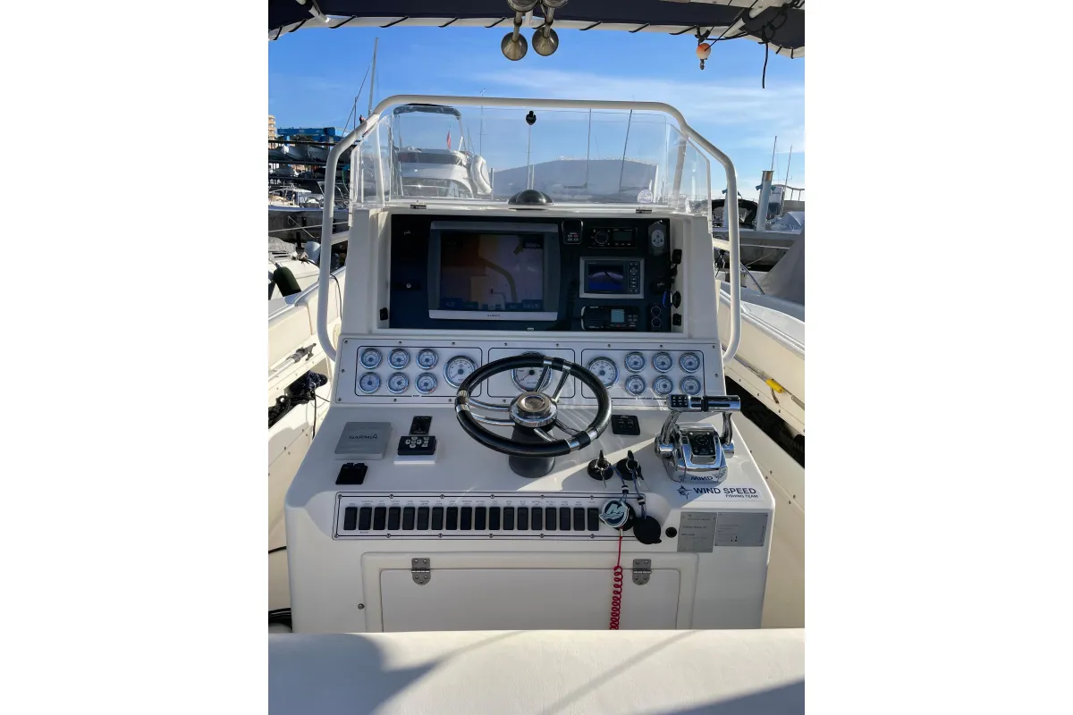 Exceptionally well equipped and powered by two high-performance engines, it satisfies even the most demanding tastes. Outstanding Garmin electronics package, including sonar, radar, plotter, and more. It also features a bathroom and a spacious interior cabin convertible into a double bed.