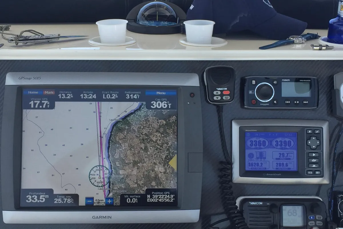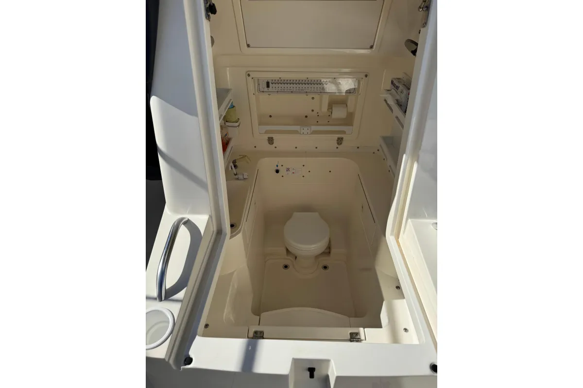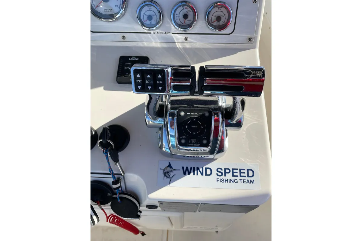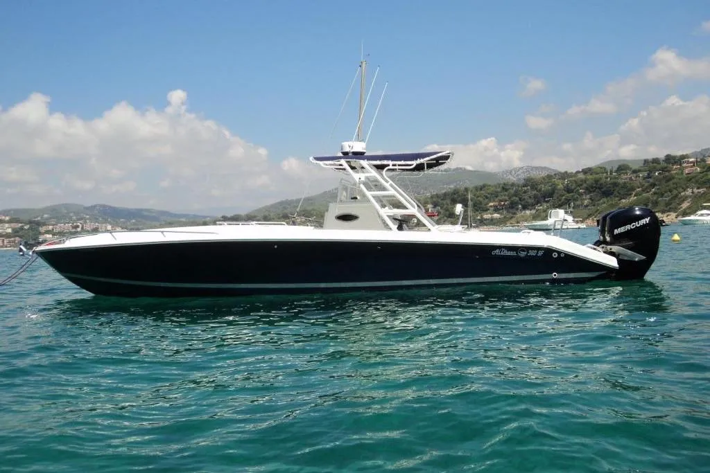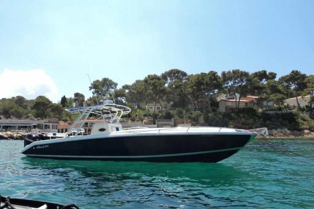Exceptionally well equipped and powered by two high-performance engines, it satisfies even the most demanding tastes. Outstanding Garmin electronics package, including sonar, radar, plotter, and more. It also features a bathroom and a spacious interior cabin convertible into a double bed.