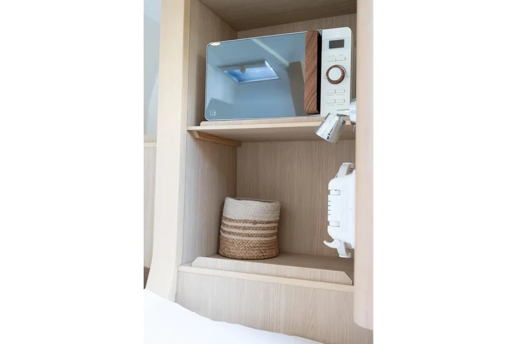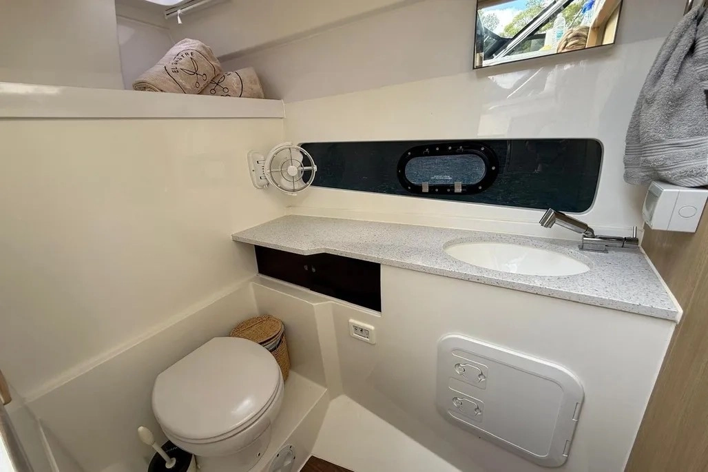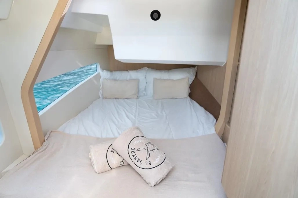 Su amplia manga aporta una estabilidad notable y permite una distribución generosa en cubierta, con un solárium de proa de gran tamaño, una bañera versátil y plataformas de baño extendidas. La cabina cerrada incorpora una litera doble y un WC eléctrico de agua dulce, lo que facilita tanto la navegación diurna como las escapadas de fin de semana.