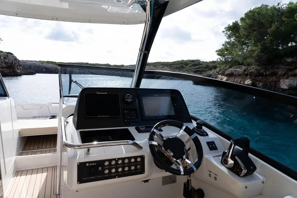 Sistema Joystick Piloting, función Skyhook de mantenimiento de posición, piloto automático, Raymarine Axiom 12”, VHF, AIS, cubierta en teca sintética, hardtop, toldo de popa con mosquiteras, funda de invierno, lona de fondeo, microondas, kit de seguridad, kit de fondeo y cofre de estiba bajo el puesto de mando.