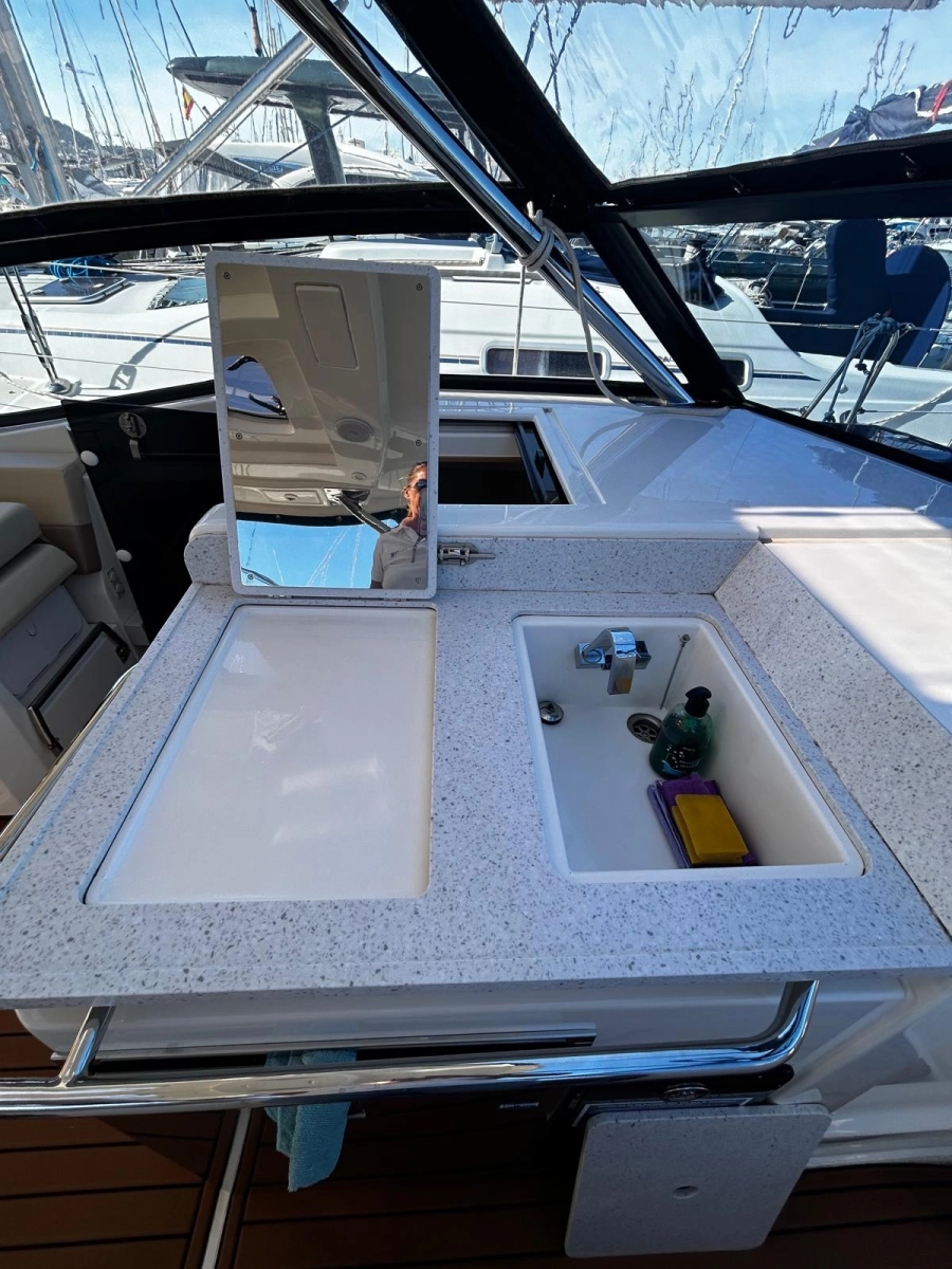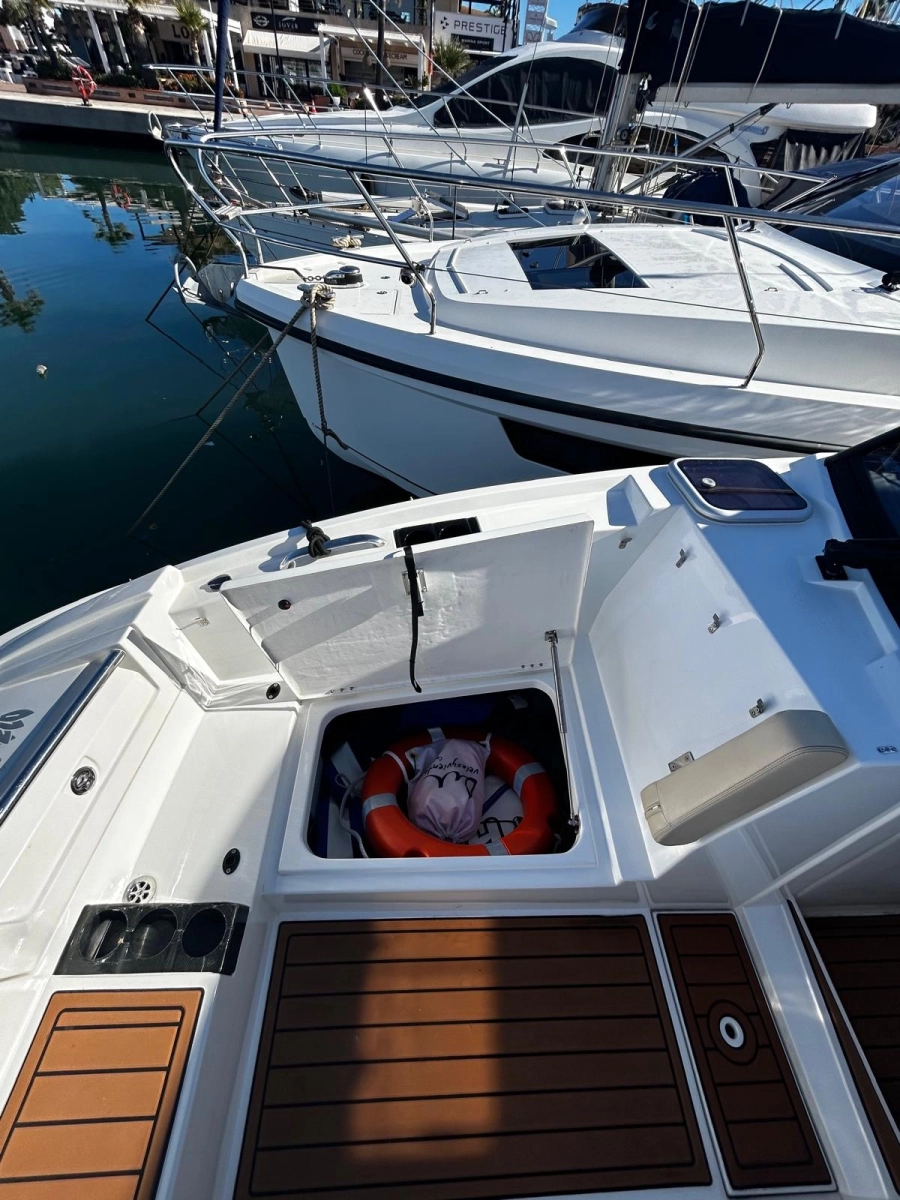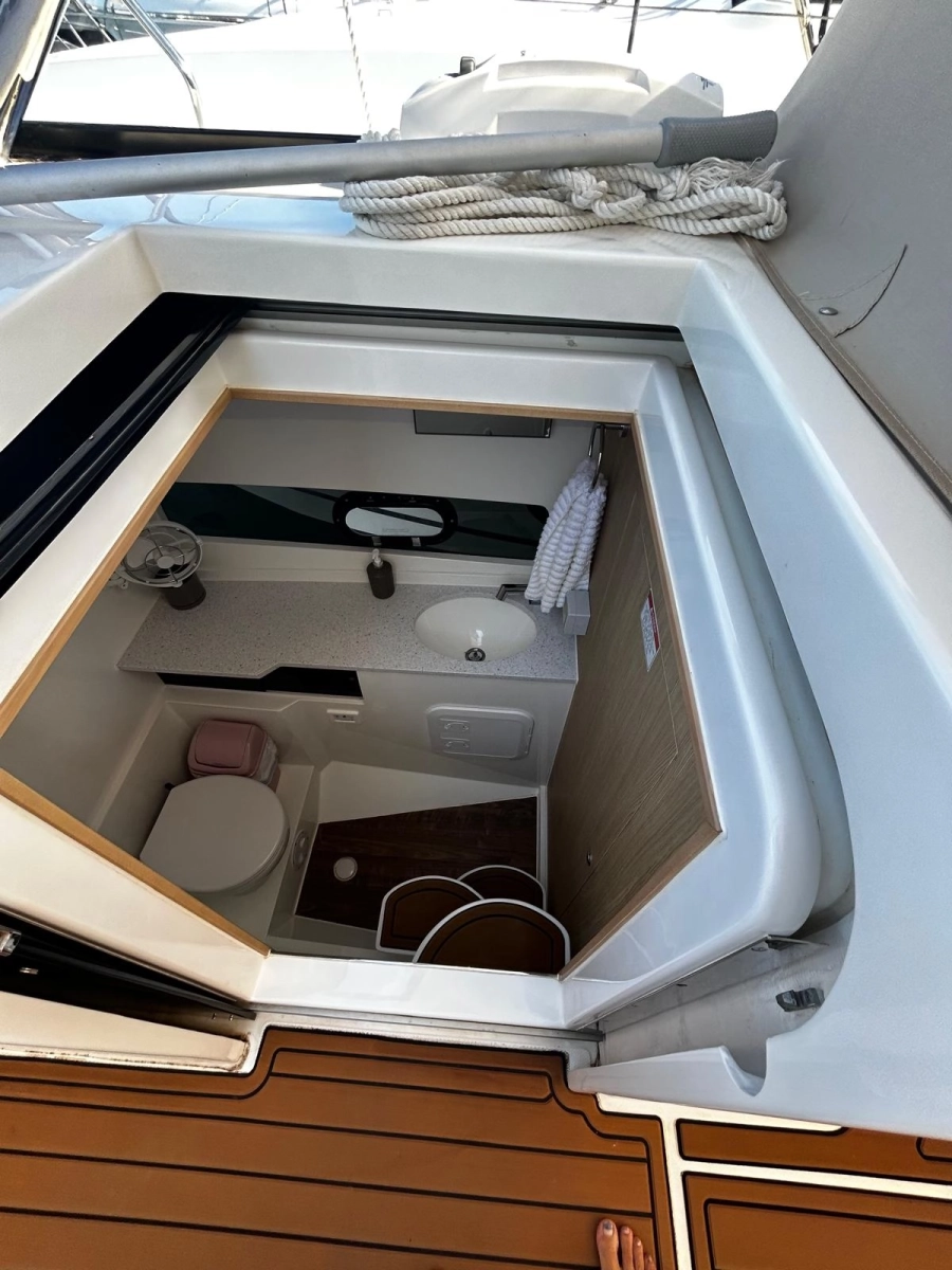 El interior costa de un amplio camarote y un cuarto de baño, mientras que la cubierta encontramos diferentes zonas de descanso y de recreo tanto en popa como en proa, así como una mesa central para comidas y aperitivos. Cuenta con un techo fijo que le permitirá disfrutar del sol y de sombra a selección. Además dispone de un techo bimini fijo en popa.