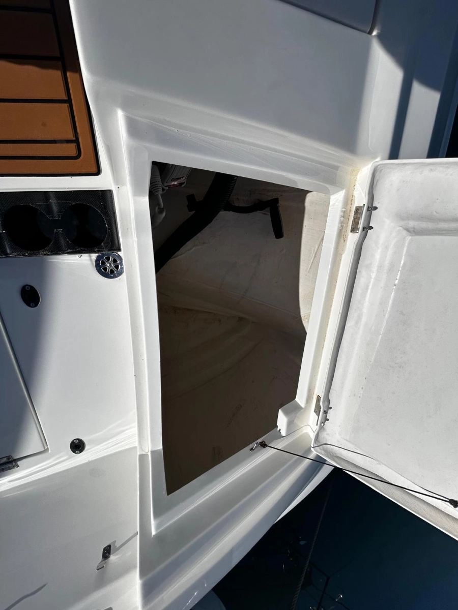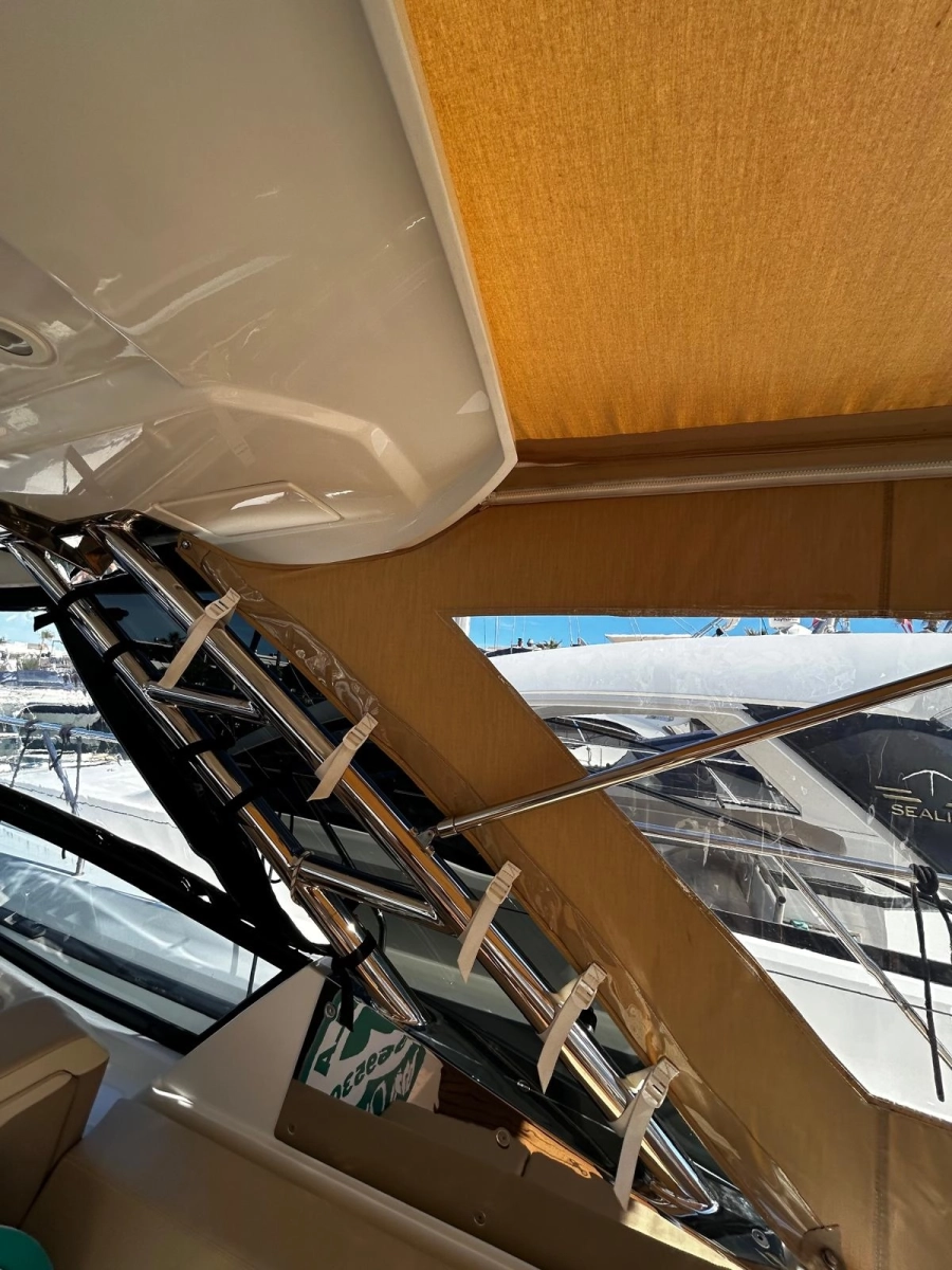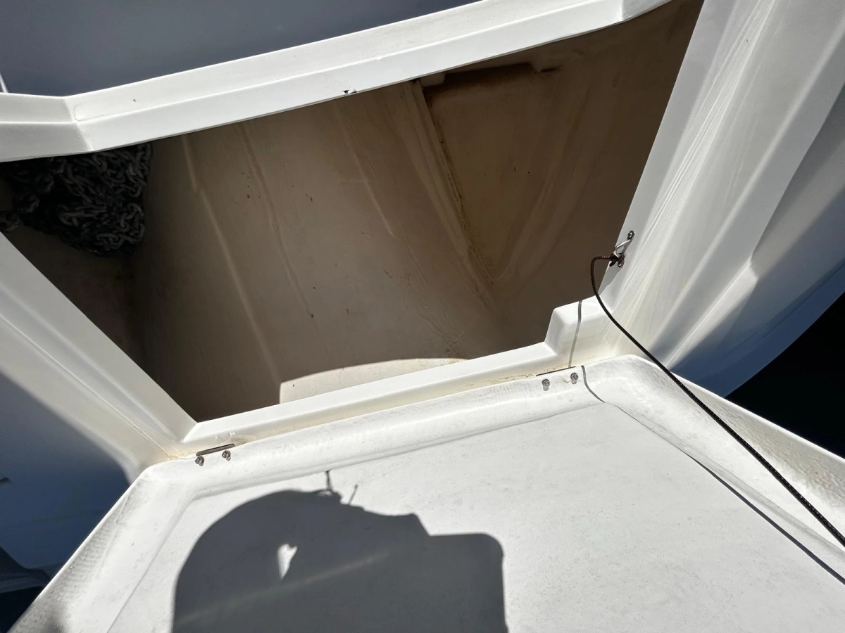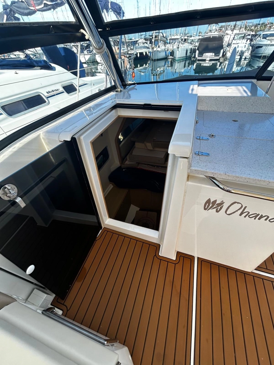 El interior costa de un amplio camarote y un cuarto de baño, mientras que la cubierta encontramos diferentes zonas de descanso y de recreo tanto en popa como en proa, así como una mesa central para comidas y aperitivos. Cuenta con un techo fijo que le permitirá disfrutar del sol y de sombra a selección. Además dispone de un techo bimini fijo en popa.