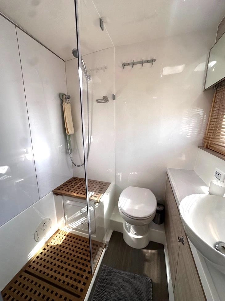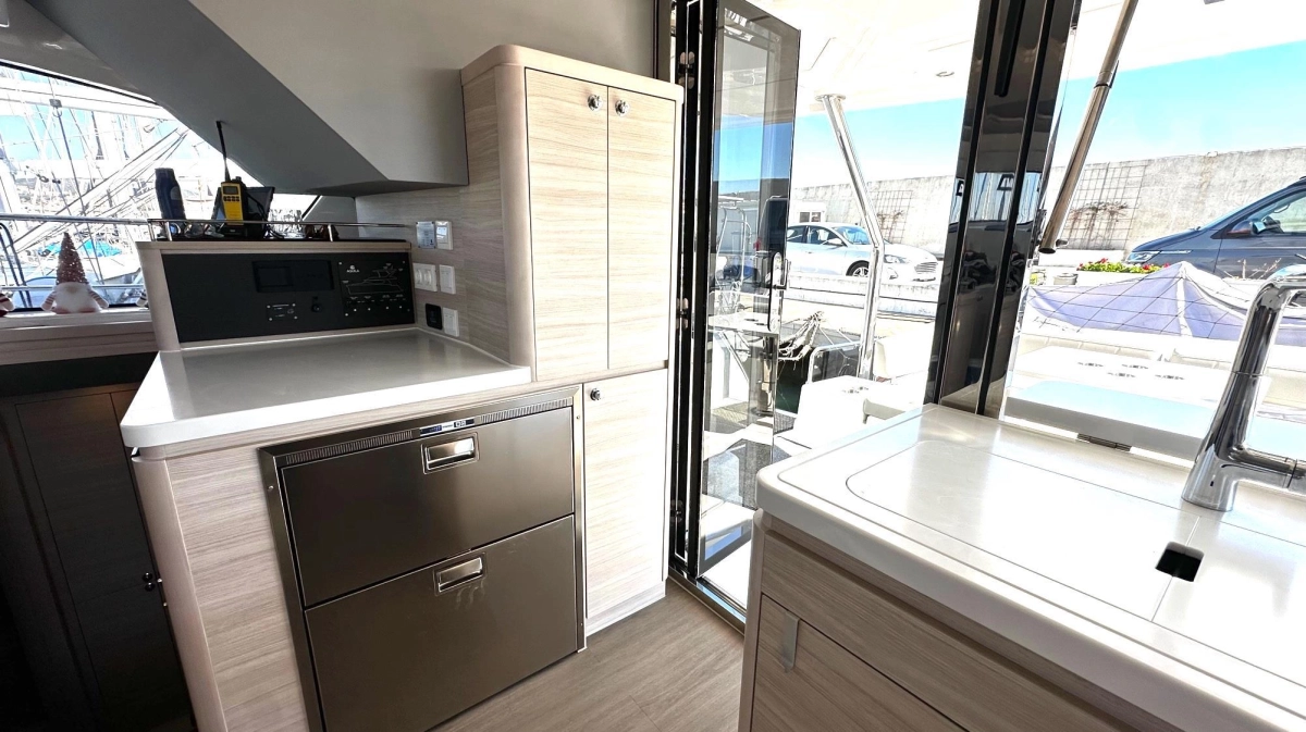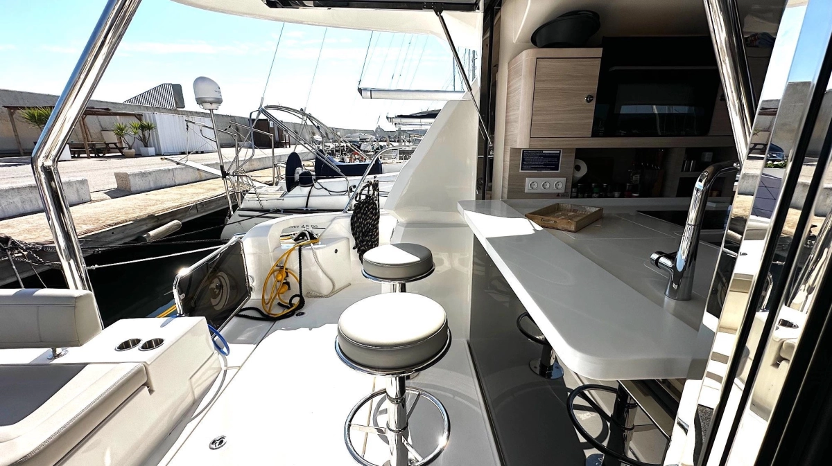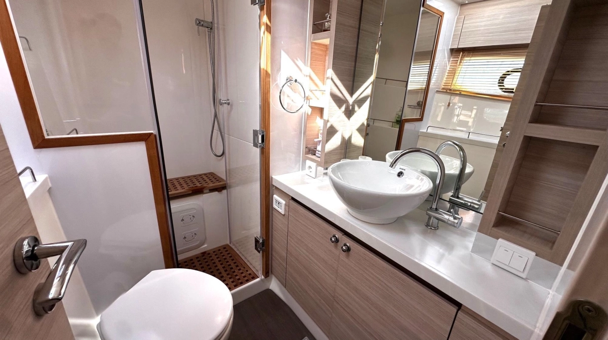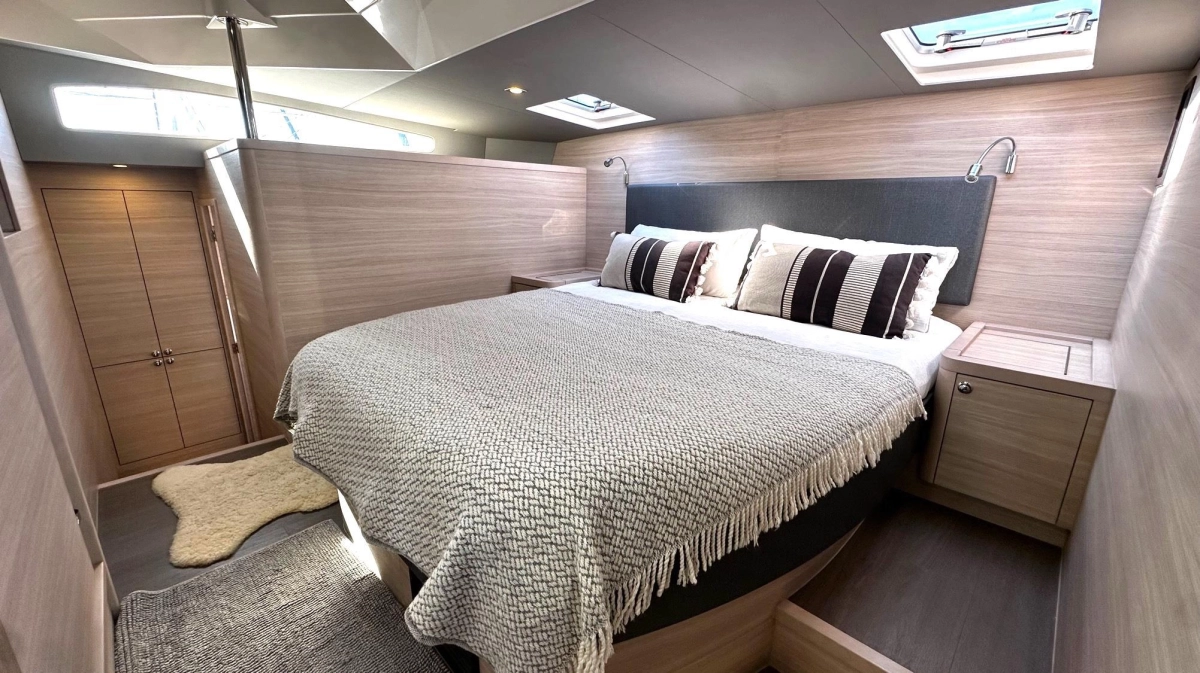 El diseño propio de Aquila —marca líder mundial en catamaranes a motor— garantiza una navegación suave y económica, reforzada por los característicos bulbos de proa, que reducen el cabeceo y mejoran el rendimiento.