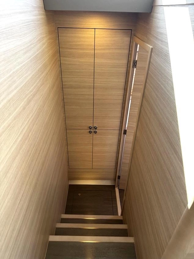 - Escalera central que conecta flybridge y proa