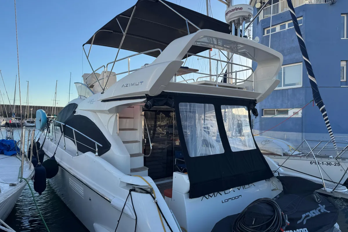 [EN] Introducing the stunning 2013 Azimut 45 Flybridge, a remarkable blend of elegance and performance. This used vessel boasts an impressive overall length of 13.78 meters, showcasing its sleek design and spacious layout. Crafted from durable fiberglass with a deep Vee hull shape, it promises stability and a smooth ride on the water. Powered by twin Cummins QSB inboard engines, each delivering 480 hp, this yacht ensures exhilarating performance with just 493 and 490 hours of use. The electric windlass adds convenience to your anchoring experience, enhancing your time spent on the water. Accommodating three well-appointed cabins, the Azimut 45 Flybridge offers ample space for relaxation and comfort. This luxurious boat is perfect for those seeking adventure and leisure, making every journey unforgettable. Experience the freedom of the seas aboard the AMA LA VIDA, where sophistication meets functionality.