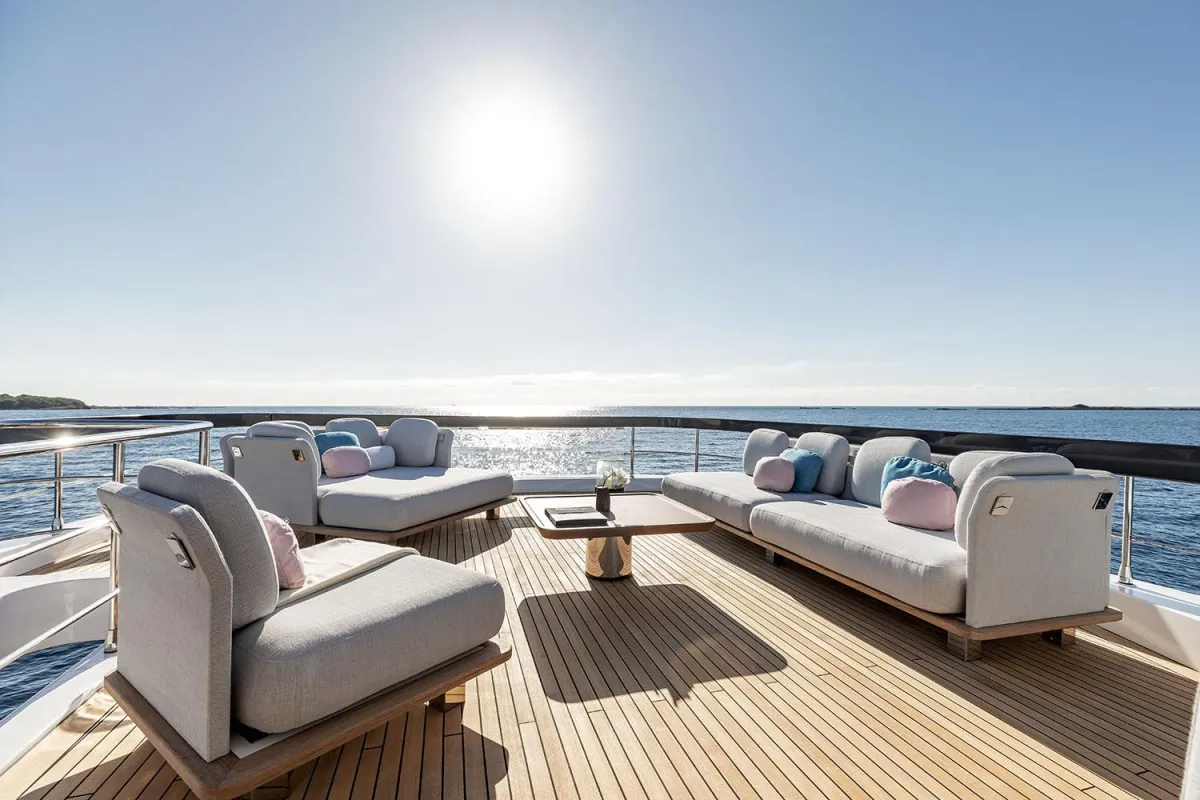 La curvatura orgánica de los exteriores del Grande 26M se equilibra con las líneas deportivas del casco, creando una estética increíblemente completa. Siguiendo el mismo concepto, su imponente volumen se ve aligerado por las amplias superficies acristaladas visibles desde el perfil, que alcanzan su máximo esplendor en la proa de la cubierta principal, evocando la privilegiada suite principal. A pesar de contar con un techo rígido, las proporciones del yate le confieren la estética estilizada de un coupé.