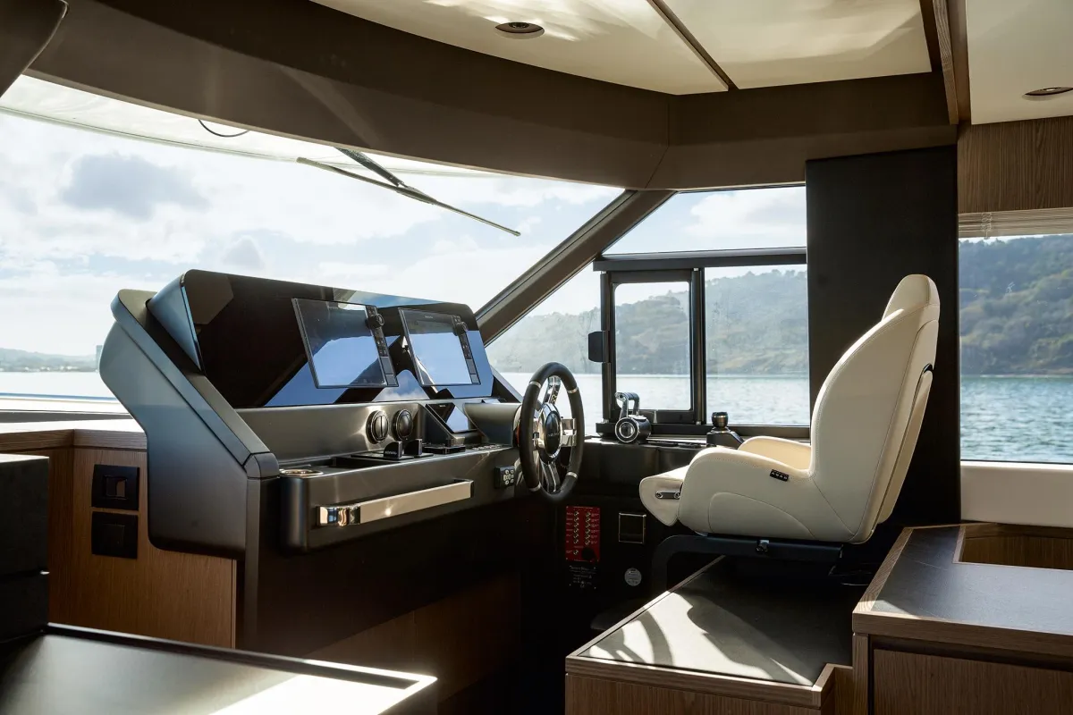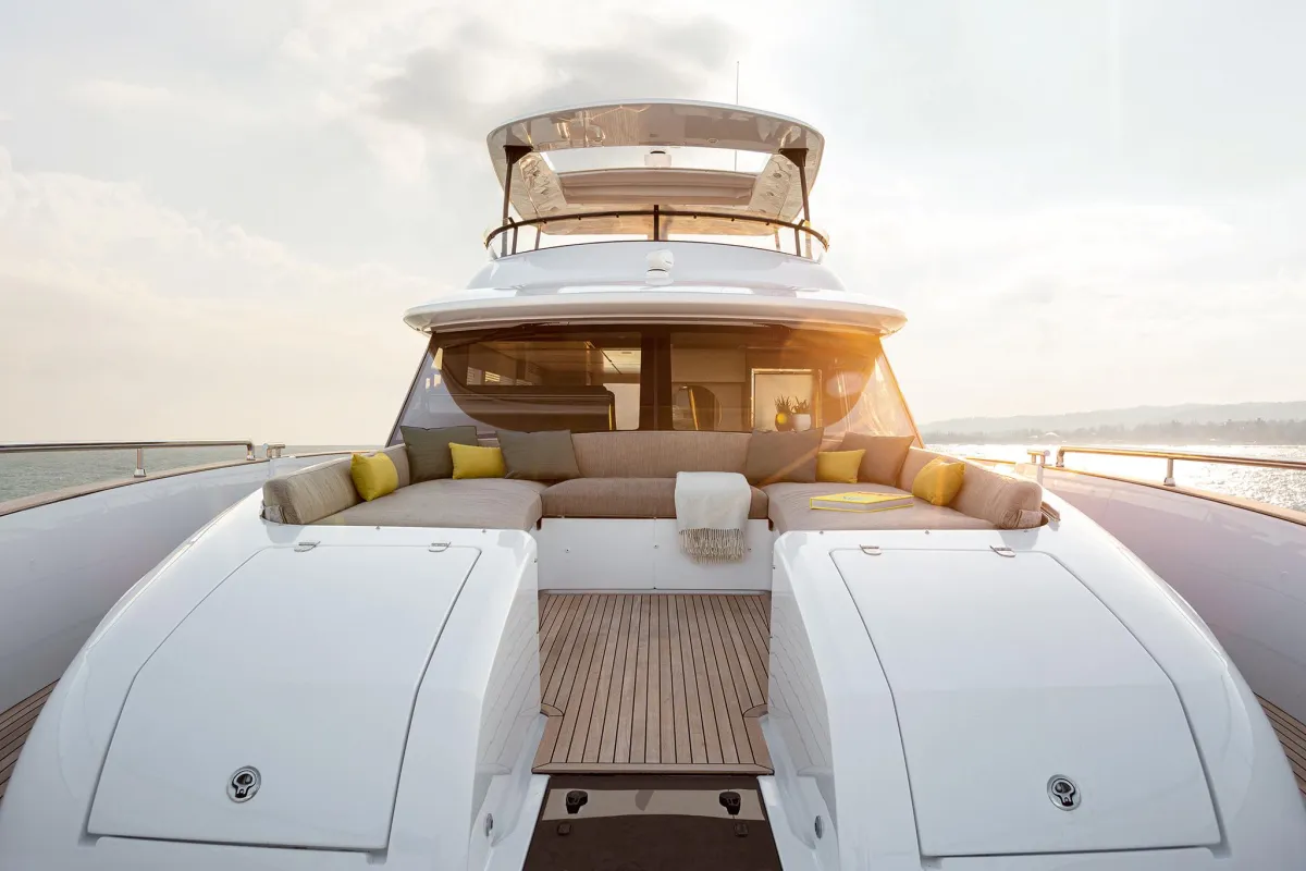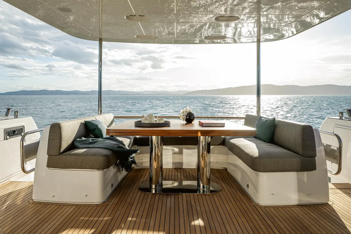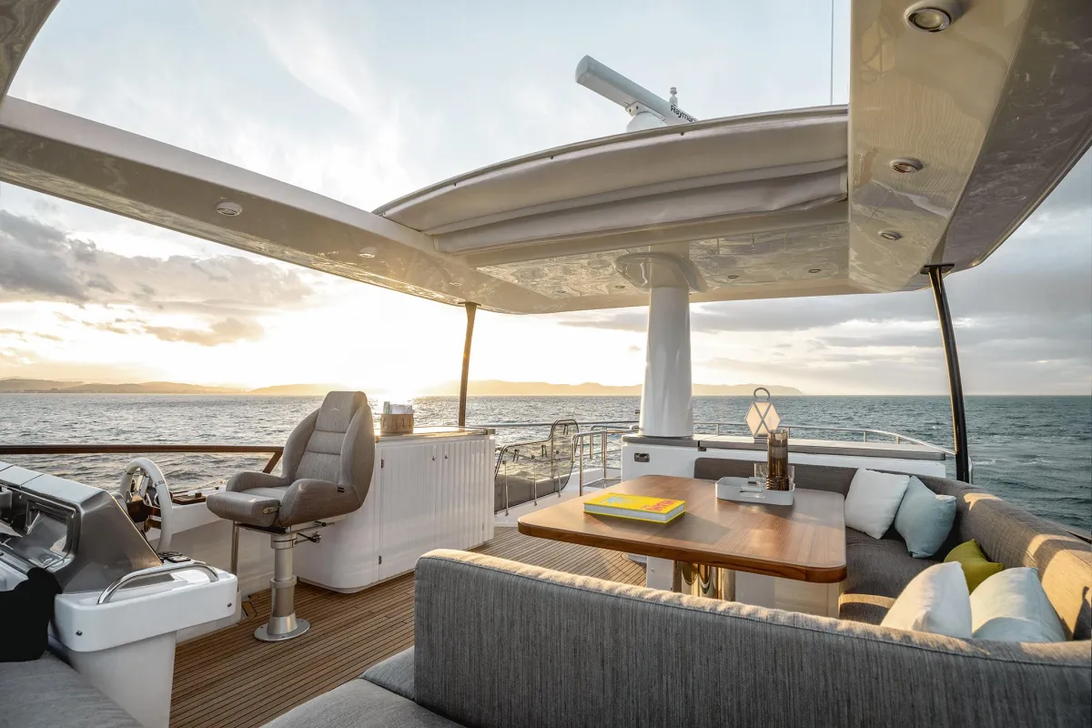 The flybridge is a wide, panoramic deck under the sun, with an external helm adjacent the dinette. The flybridge of the Magellano 66 has been enlarged to full beam in the aft part, which can be configured with additional storage and an American bar or left open for freestanding furniture.