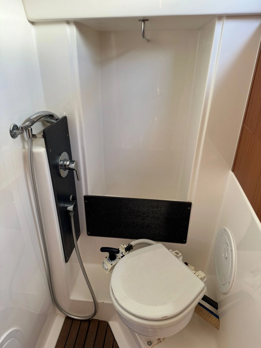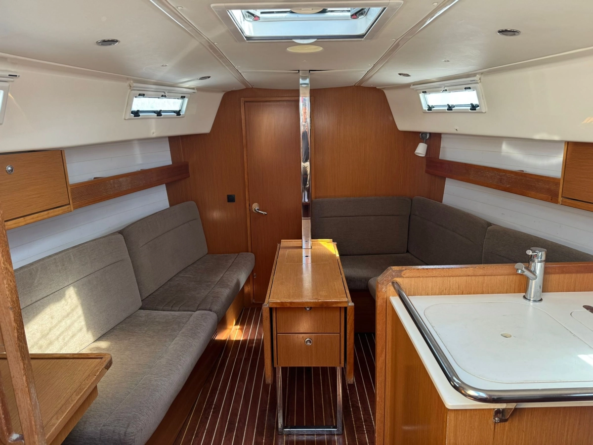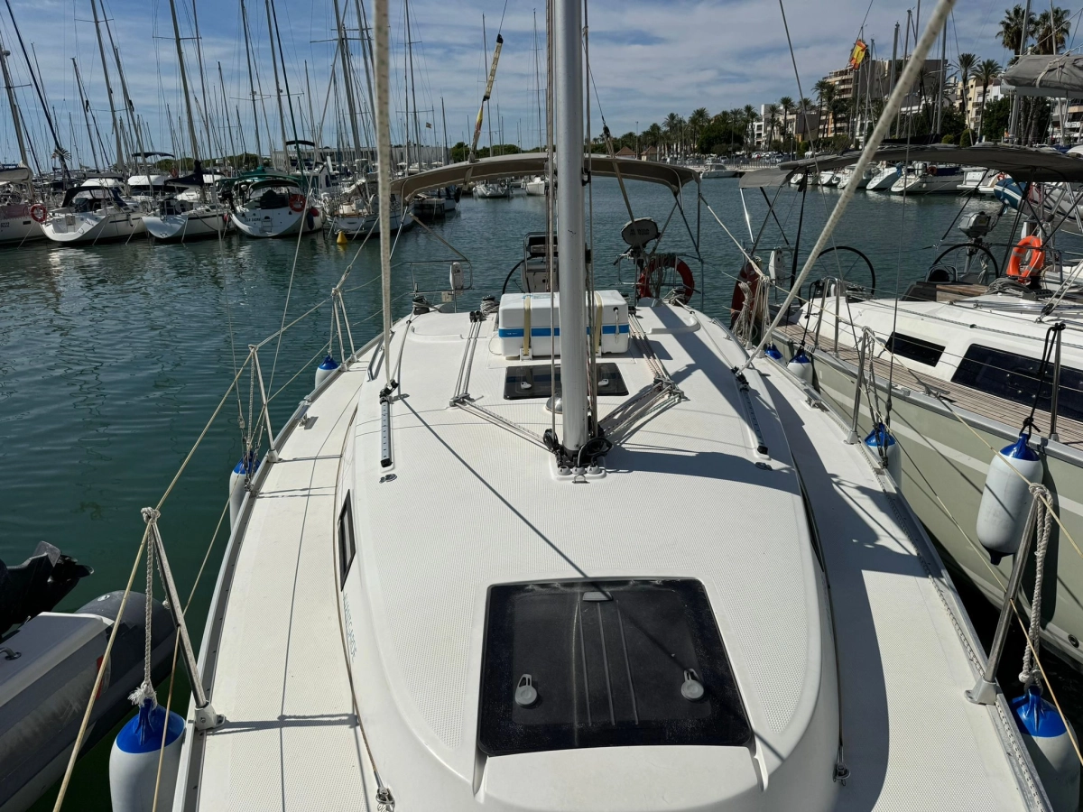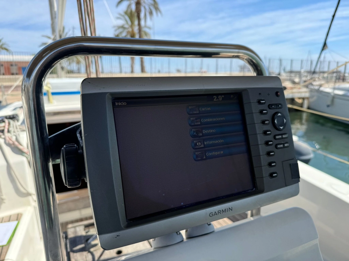 2 Cabinas 1 Baño, TV + Antena TV, Emisora VHF Garmin, GPS Plotter Garmin, Equipo de viento Garmin, Sonda + Corredera Garmin, Cargador y medidor de baterías, Radio exterior e interior, Cocina a gas con horno, Nevera eléctrica, Conexión 220V, Plataforma de baño abatible, Escalera de baño, Toldo Bimini, Mesa en bañera, Rueda plegable, Balsa y Radiobaliza a revisar, Neumática + FB 2.3 Hp, Molinete eléctrico.