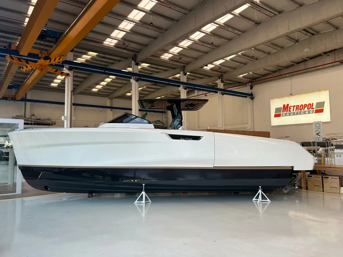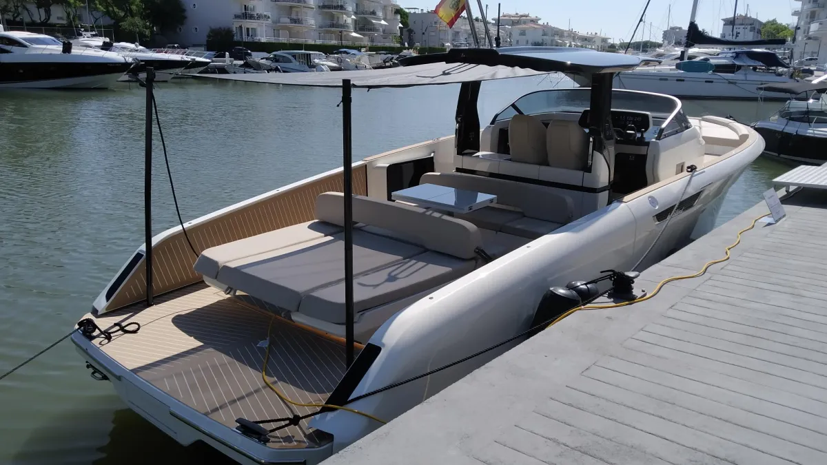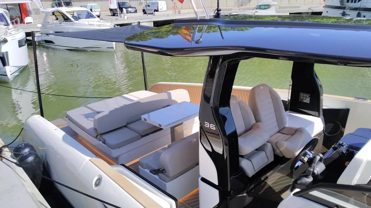 Embarcación en stock. Modelo Astor 36 del astillero italiano Bellini, de 11,30 m de eslora total. Embarcación con hard top y gran solárium a popa. Diseños modernos en interiores y exteriores.