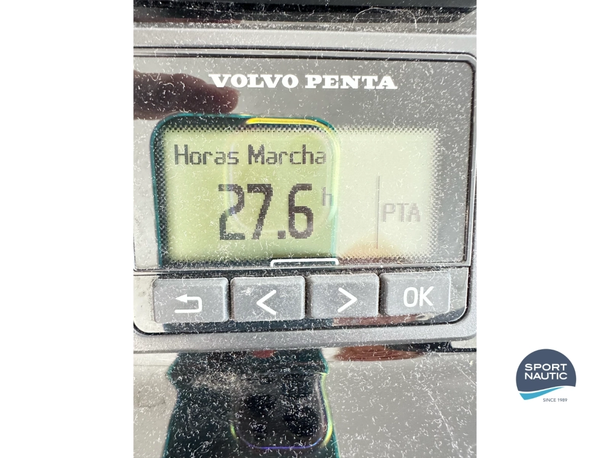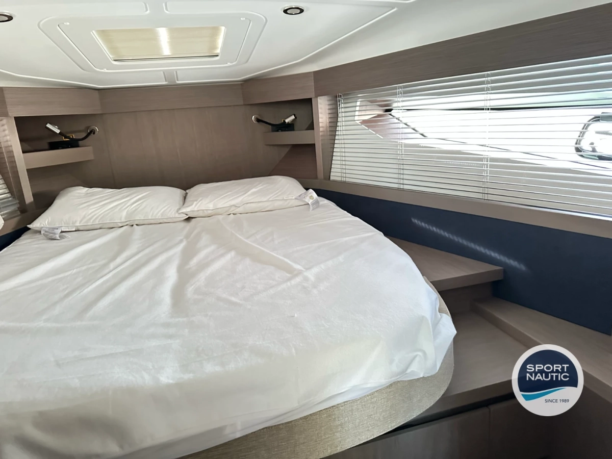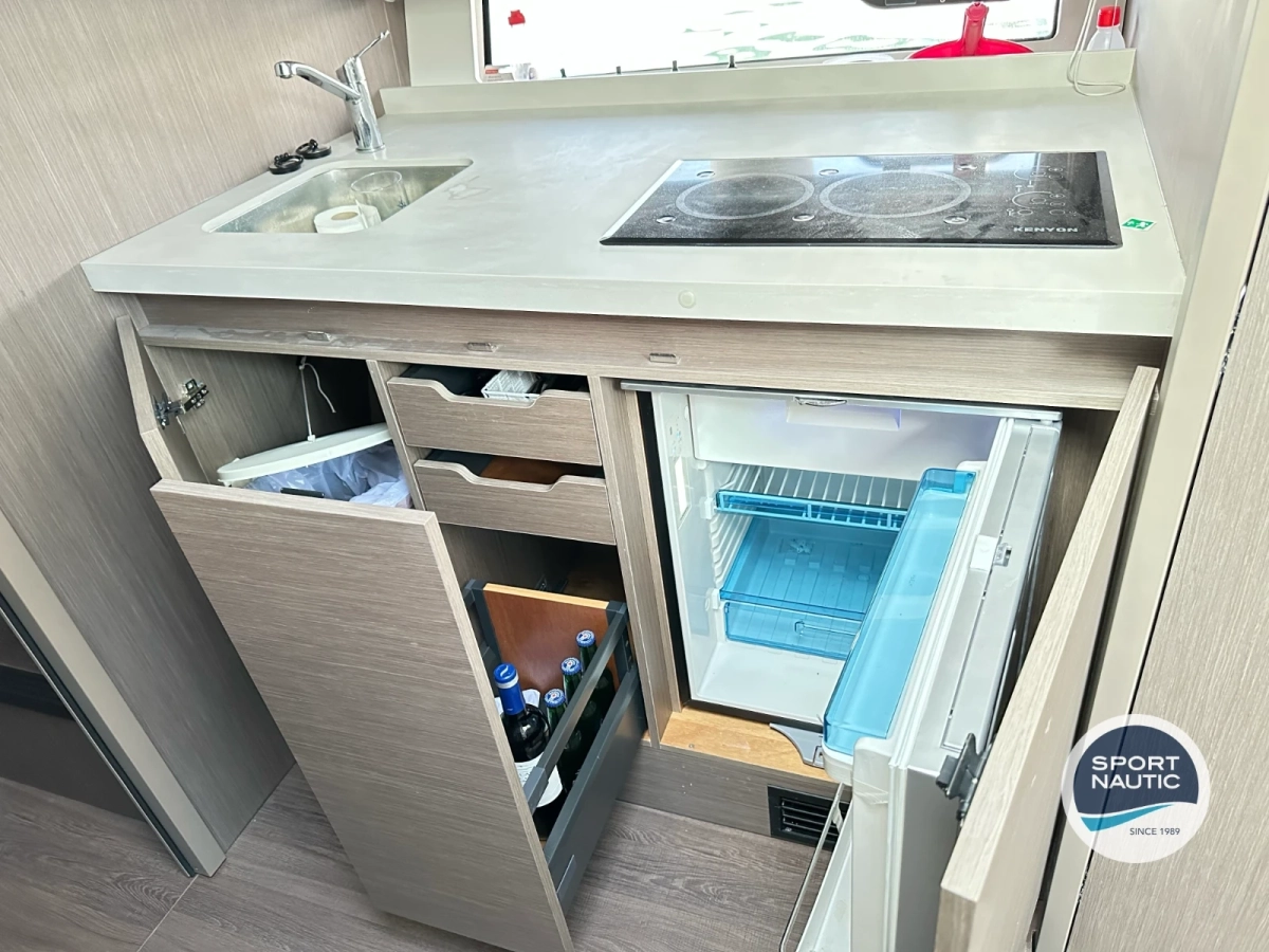 Disfruta de un espacio interior pensado para el máximo confort. La tapicería Pelican del salón aporta elegancia y confort, mientras que el salón convertible en litera ofrece versatilidad para alojamiento adicional. La cabina está equipada con climatización 230 V, horno microondas, placa vitrocerámica y TV remontado en camarote de proa, todo acompañado de persianas venecianas que aportan privacidad y un ambiente cálido.