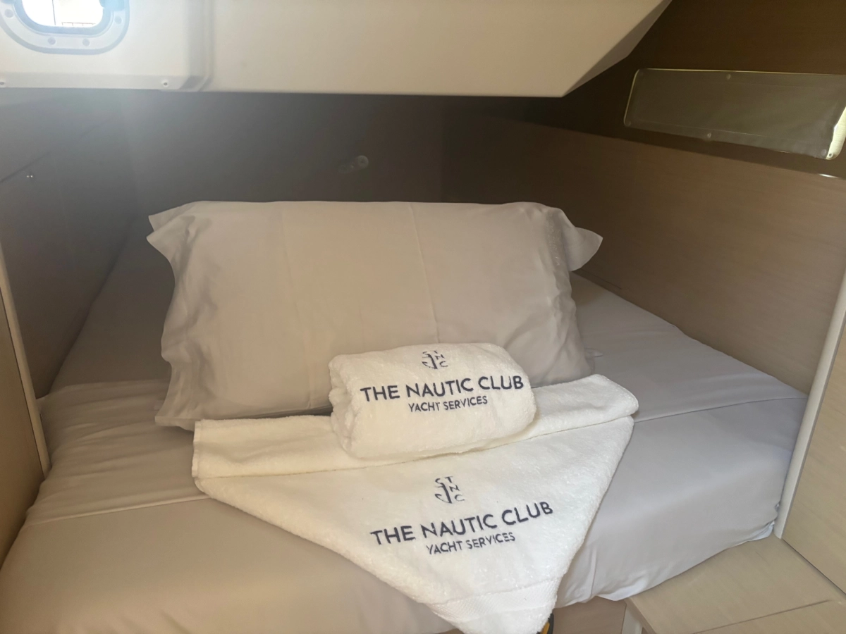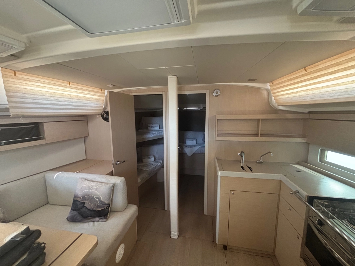 Con un ambiente de nogal o roble claro, el estilo del interior de los diseñadores italianos Nauta es notablemente brillante y destaca en la hábil disposición de los espacios habitables. Está disponible con dos, tres o cuatro cabinas y una cocina en forma de C a estribor, que ofrece mucho espacio de almacenamiento y una amplia superficie de trabajo. En el lado de babor, hay un gran salón con una mesa y un banco removible, y una mesa de cartas al pie de la escalera proporciona un amplio espacio de trabajo. Todo es modular, para que cada uno pueda vivir como quiera y disfrutar de la navegación dondequiera que el viento los lleve.