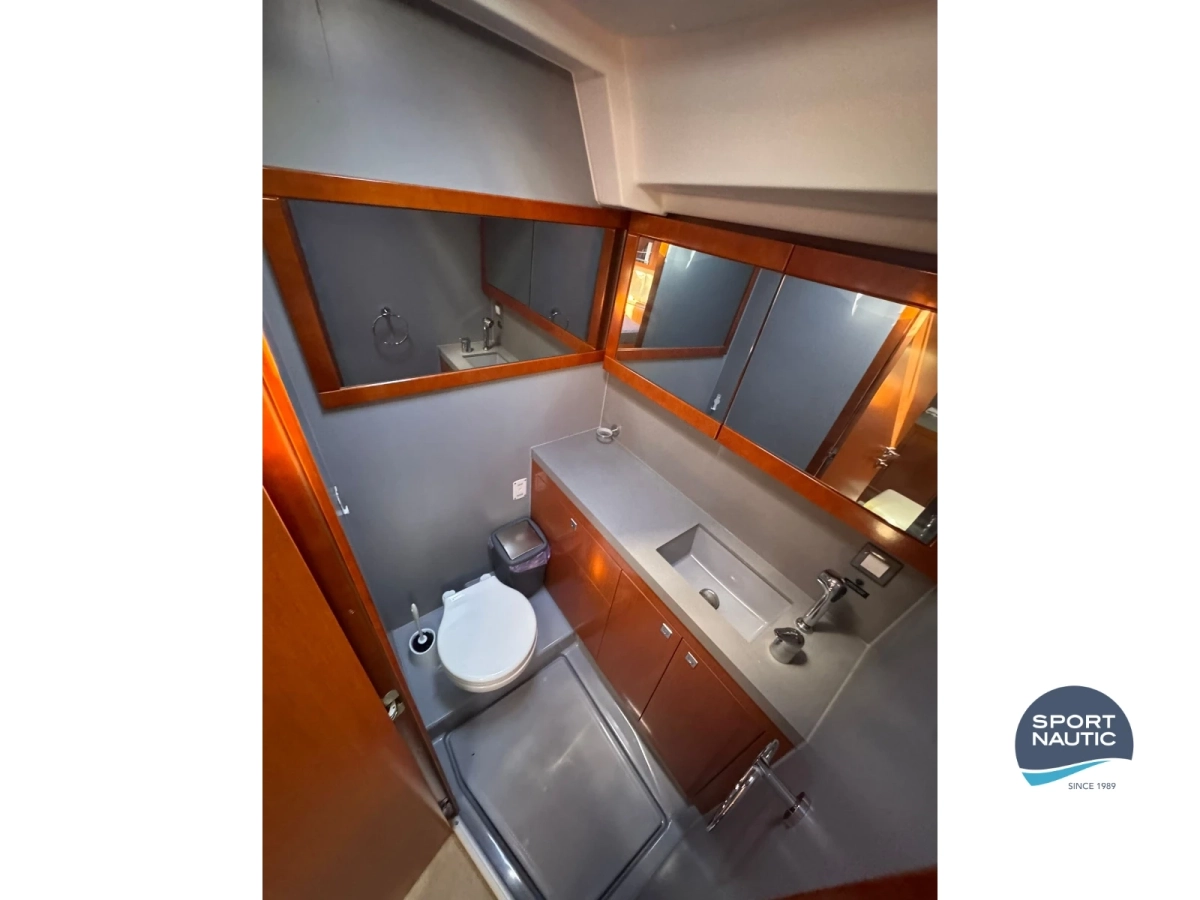 En cubierta, la bañera amplia con doble rueda de timón, mesa central y pasamanos en inox forrados en cuero ofrecen ergonomía y seguridad, mientras que los winches eléctricos, mástil enrollador con mayor en Mylar Taffetas y estay trinqueta largable garantizan un manejo sencillo incluso con poca tripulación.