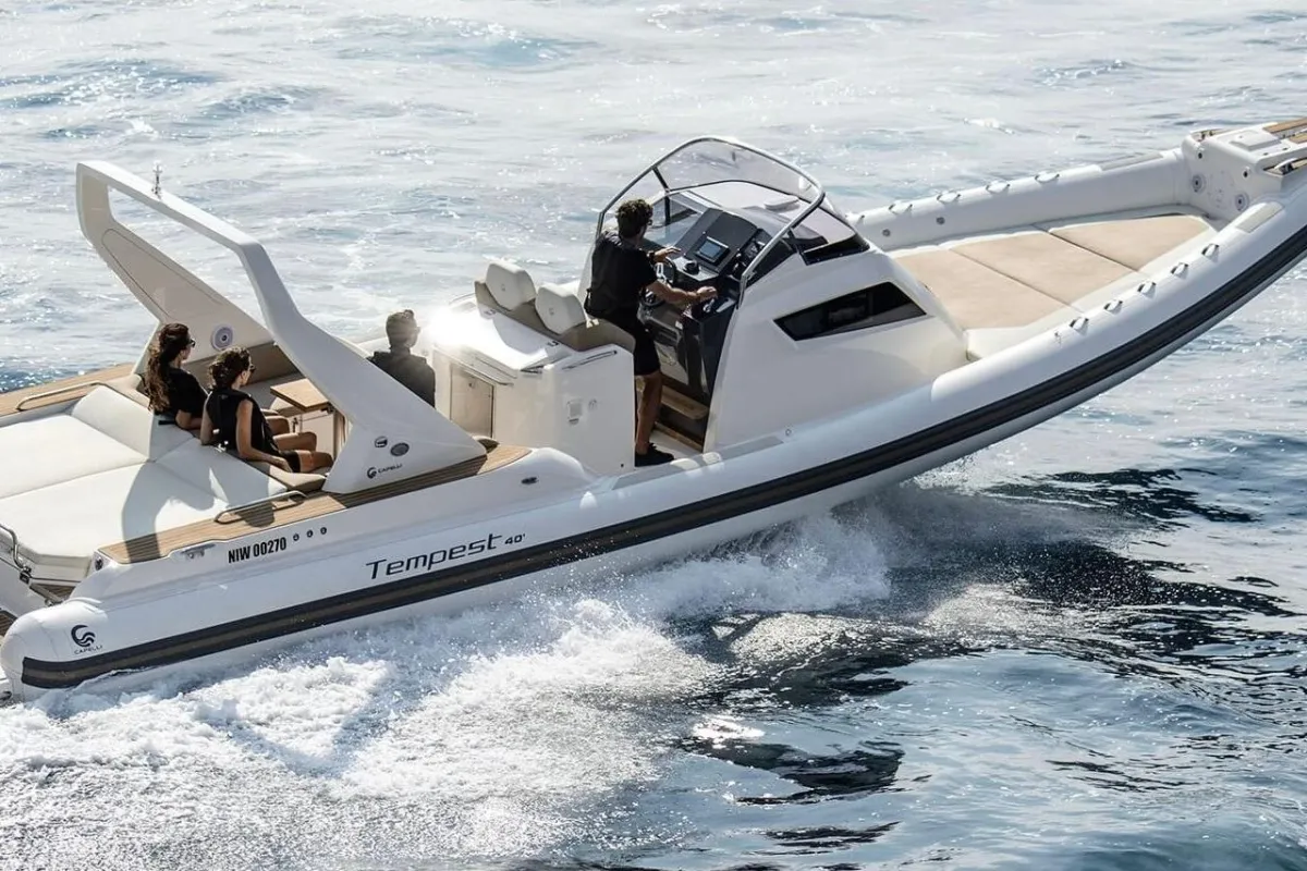 [ES] La Tempest 40 del astillero italiano Capelli, esta dentro del segmento de las grandes semirrígidas de lujo y forma parte de la gama denominada Luxury Line del Cantieri. Este es, sin duda, uno de los modelos referencia que destaca por su diseño, habitabilidad y dotes de navegación. Una unidad muy bien mantenida, con fundas de protección para toda la cubierta y flotadores. Muy pocas horas de funcionamiento y equipada con dos motores Suzuki de 350 Hp con doble hélice contra rotatoria, lo cual aumenta sus prestaciones. Son motores de cuatro tiempos de última generación, con 6 cilindros en V e inyección electrónica de combustible, proporcionando un bajo nivel de emisiones y ruido, así como un bajo consumo. La carena en forma de V es notable, tres redanes longitudinales por banda muy pronunciados, además de la sustentación adicional que supone el flotador, goza de una navegación muy confortable a todos los regímenes al mismo tiempo que ofrece unas excelentes prestaciones, con un comportamiento ágil y deportivo. Su velocidad de crucero se puede situar en torno a los 27 nudos a 4.000 rpm. La velocidad máxima supera los 40 nudos con un consumo de aproximadamente los 220 litros/hora. Los 650 litros de capacidad del depósito de combustible ofrecen una autonomía a a régimen máximo de de unas 115 millas.