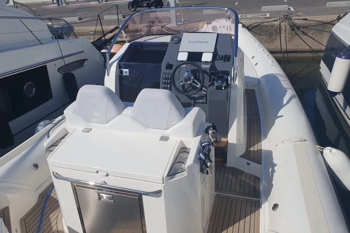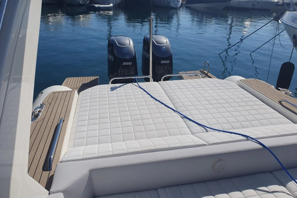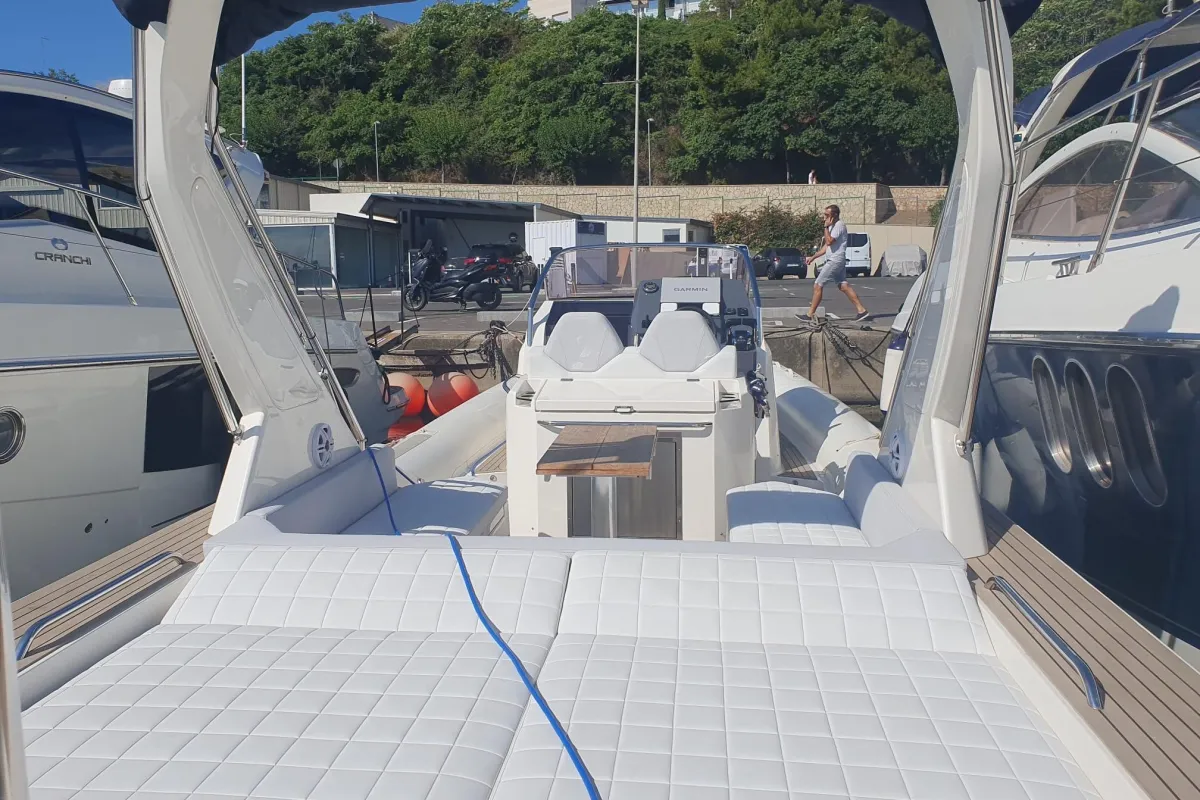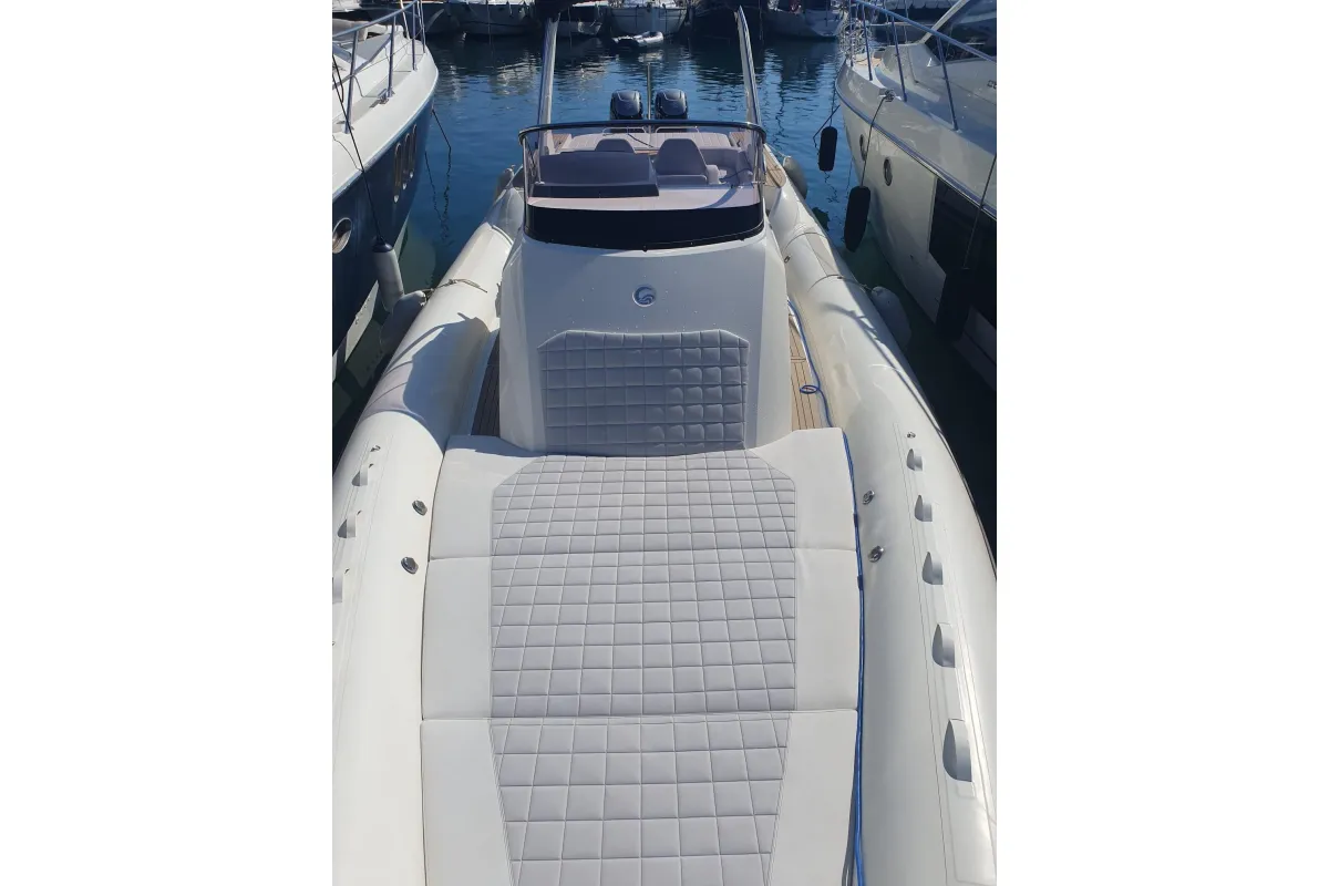 [EN] The Tempest 40, from the Italian shipyard Capelli, belongs to the large luxury RIB segment and is part of the Cantieri's Luxury Line range. This is undoubtedly one of the benchmark models, distinguished by its design, spaciousness, and handling. This particular boat is very well maintained, with protective covers for the entire deck and tubes. It has very few operating hours and is equipped with two 350 hp Suzuki engines with twin counter-rotating propellers, which enhances its performance. These are state-of-the-art, four-stroke, V6 engines with electronic fuel injection, providing low emissions and noise levels, as well as low fuel consumption. The V-shaped hull is remarkable, with three pronounced longitudinal bulges per side. In addition to the extra lift provided by the tubes, this design ensures a very comfortable ride at all engine speeds while offering excellent performance, with agile and sporty handling. Its cruising speed can reach around 27 knots at 4,000 rpm. The maximum speed exceeds 40 knots with a fuel consumption of approximately 220 liters per hour. The 650-liter fuel tank provides a range of about 115 nautical miles at maximum speed.