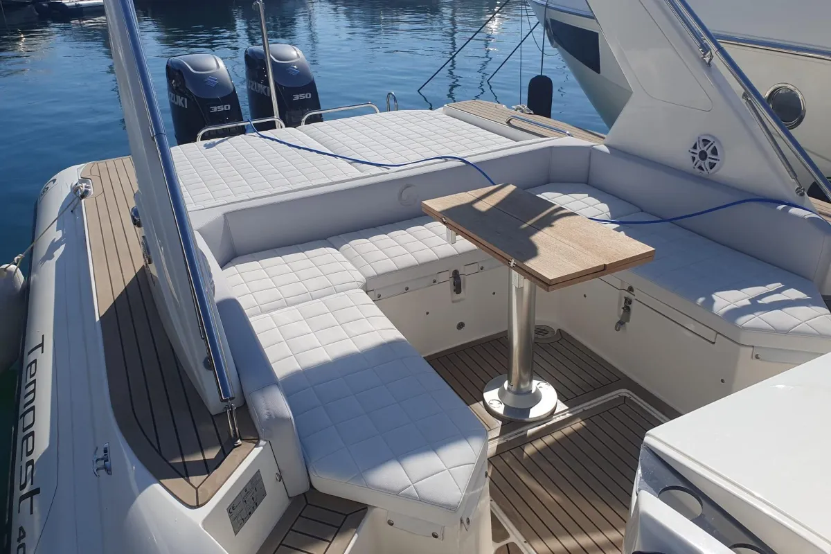 La configuración de la cubierta de la Tempest 40’ es la propia de este tipo de barcos, pero con una bañera enorme que multiplica sus posibilidades. Su homologación permite acoger hasta 18 pasajeros. Mueble bar con un frigorífico de 65 litros, bajo tapa, con fregadero y superficie de trabajo. Interior sobrio y confortable, con sofá convertible en cama doble en proa, mueble lateral, cabina de aseo independiente y espacio de estiba. Una embarcación funcional, deportiva y elegante ideal para el crucero diurno con buena habitabilidad y unas excelentes prestaciones en navegación que permiten realizar incluso travesías de más de una jornada.