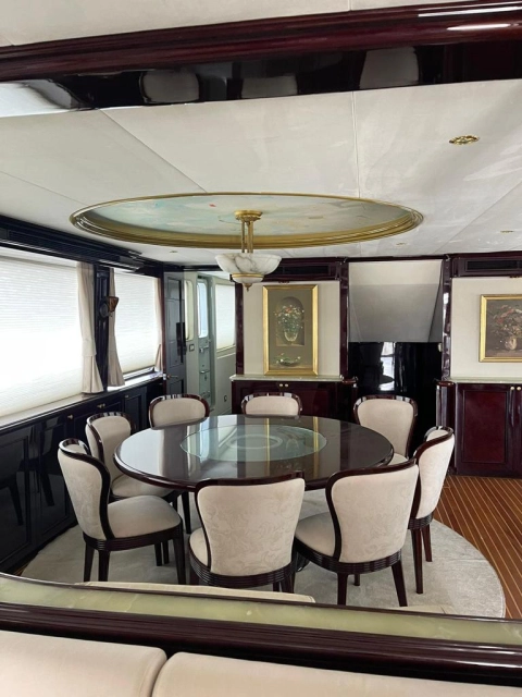 - El comedor cuenta con una mesa de madera circular y asientos para 8 con un elaborado fresco pintado a mano. Puede acomodar cómodamente hasta 8 huéspedes, con 4 cabinas aireadas y espaciosas, todas con baño/ducha en suite.