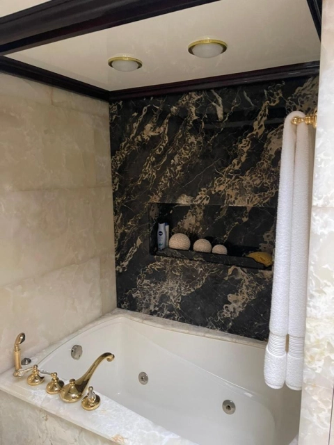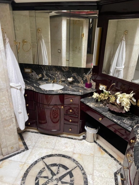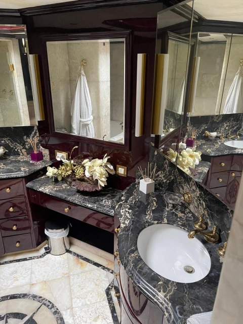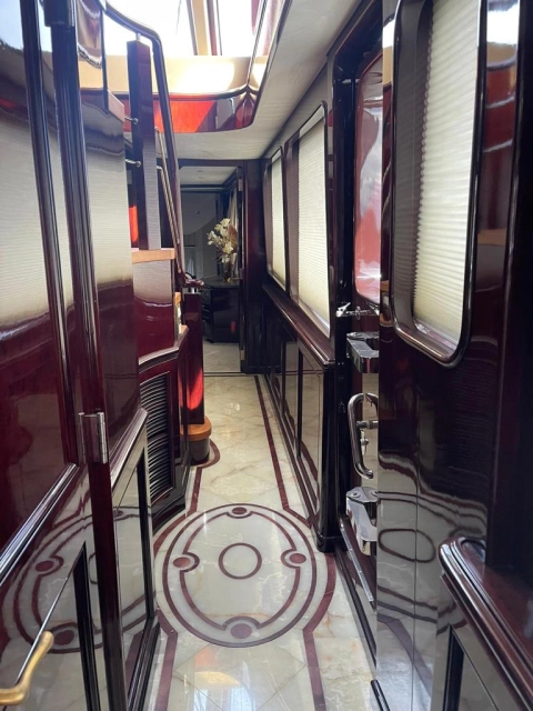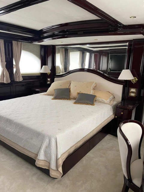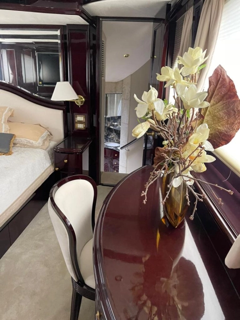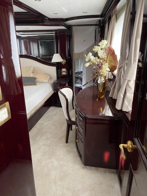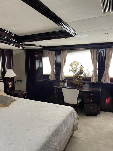 - El camarote principal está ubicado en la cubierta principal con vista de ventana a ambos lados, mientras que una cabina VIP de manga completa está en la cubierta inferior. Los camarotes Master y VIP cuentan con una bañera adicional, con jacuzzi incorporado.