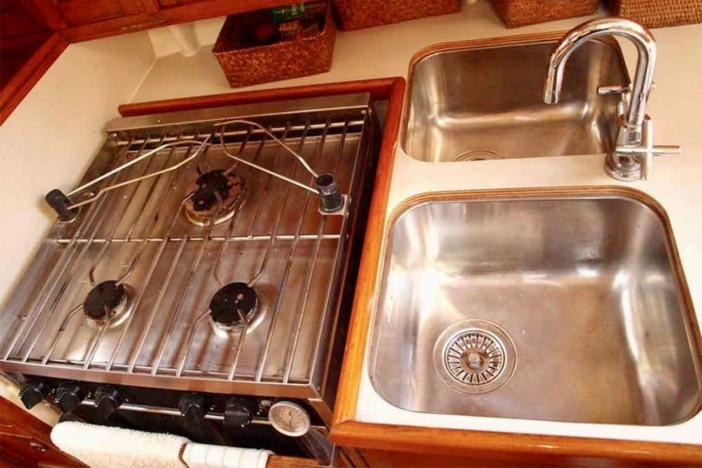 El interior cuenta con carpintería fina, estanterías empotradas y acabados de calidad, ventilado por cinco ventiladores Dorade, garantizando un ambiente fresco y confortable. Capacidad para hasta 6 personas, ideal para largas travesías o estancias a bordo.