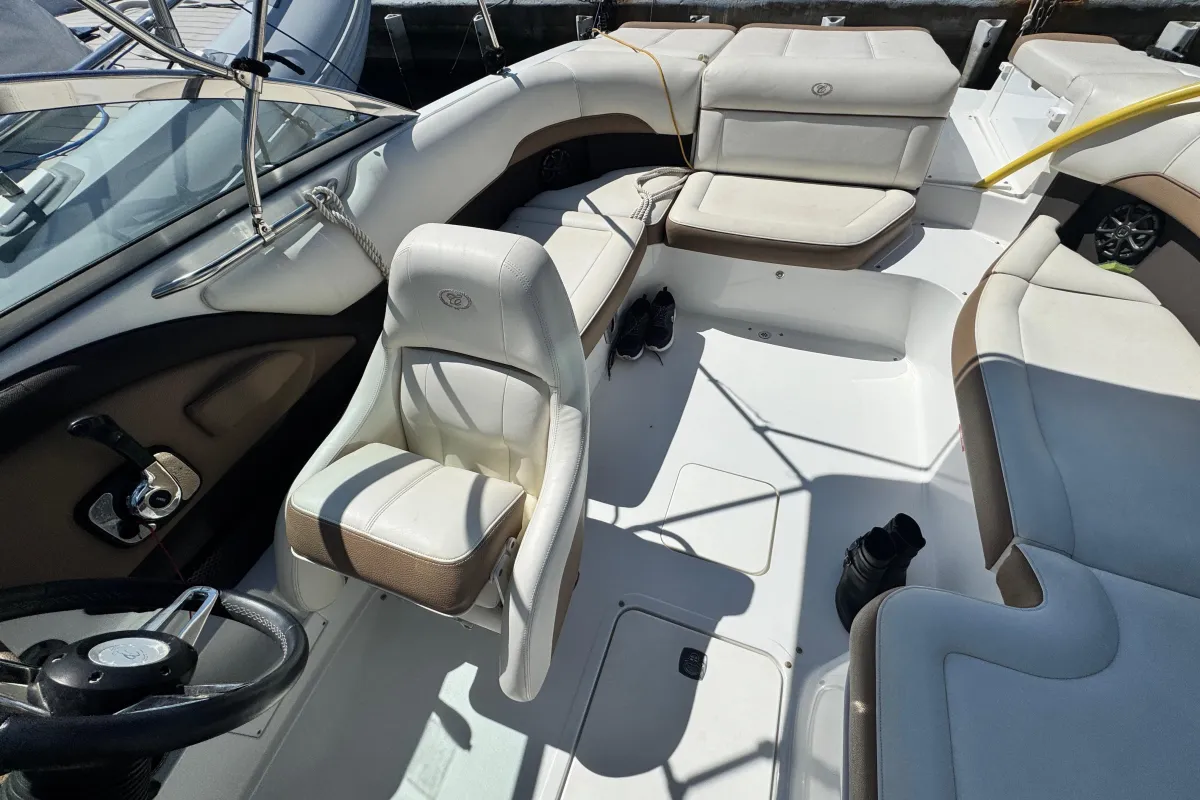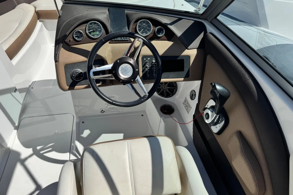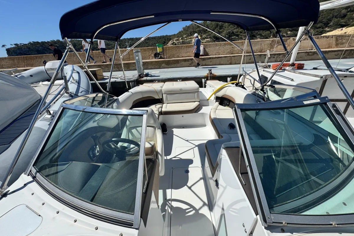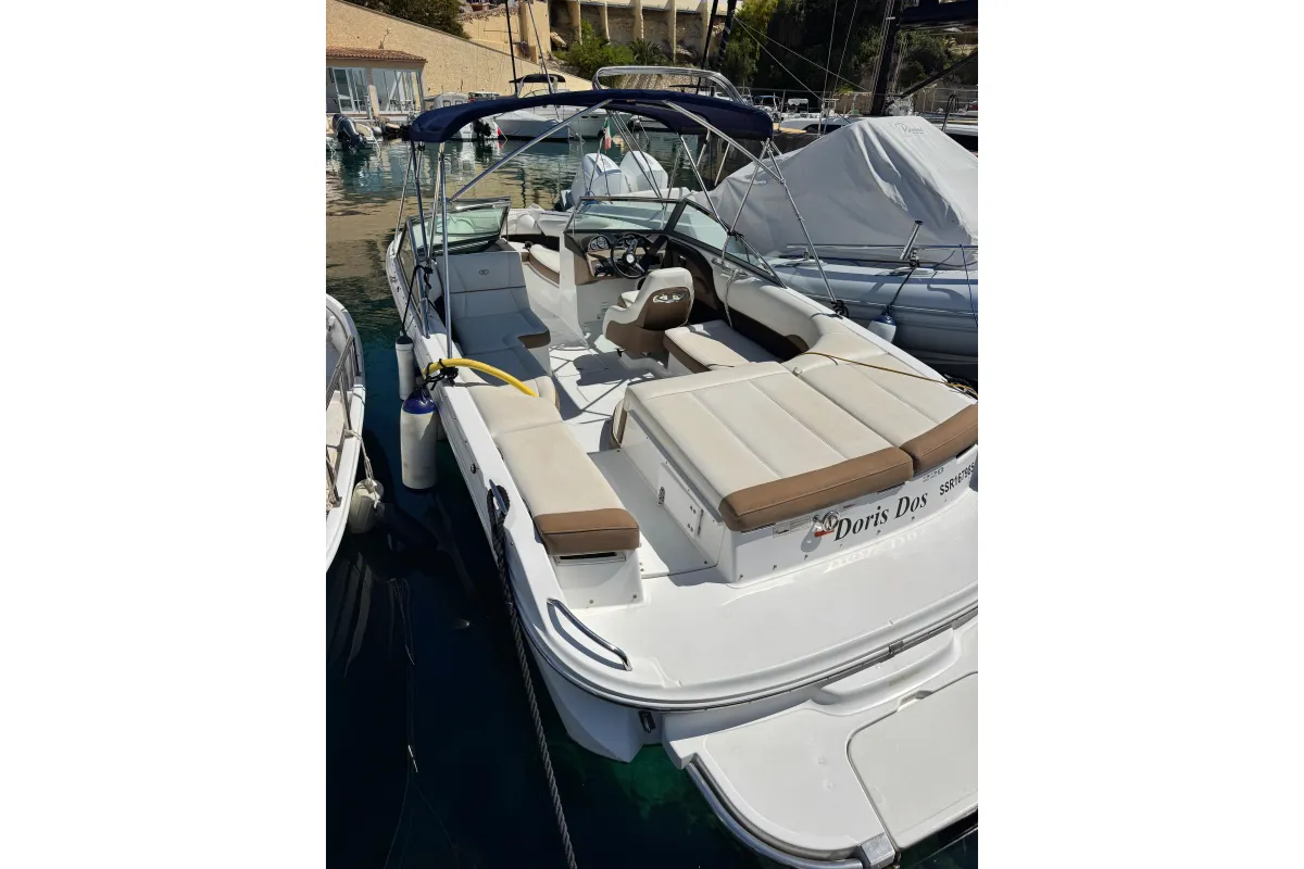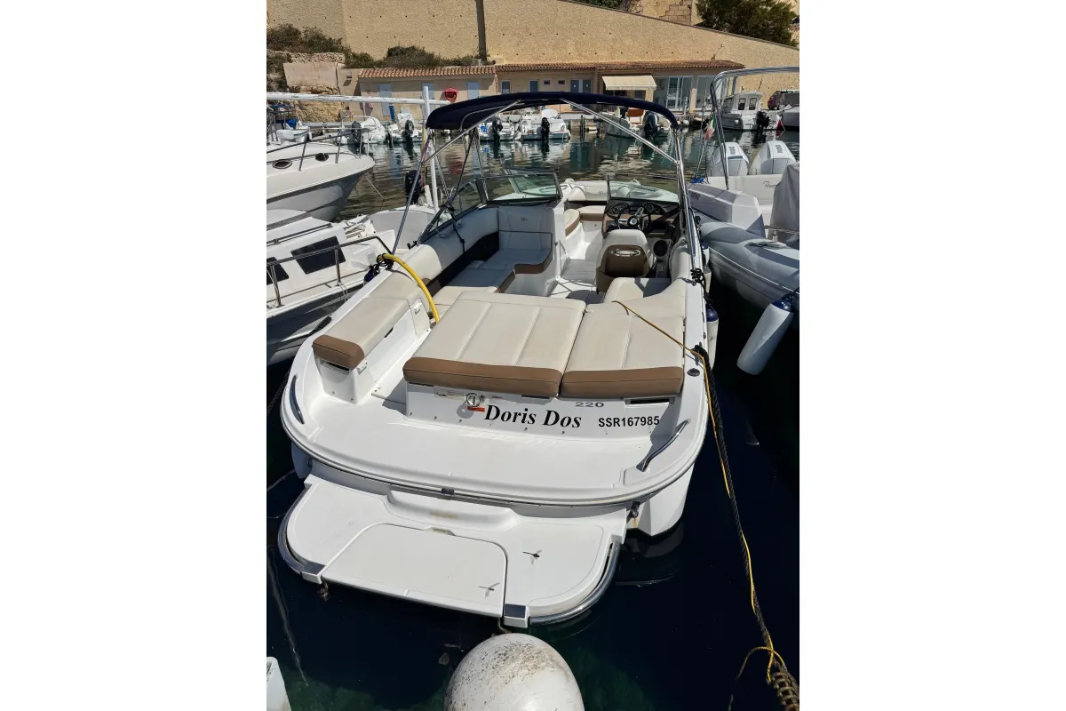 A Cobalt sports boat fully deserves its reputation as the best of the American bowriders. The 220 makes idealized use of every square inch of its wide and sturdy stance, the stadium seating key to the easy accommodation of a dozen guests and their gear. And the swim step, of course, Cobalt's game-changing, patented contribution to safety, convenience, and accessibility makes boarding a breeze. by the way – an addition that makes your boat as athletic as it is roomy. This example was made for the Mediterranean and features Cobalt's anti corrosion system, bimini top, aft sundpad with adjustable backrest and walk through filler, wood das trim, full cover set and blue hull. Kept indoors in winter and lightly used from her berth in Portals Vells, Mallorca.
