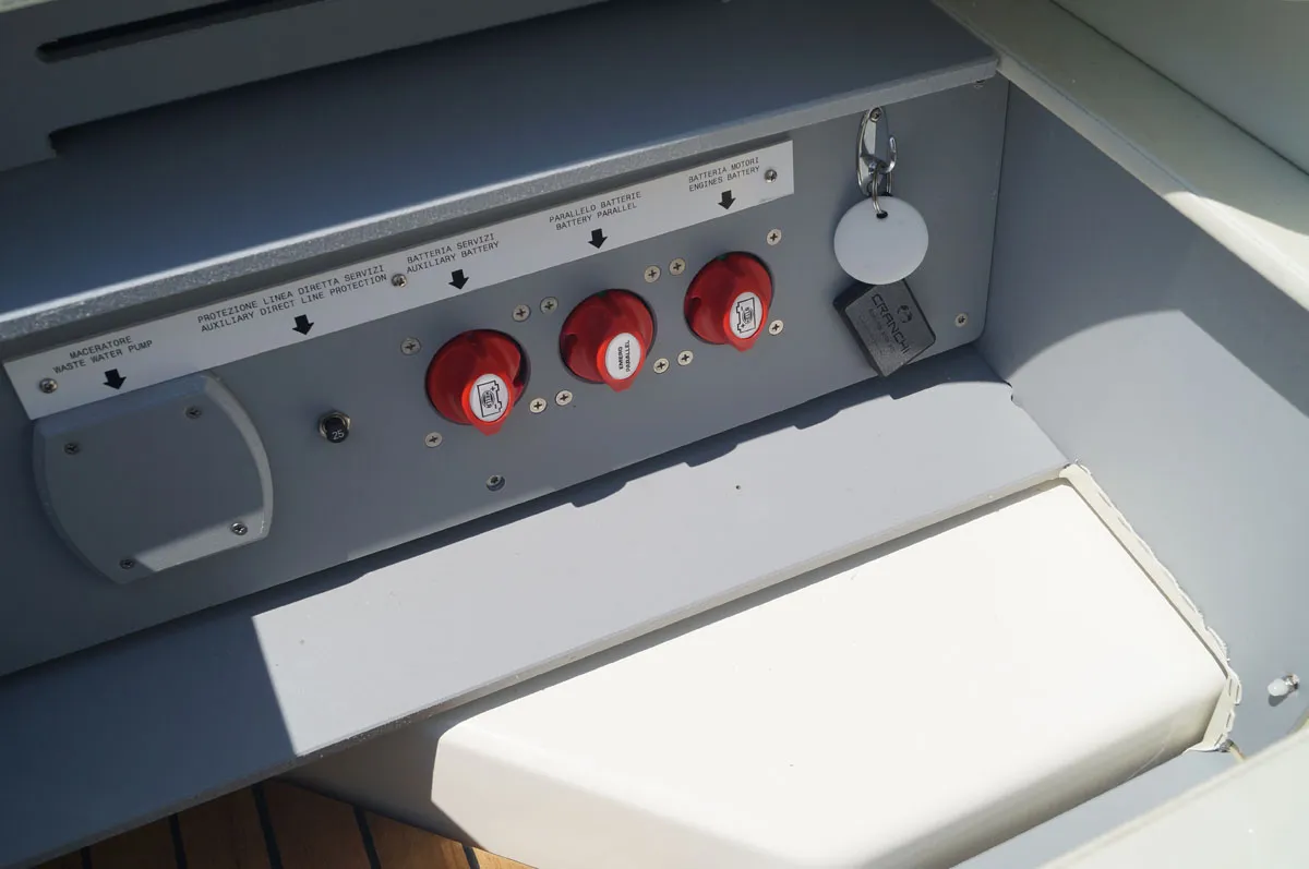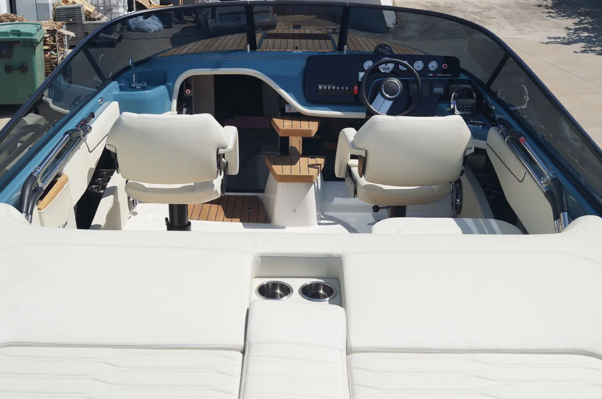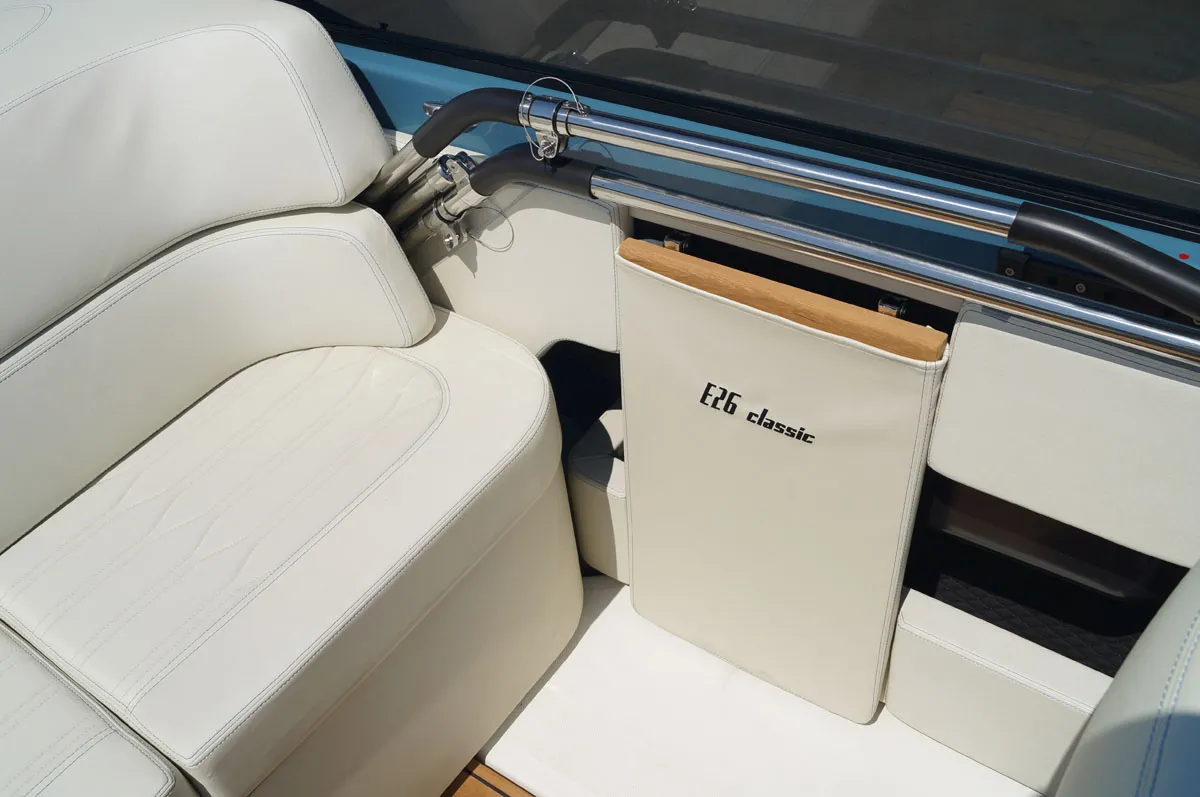 Embarcación nueva en stock. Disponible en enero 2026. Fotos de archivo, los colores y el equipamiento pueden no corresponder exactamente a la unidad ofrecida. Modelo E 26 Classic del astillero italiano Cranchi de 7,85 metros de eslora total. Barco con cómoda plataforma de baño, distribución espaciosa, cabinada y solárium popa.