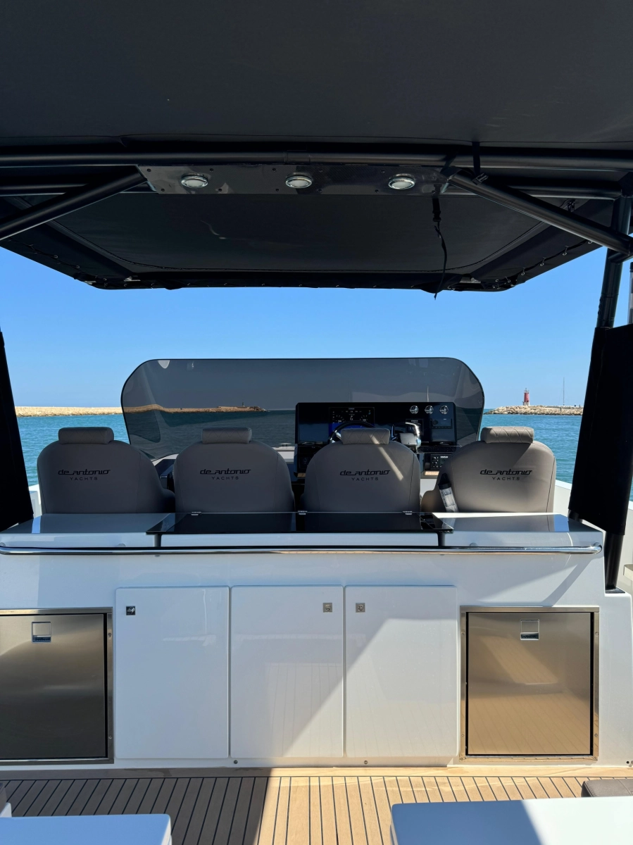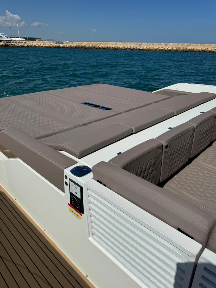 En cubierta hay un Wet-Bar, neveras, cocina y estanterías para almacenaje. Hay una gran mesa de comedor con una sofá fijo y 2 bancos móviles. Solárium en popa y otro en proa. Cuenta con un garaje para guardar un tender y su motor eléctrico, o sino almacenamiento.