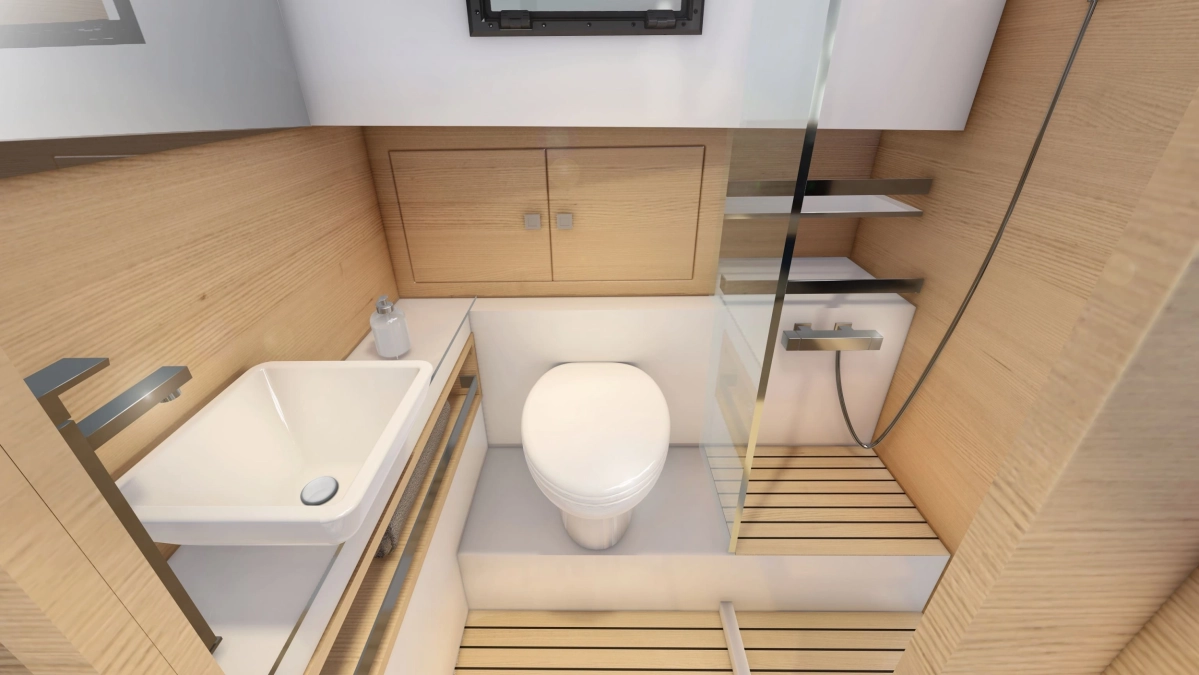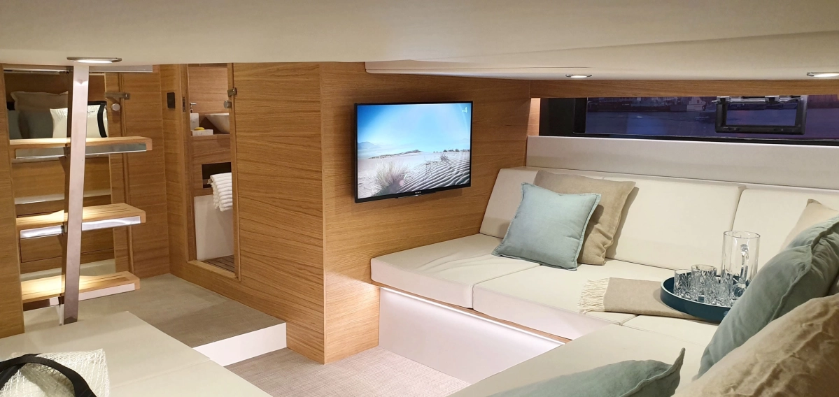 El barco dispone de un camarote con cama de matrimonio y un salón con 3 grandes sofás en forma de U para que 2 adultos o 3 niños duerman cómodamente. El baño es amplio y completo.