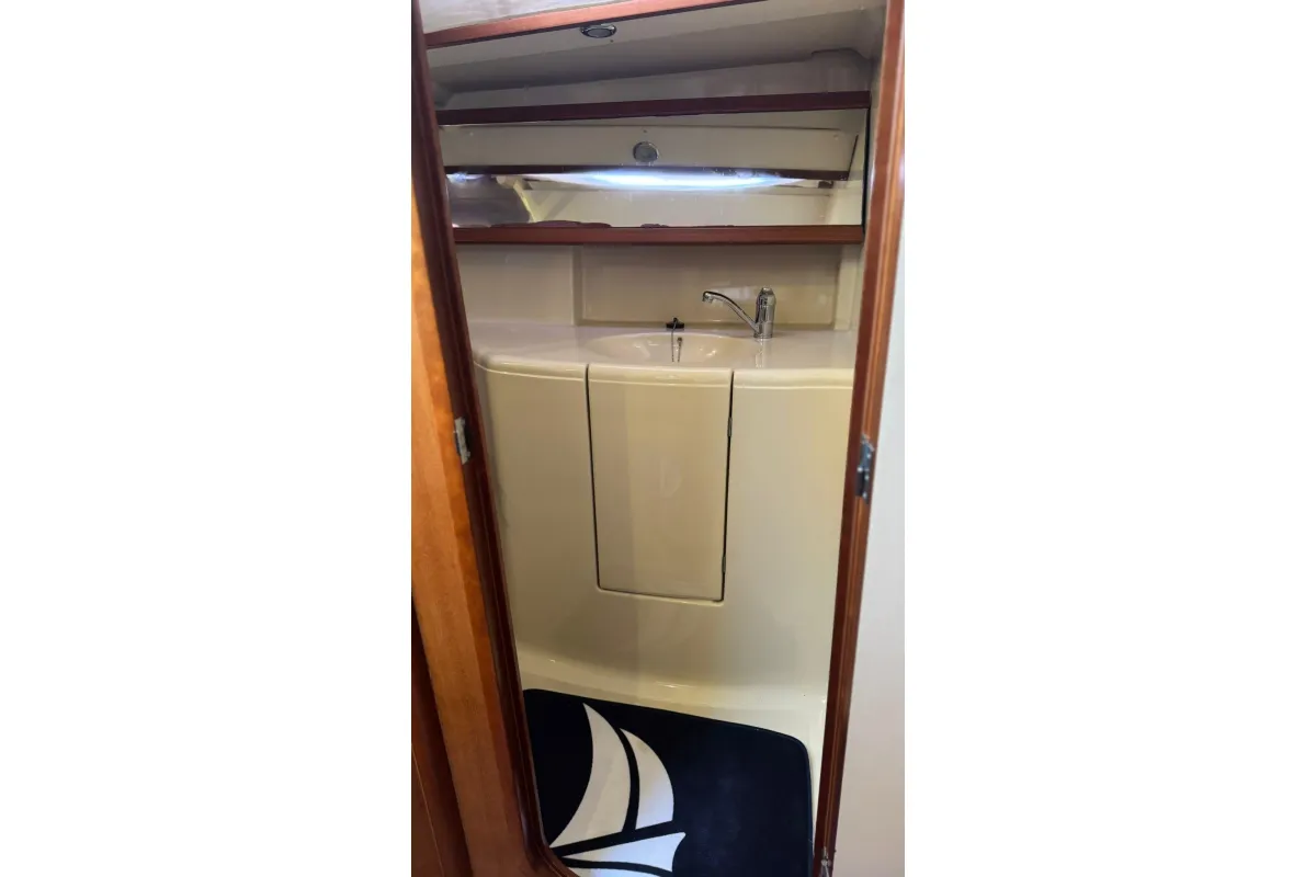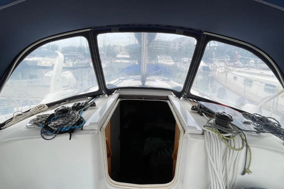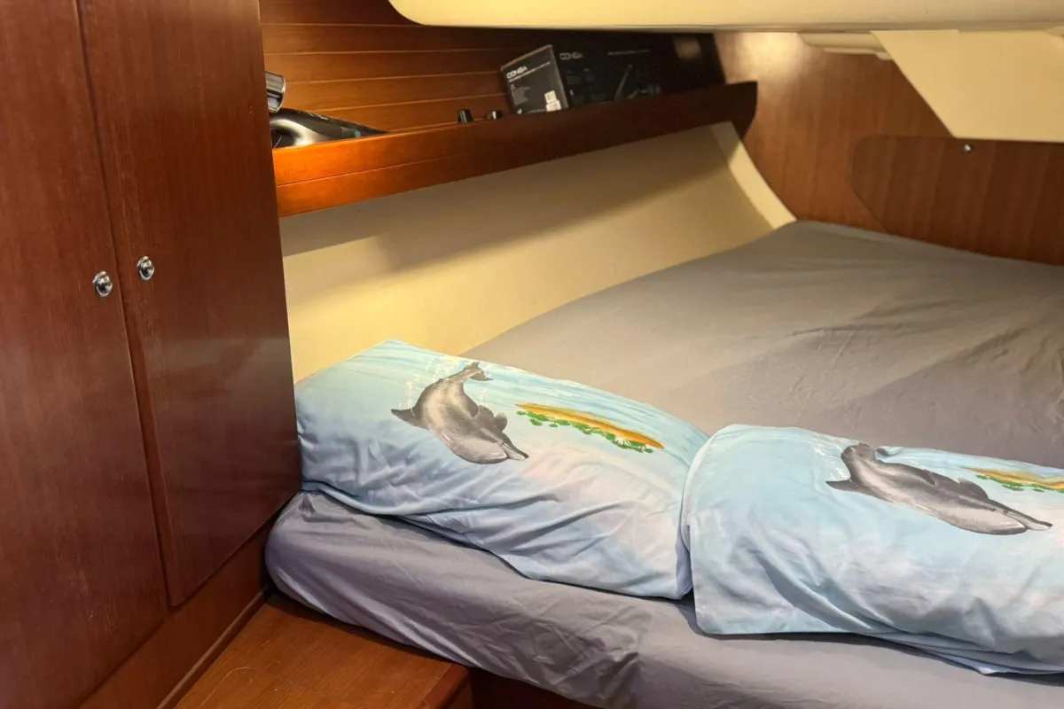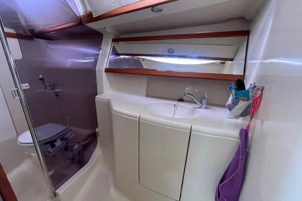 Below deck, the Dufour 385 impresses with its elegant wood finish, abundant natural light, and smart interior layout. Available in two- or three-cabin versions, this unit two cabin ,it features generous living spaces: a cozy main saloon, a fully equipped L-shaped galley, and one or two bathrooms offering all the necessary comfort. Every detail has been carefully designed to deliver well-being and functionality at sea.