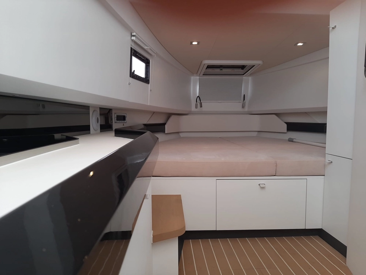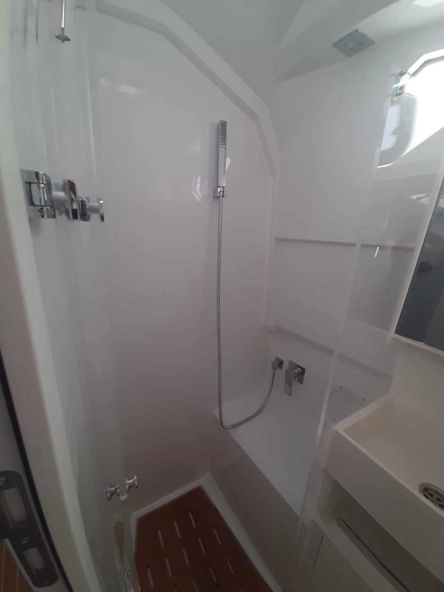 Calentador, 5 Enchufes de 220v (Sockets in cabin (3), toilet (1), storage room (1)), Suelo interior de madera (synthetic teak, colour: classic teak white), Tanque de agua negra (60 l), 3 Tomas de 12v ((2) cabin and (1) in steering console), WC marino eléctrico