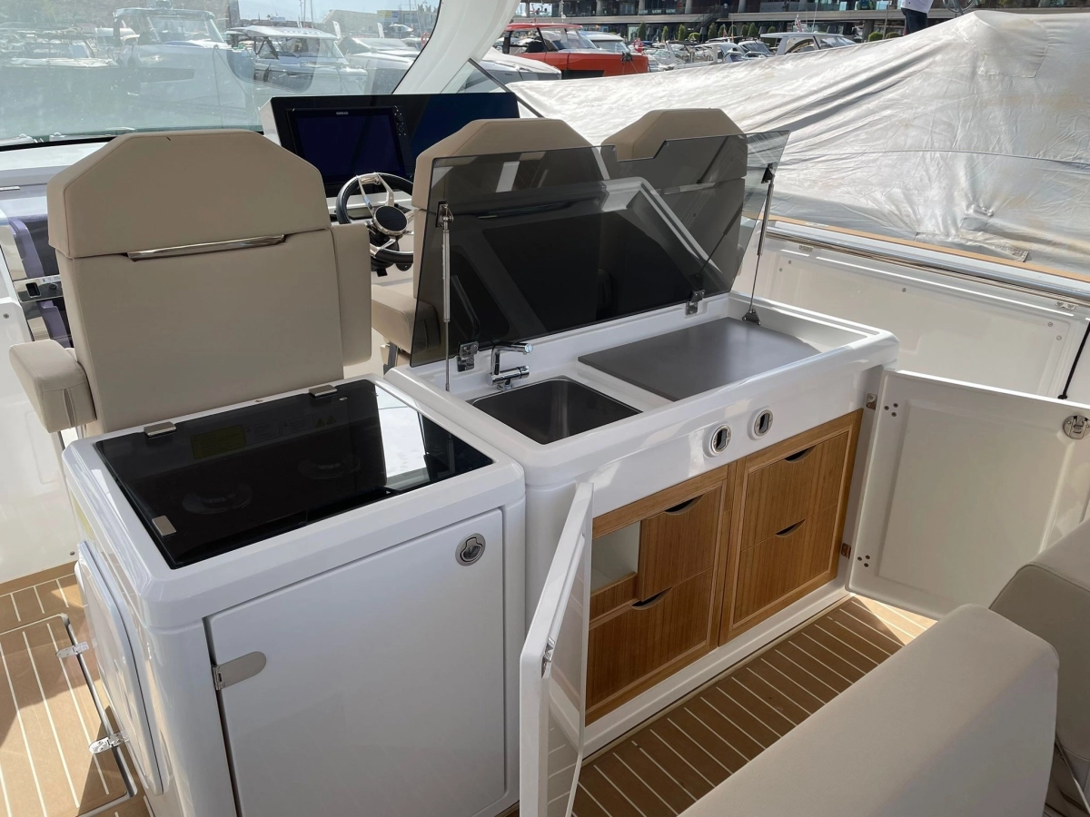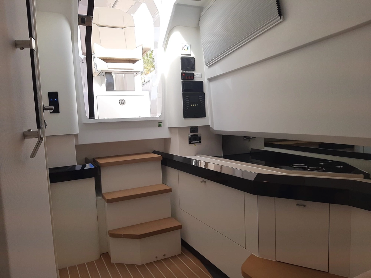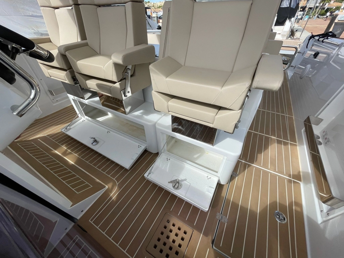 Alarma motor, Alarma sentina, Alternador, Ancla (SS 15 kg and 50 m stainless steel chain), Auto-Trim (Active trim system), 3 Baterías (160 Ah AGM), Bocina, 2 Bomba de achique automática, 2 Bomba de achique eléctrica, Bomba de achique manual, Bomba de agua dulce, Cargador de batería, Cubierta de teca (synthetic classic teak white), Ducha externa, Escalera de baño, Garaje para auxiliar (with electric opening under rear sunpad), Guardamancebos con entradas (aft), Hélice de proa, Ibornales, Lavabo en la cabina, Luces de cortesía (Indirect light (RGBW) under and behind bedhead, under the bedfront, beside the bed and in the toilet), 2 mesa de bañera (foldable made in teak on fixed pedestal), Molinete eléctrico, Paneles solares, 2 Plataforma (side platforms), Puerta de entrada (Sliding), Sistema de extinción, 6 Tacos plegables, Toma de 220V para el puerto, T-Top (XL T-Top and pillar in fiberglass with spot and indirect light)