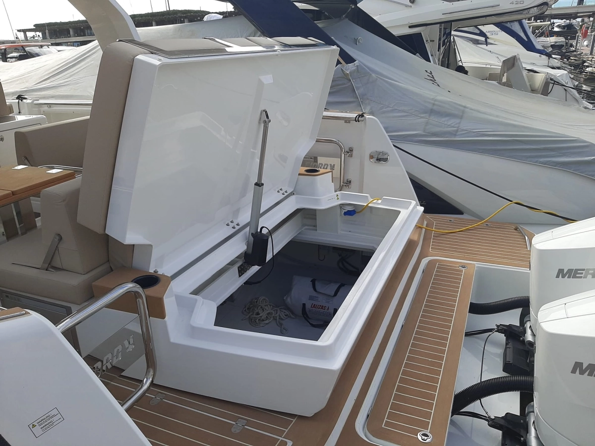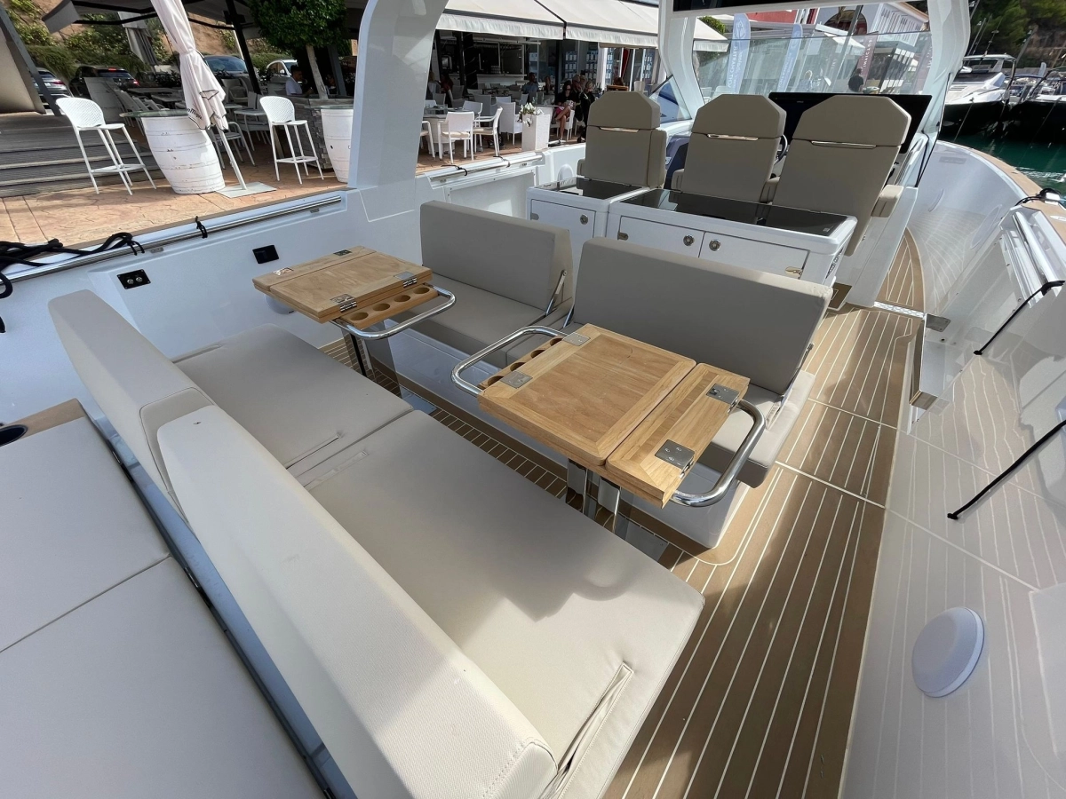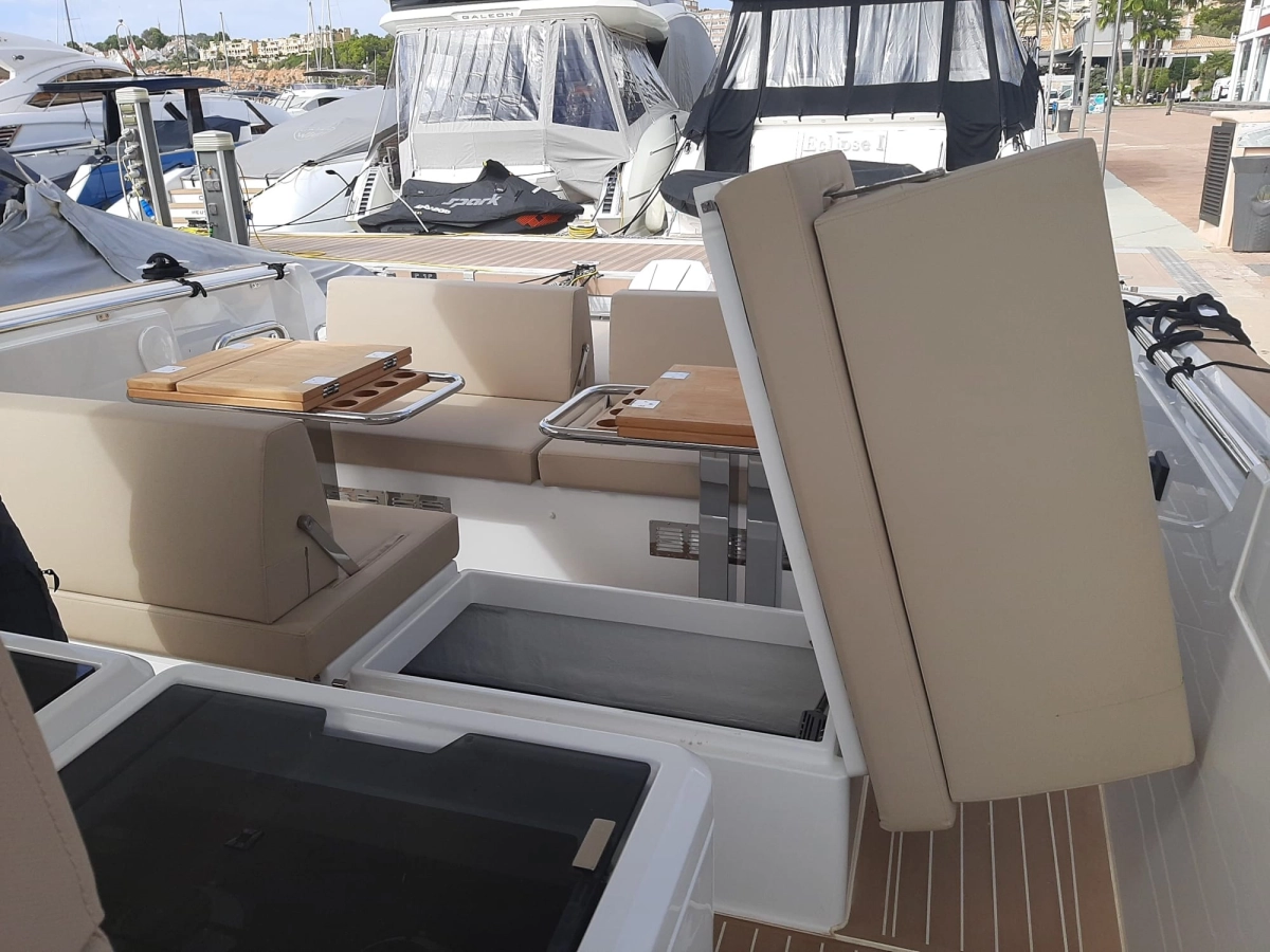 Alarma motor, Alarma sentina, Alternador, Ancla (SS 15 kg and 50 m stainless steel chain), Auto-Trim (Active trim system), 3 Baterías (160 Ah AGM), Bocina, 2 Bomba de achique automática, 2 Bomba de achique eléctrica, Bomba de achique manual, Bomba de agua dulce, Cargador de batería, Cubierta de teca (synthetic classic teak white), Ducha externa, Escalera de baño, Garaje para auxiliar (with electric opening under rear sunpad), Guardamancebos con entradas (aft), Hélice de proa, Ibornales, Lavabo en la cabina, Luces de cortesía (Indirect light (RGBW) under and behind bedhead, under the bedfront, beside the bed and in the toilet), 2 mesa de bañera (foldable made in teak on fixed pedestal), Molinete eléctrico, Paneles solares, 2 Plataforma (side platforms), Puerta de entrada (Sliding), Sistema de extinción, 6 Tacos plegables, Toma de 220V para el puerto, T-Top (XL T-Top and pillar in fiberglass with spot and indirect light)