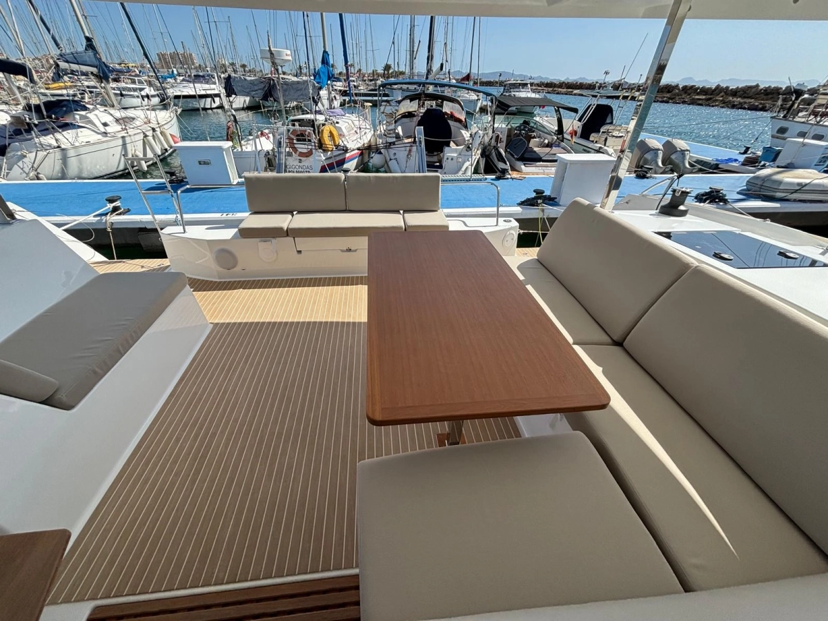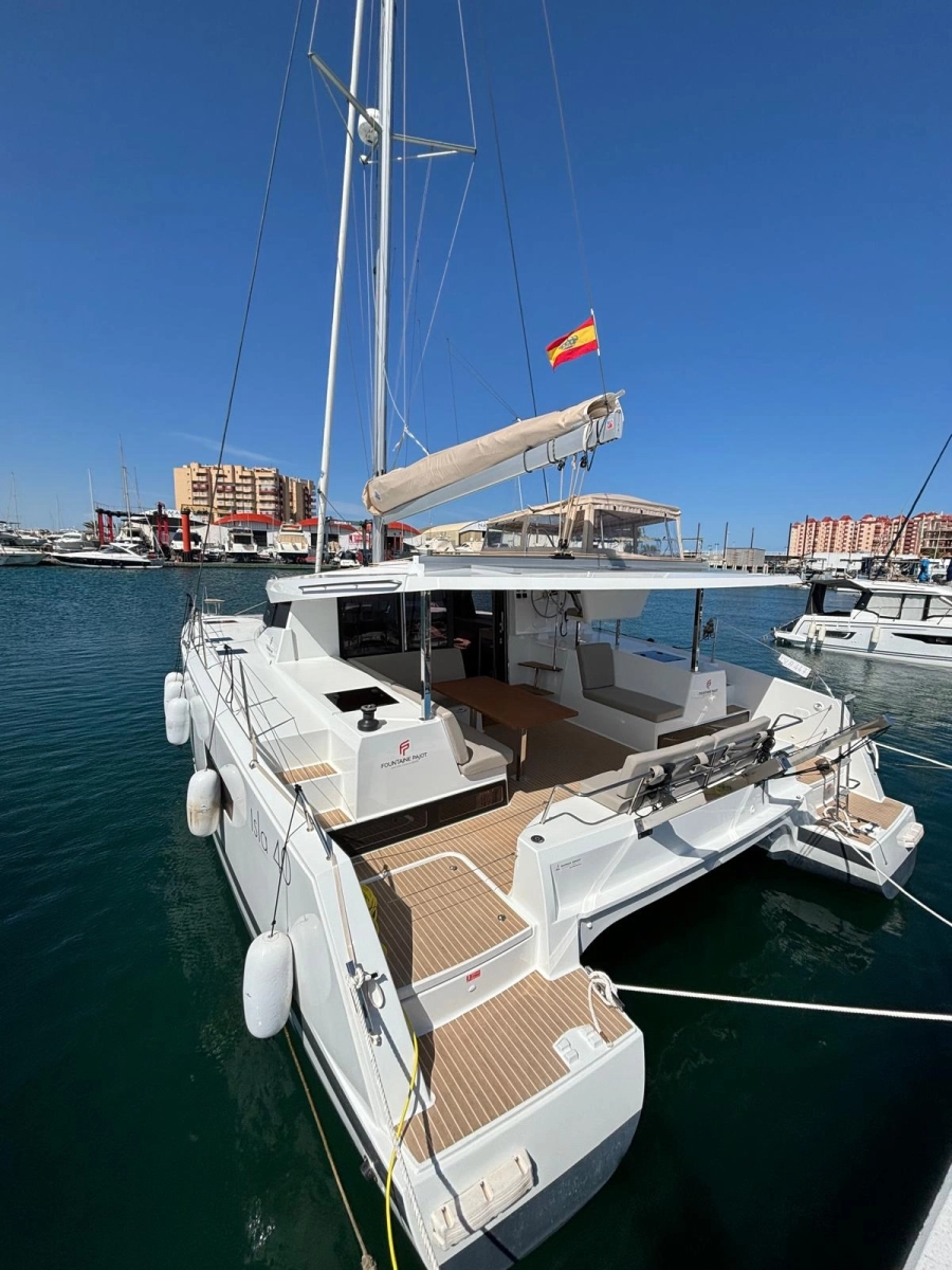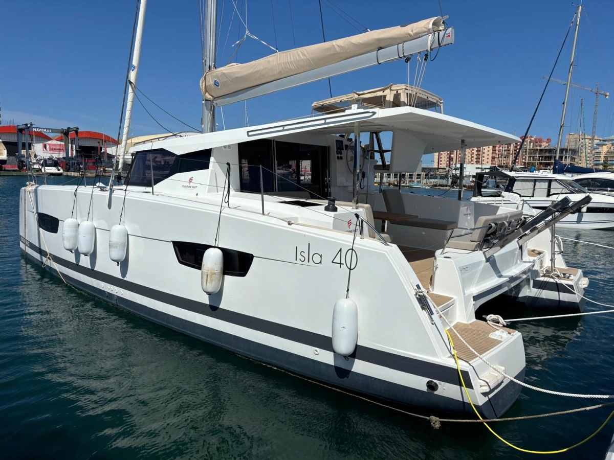 Embarcación Fountaine Pajot Modelo Isla 40 con dos motores Volvo Penta D1-20, con 3 camarotes y 3 baños. Versión Confort: Cortinas en los camarotes, kit de amarre + 6 defensas, vela mayor con sables, Lazy Jack, Molinete eléctrico (1.000W), antena VHF en mástil, doble embrague para tomas de corriente interior de 12V y tomas de corriente exterior impermeable de 12V, ducha en cubierta con agua caliente, interruptor automático para bombas de achique, Lazy bag, funda para rueda de timón, winche eléctrico para mayor, luces de cortesía interior, sistema de agua de mar presurizada, paquete de audio Fusión, Red principal a 220V, inversor 2000W, paquete video TV/HIFI, antena de TV, upgrade Bose, cojines exteriores, bomba de agua dulce eléctrica, iluminación de cortesía en bañera EQUIPAMIENTO EXTERIOR: Bimini para puesto de mando, cierre camper para puesto de mando, cojines de proa para exterior, tira protectora en ambos espejos de popa, 2 asientos em proa, teca sintética en bañera y plataformas de popa, cornamusa de amarre adicionales. EQUIPAMIENTO INTERIOR: Cortinas en salón, mesa de salón convertible en cama. Nevera 12V de 63Lt, horno de gas, 6 x ventiladores de 12v. 2 tomas de corriente adicionales de 12V, paneles solares 3x90/100W. ELECTRONICA: Paquete de electrónica GARMIN 3 Smart Cruising equipado con: Piloto automático, VHF, AIS, 2xGPS8412/8410, 2x multi GMI20. Segundo puesto de mando VHF con AIS y radar con soporte NAVEGACION: Gancho automático de vela mayor, bauprés y equipo de gennaker, contador de cadena, antifouling