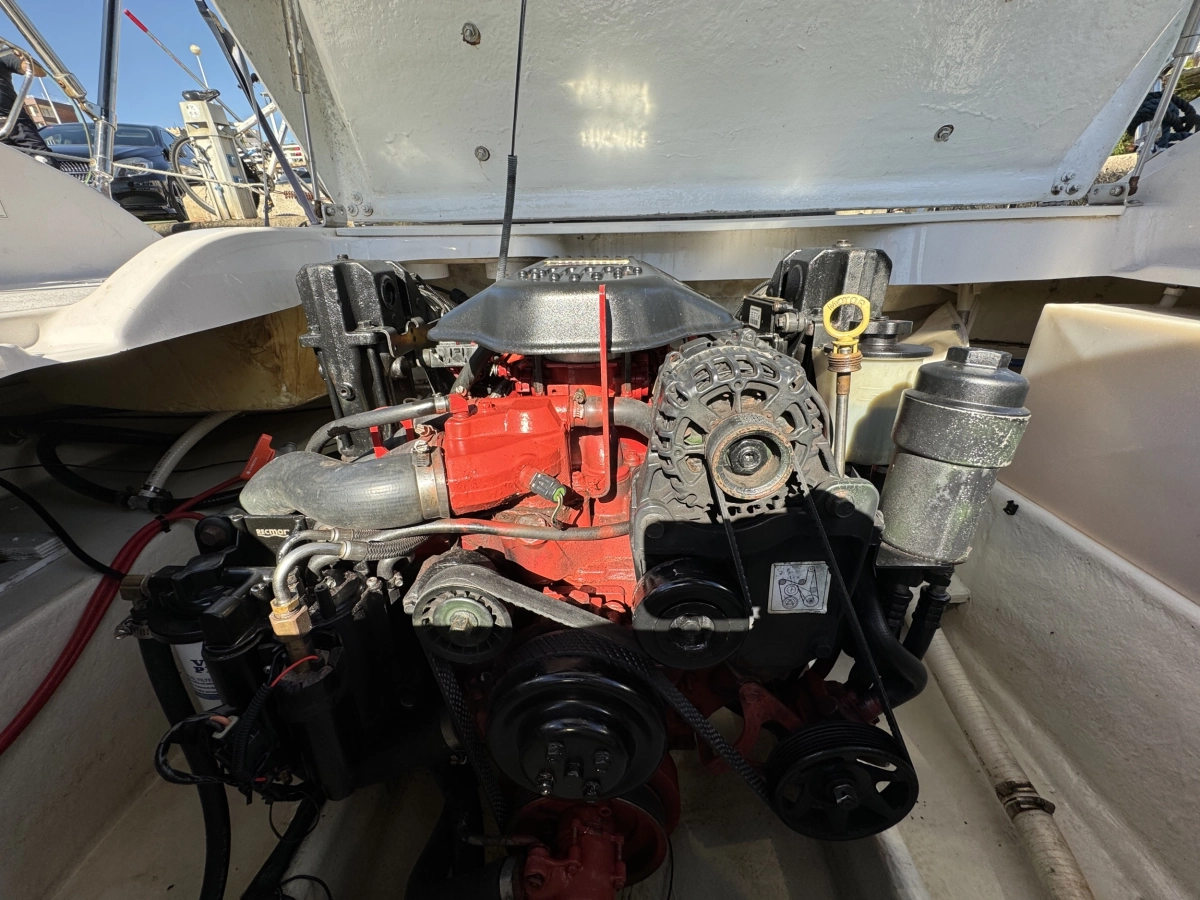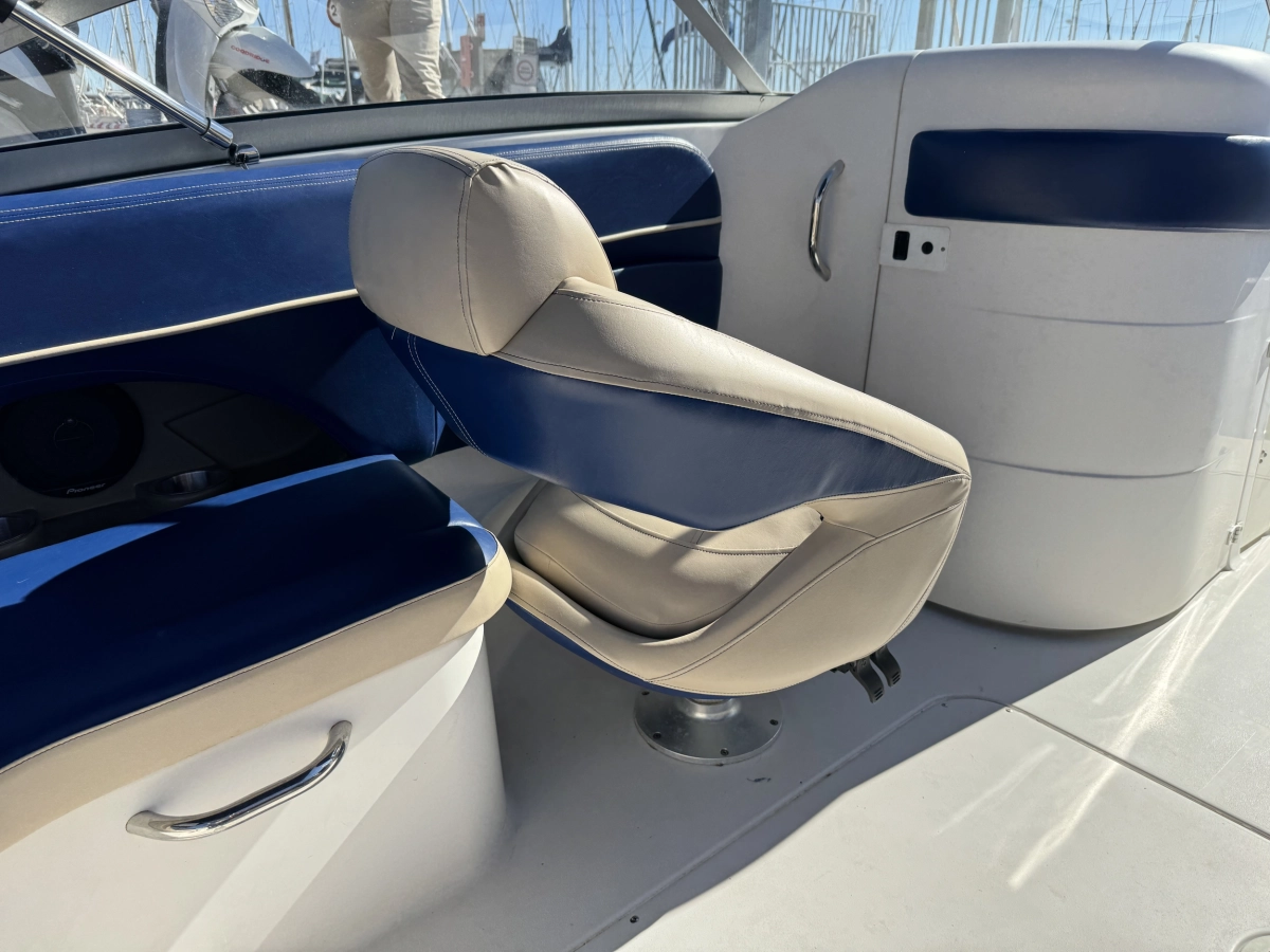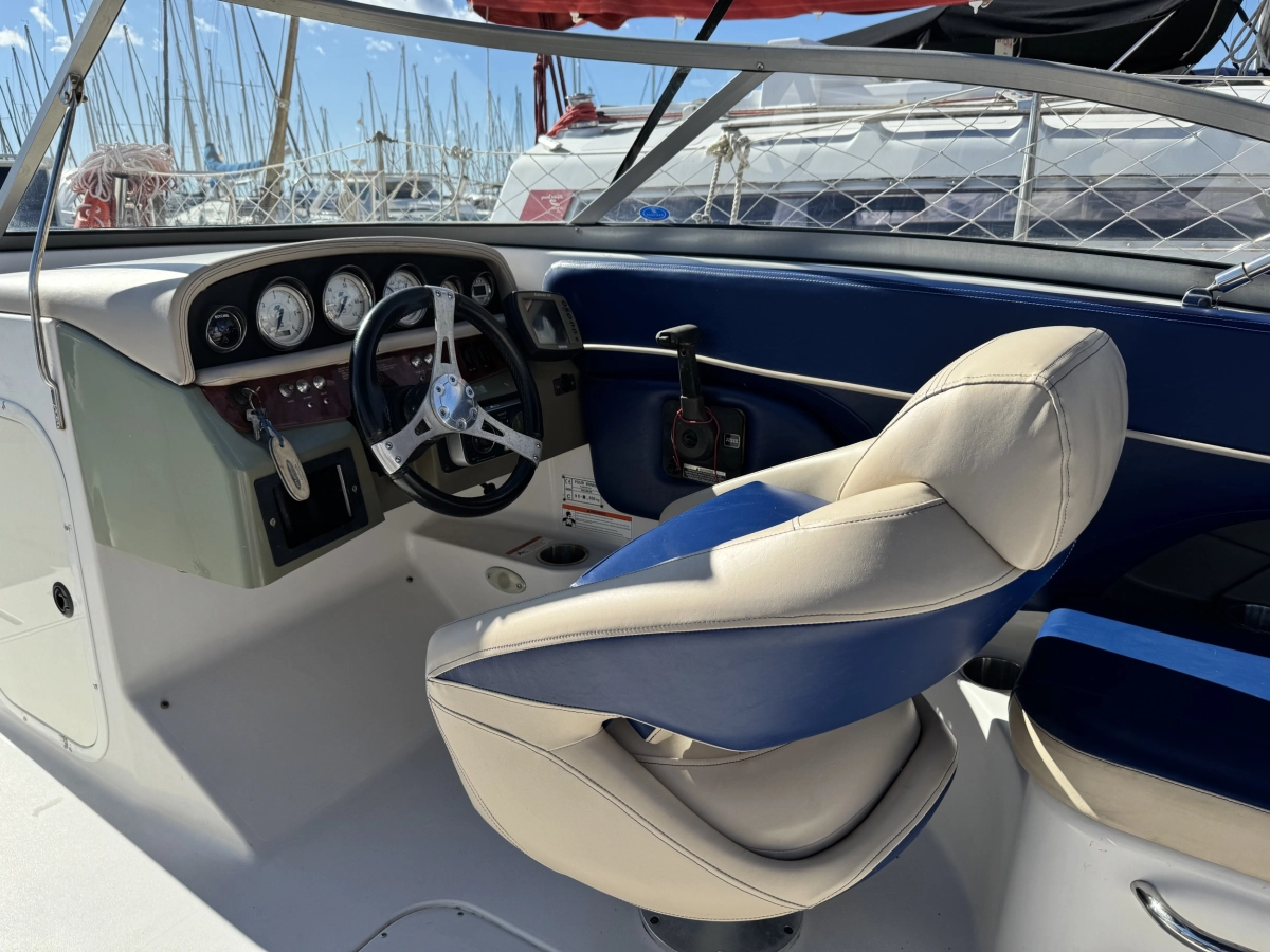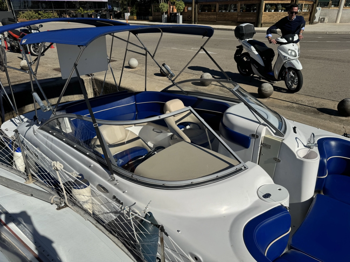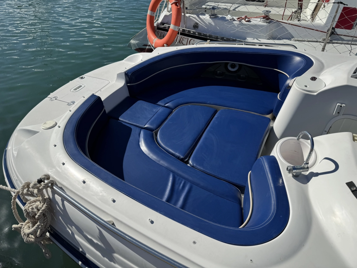 WC químico, Tapicería nueva 2023, Toldo Bimini nuevo 2023, Pintado del casco 2022, Ducha en popa, Radio CD con altavoces, Toma a 12V, Mesa en bañera, Compás, Solárium en popa, Escalera de baño.