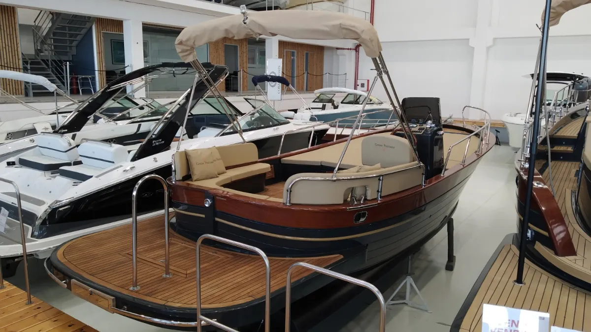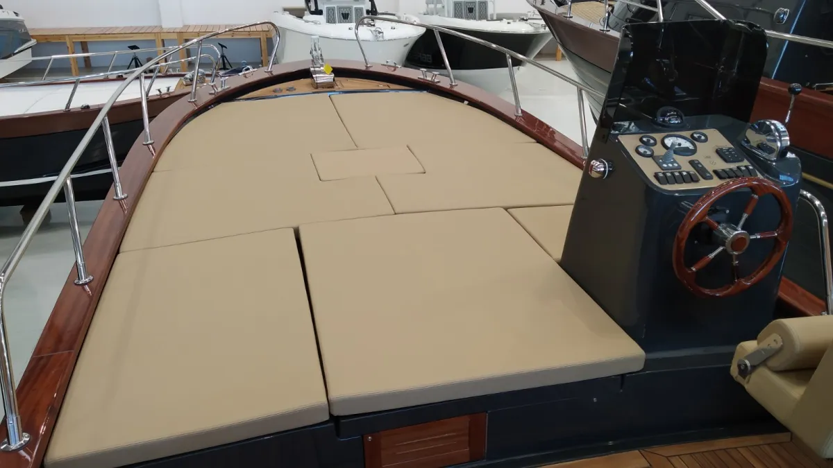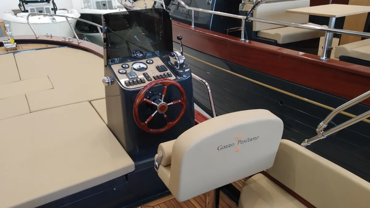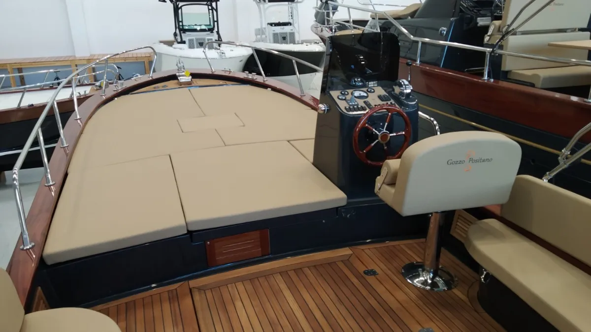 Embarcación en fabricación. Entrega febrero 2026. Fotos de archivo, los colores y el equipamiento pueden no corresponder exactamente a la unidad ofrecida. Modelo Positano 27 del astillero napolitano Gozzo Positano, de 8,22 metros de eslora total. Barco con gran plataforma de baño, caña y cabina.