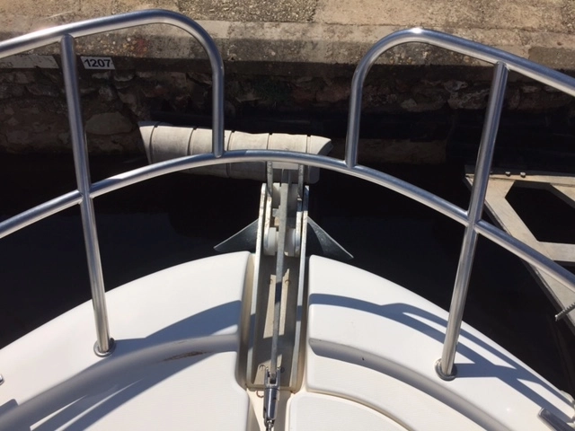 El barco jeanneau PRESTIGE 36 cuenta con un buen equipamiento Esta embarcación viene con un equipamiento muy completo: Molinete ancla con equipo de fondeo, solárium proa, lona fly más toldo sol fly, teca bañera y plataforma, GPS, Plotter, Sonda, Piloto automático, Radio VHF, cargador toma a puerto.