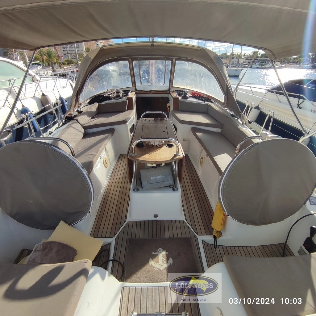 Equipamiento cubierta: Ancla con cofre y molinete eléctrico, x3 winches eléctricos, plataforma de baño en teca con escalera, ducha en popa, asientos y mesa en bañera, capote contra rociones, bimini, soporte para motor FB en popa.