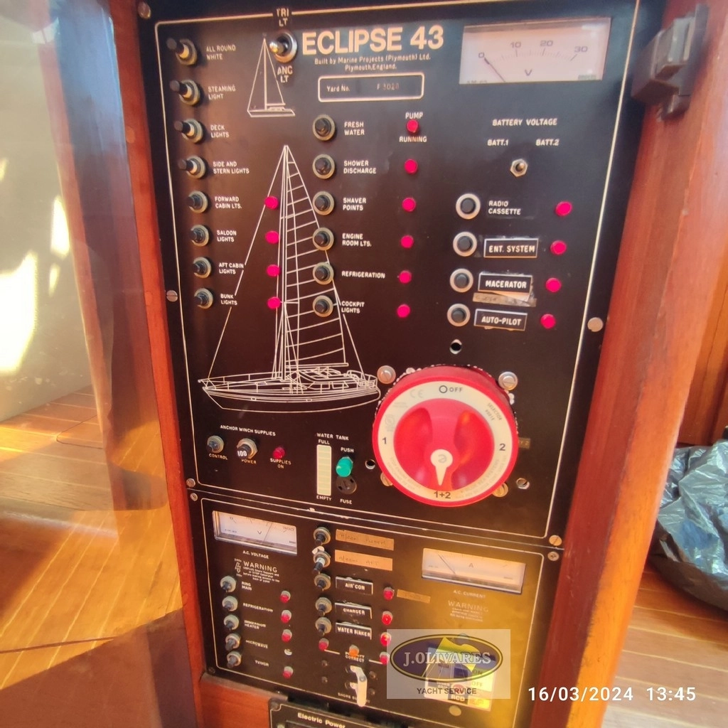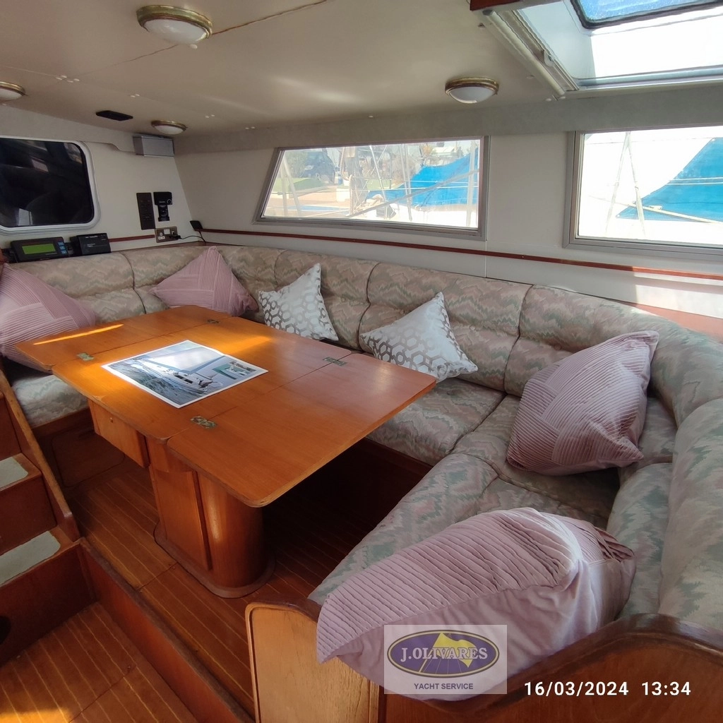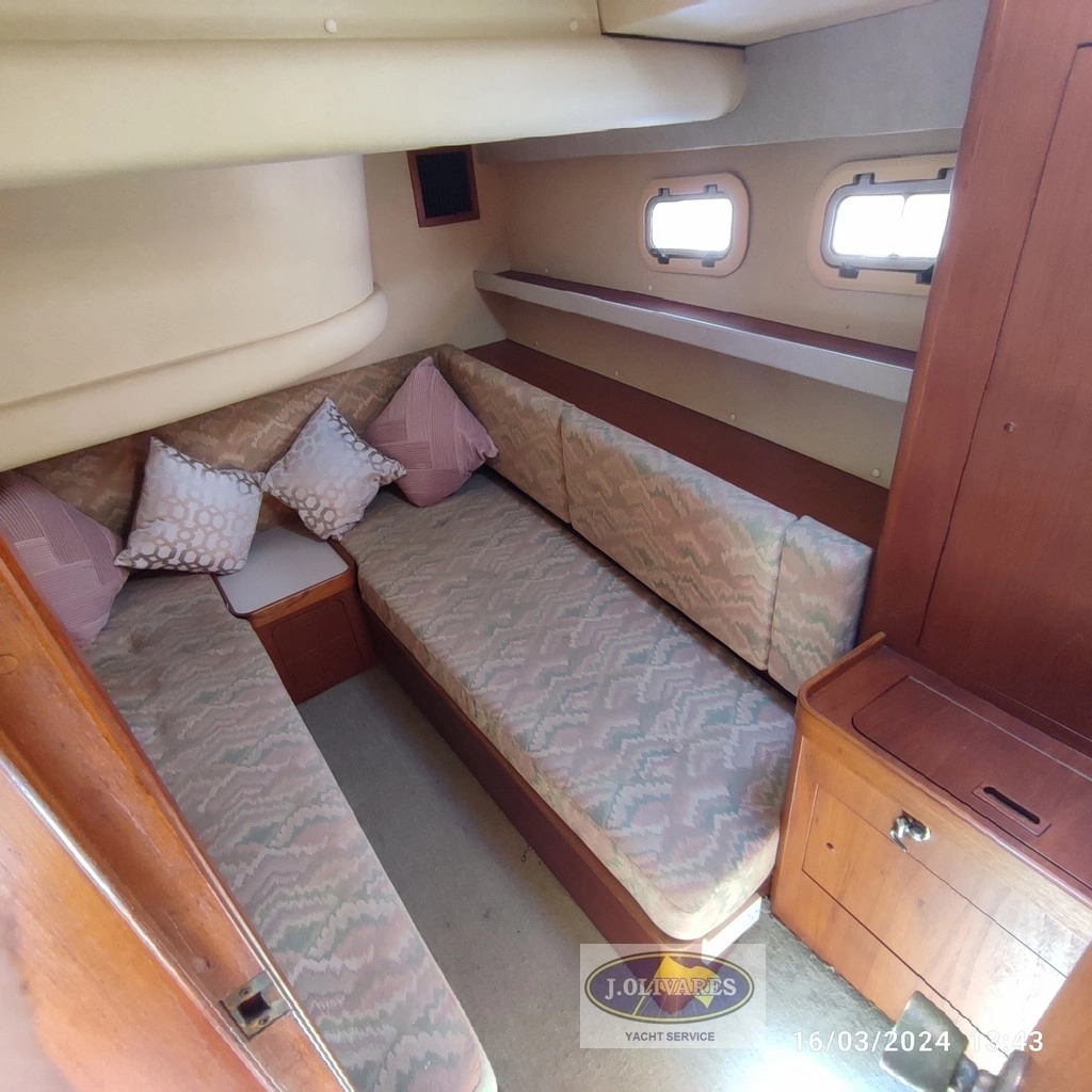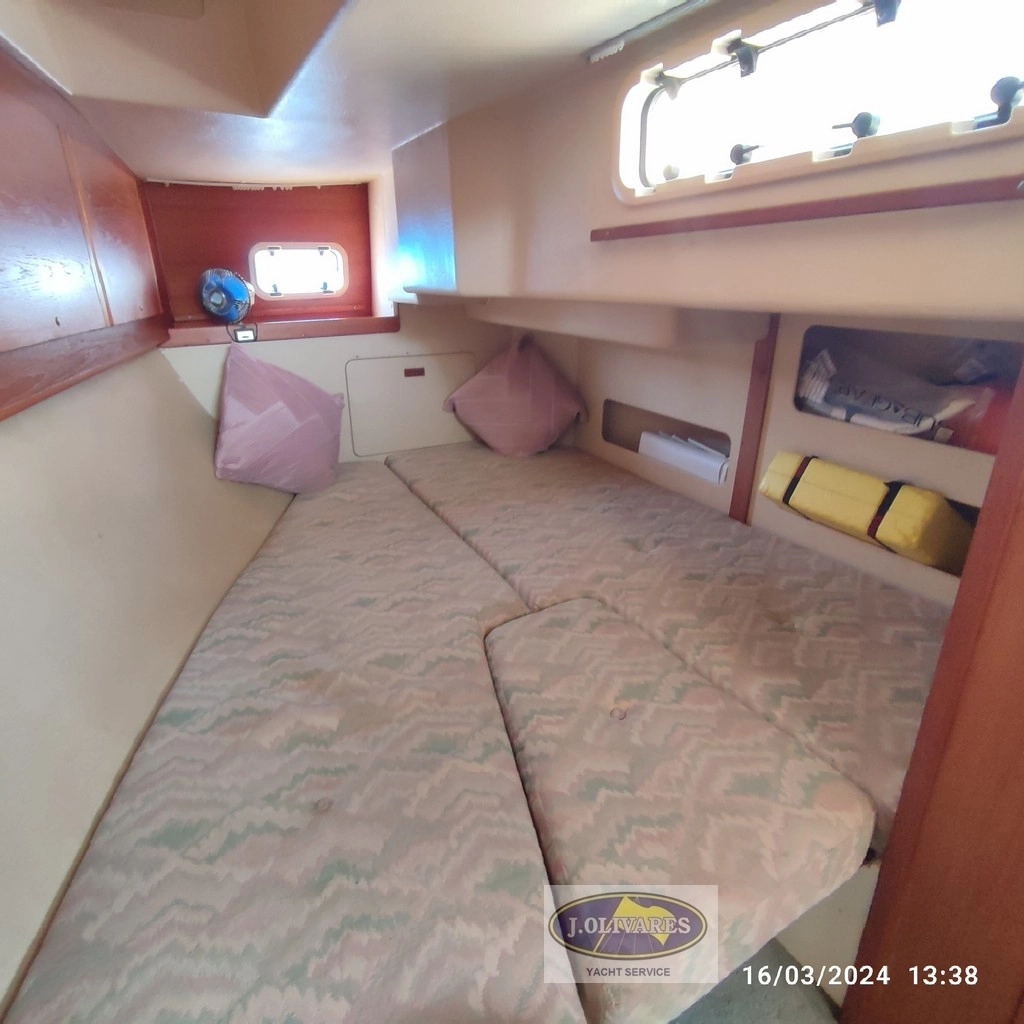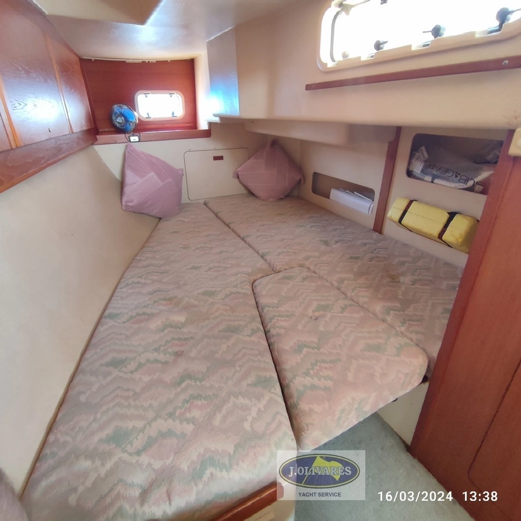 MOODY ECLIPSE 43 (1990) Año: 1990 Bandera: Reino Unido (Nunca Española) Eslora: 12,95 m Manga: 4,26 m Calado: 1,47 m Motor: Perkins Prima 80T(Diésel 80cv) Depósito combustible: 410 litros. Depósito de agua: 450 litros. Electrónica: Piloto automático, sonda, GPS, compás, corredera, plotter, equipo de viento, radar, VHF, AIS, hélice de proa. Velas: Mayor con enrollador en palo, foque con enrollador, génova con enrollador, spinnaker con tangón Equipamiento cubierta: Solarium de proa y popa con colchonetas, 2 anclas con cofre, molinete eléctrico nuevo de 1.500w, plataforma de baño con escalera, pescantes, pasarela manual, winches eléctricos, ducha en popa, asientos, mesa y altavoces en bañera, arco de radar, cierre completo para bañera con bimini. Cabinas: 3 + salón convertible Aseos: 2 Cocina: A gas, microondas, fregadero, frigorifico y congelador. Equipamiento confort: enchufes a 220v, baterías de motores y servicios(5 baterías en total), generador eléctrico Onan 5kw, cargador con toma a puerto, 2 unidades de aire acondicionado, purificadora de agua, paneles solares, calefacción, calentador de agua (Nuevo en 2023).