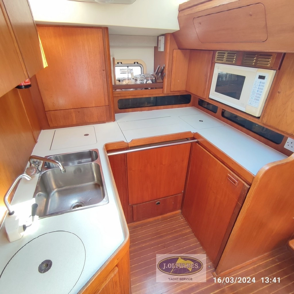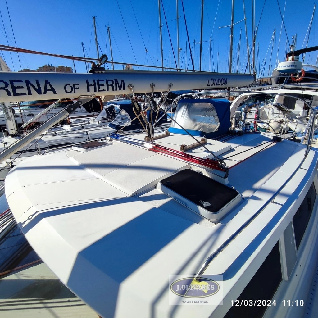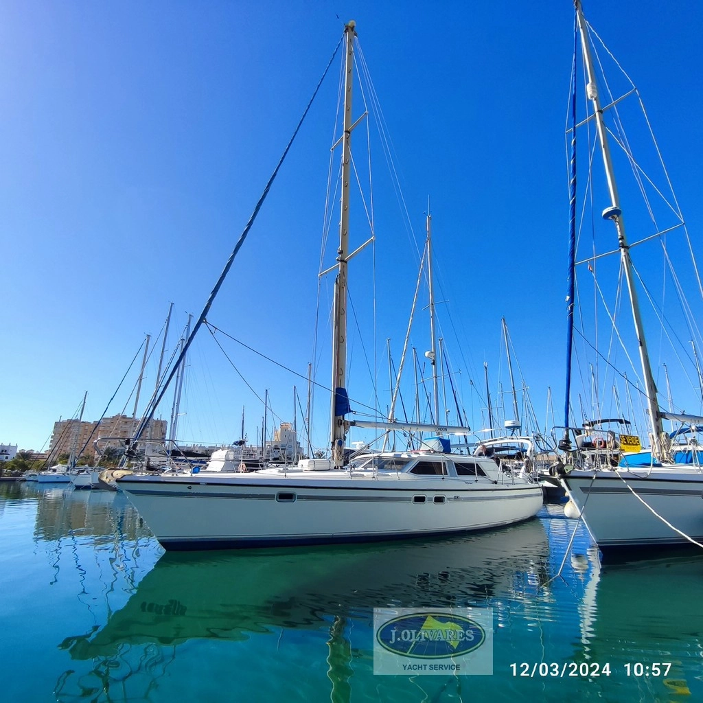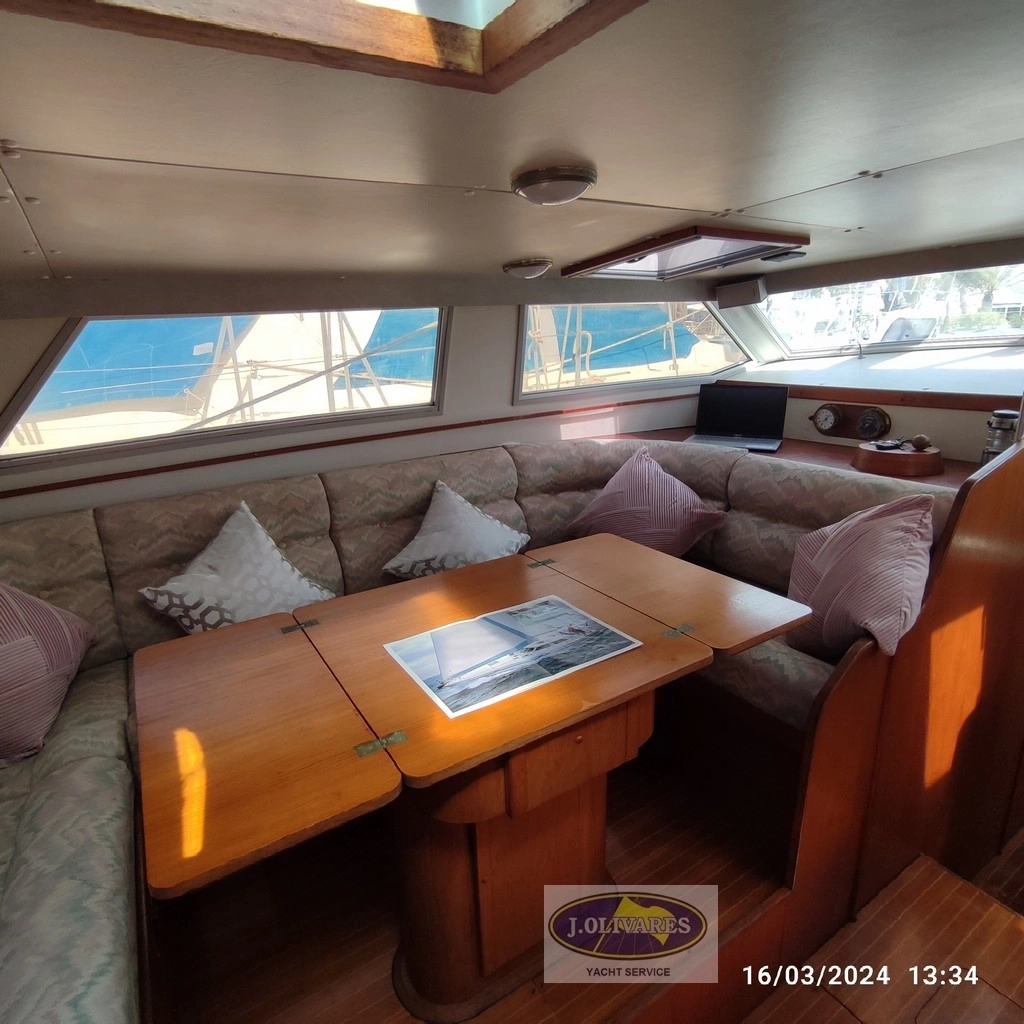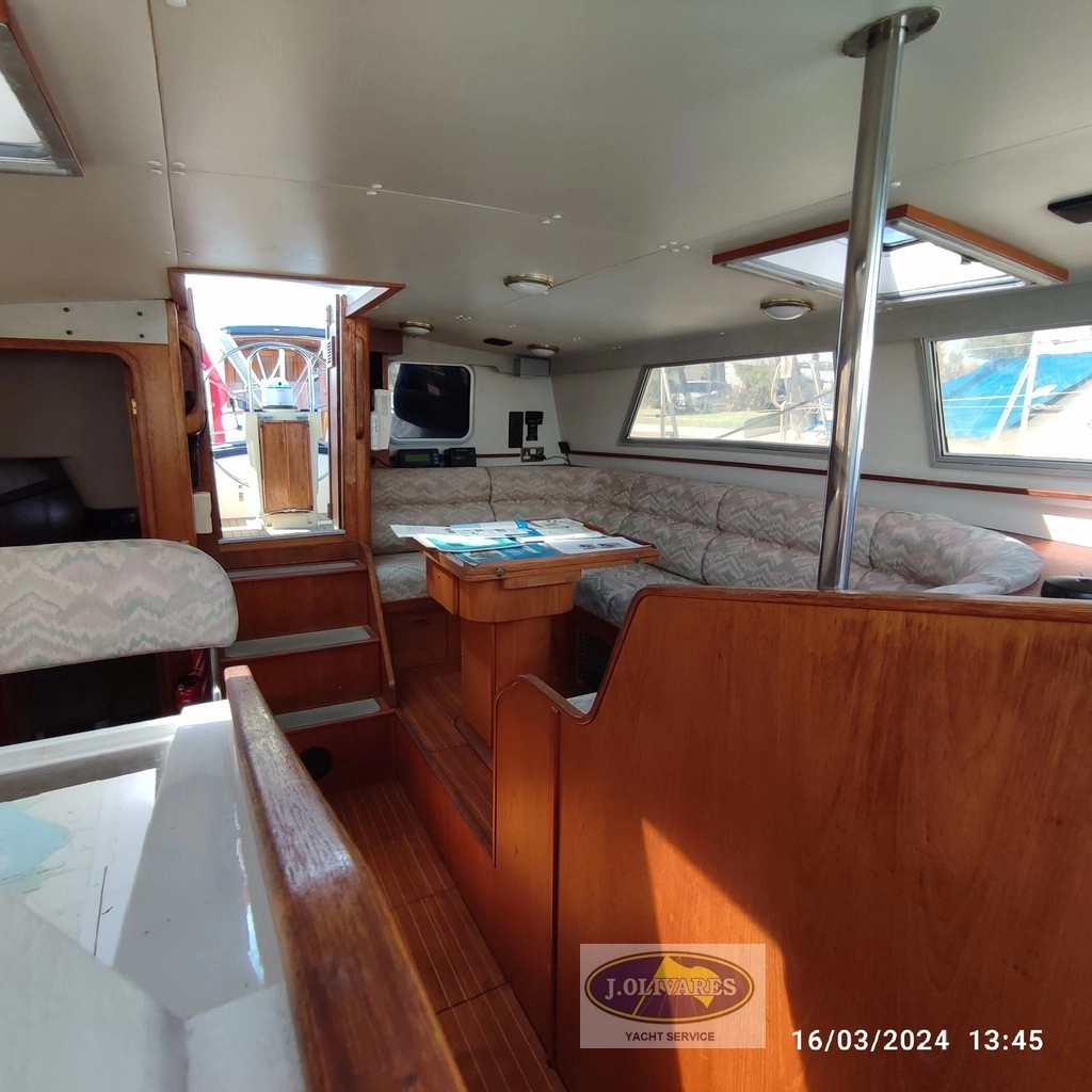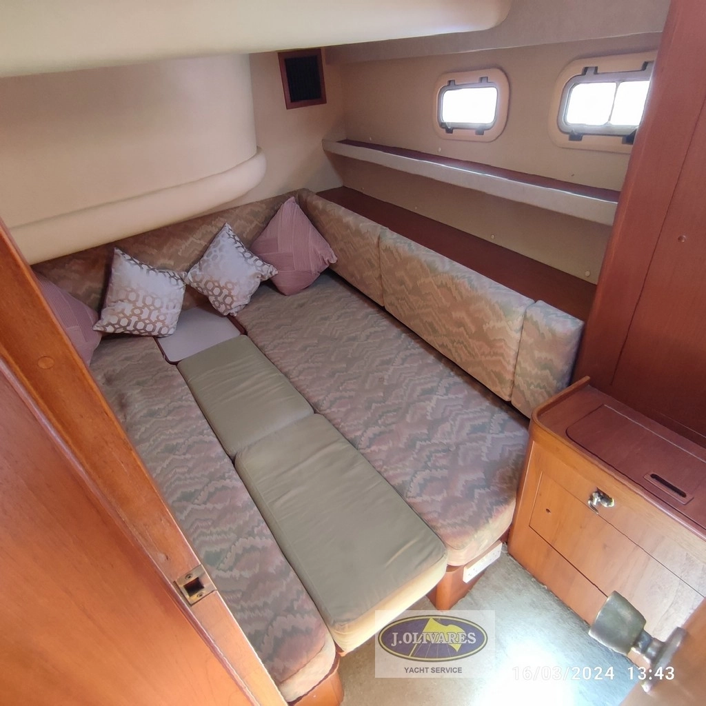 MOODY ECLIPSE 43 (1990) Año: 1990 Bandera: Reino Unido (Nunca Española) Eslora: 12,95 m Manga: 4,26 m Calado: 1,47 m Motor: Perkins Prima 80T(Diésel 80cv) Depósito combustible: 410 litros. Depósito de agua: 450 litros. Electrónica: Piloto automático, sonda, GPS, compás, corredera, plotter, equipo de viento, radar, VHF, AIS, hélice de proa. Velas: Mayor con enrollador en palo, foque con enrollador, génova con enrollador, spinnaker con tangón Equipamiento cubierta: Solarium de proa y popa con colchonetas, 2 anclas con cofre, molinete eléctrico nuevo de 1.500w, plataforma de baño con escalera, pescantes, pasarela manual, winches eléctricos, ducha en popa, asientos, mesa y altavoces en bañera, arco de radar, cierre completo para bañera con bimini. Cabinas: 3 + salón convertible Aseos: 2 Cocina: A gas, microondas, fregadero, frigorifico y congelador. Equipamiento confort: enchufes a 220v, baterías de motores y servicios(5 baterías en total), generador eléctrico Onan 5kw, cargador con toma a puerto, 2 unidades de aire acondicionado, purificadora de agua, paneles solares, calefacción, calentador de agua (Nuevo en 2023).