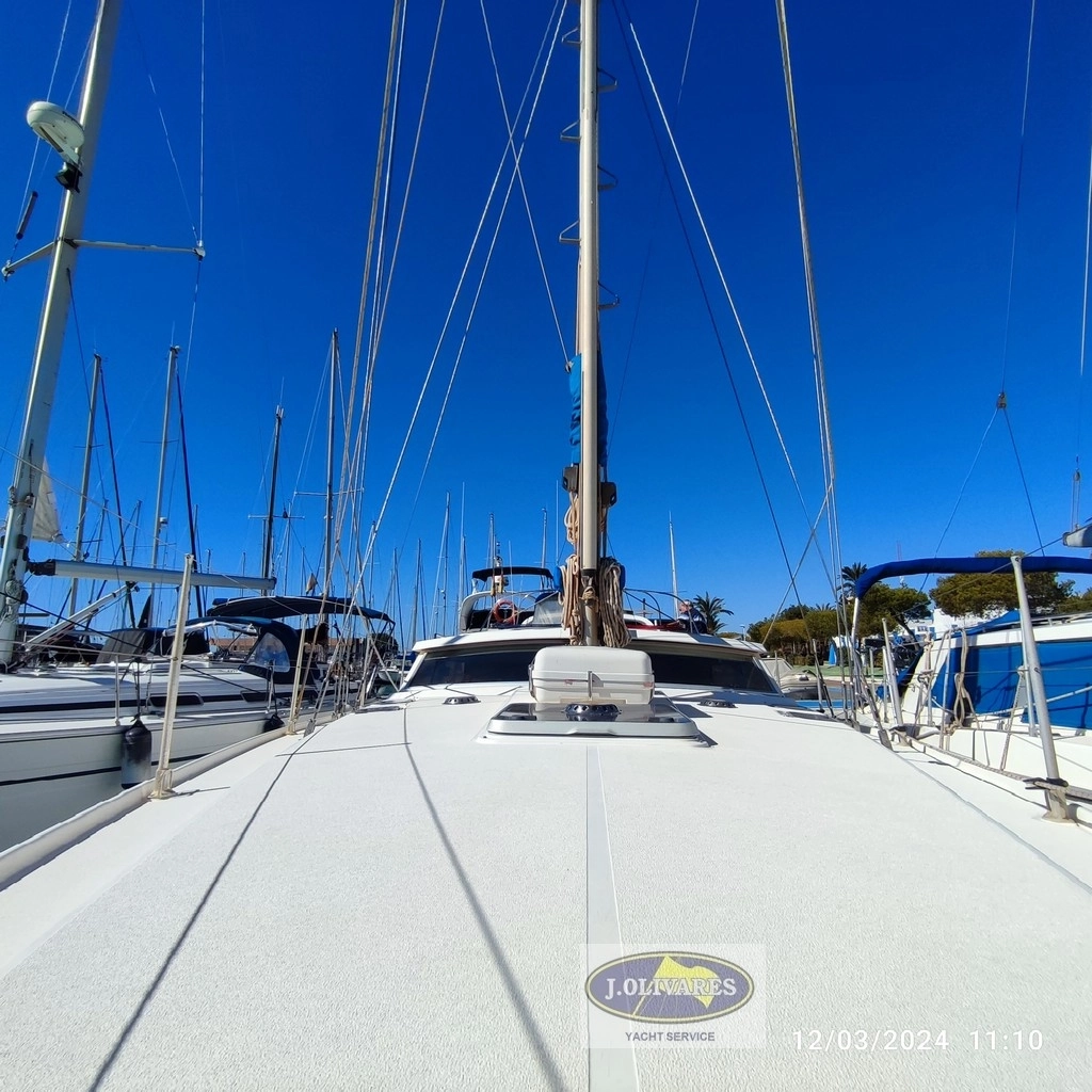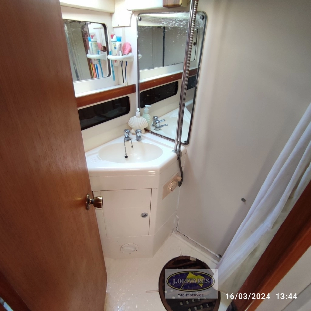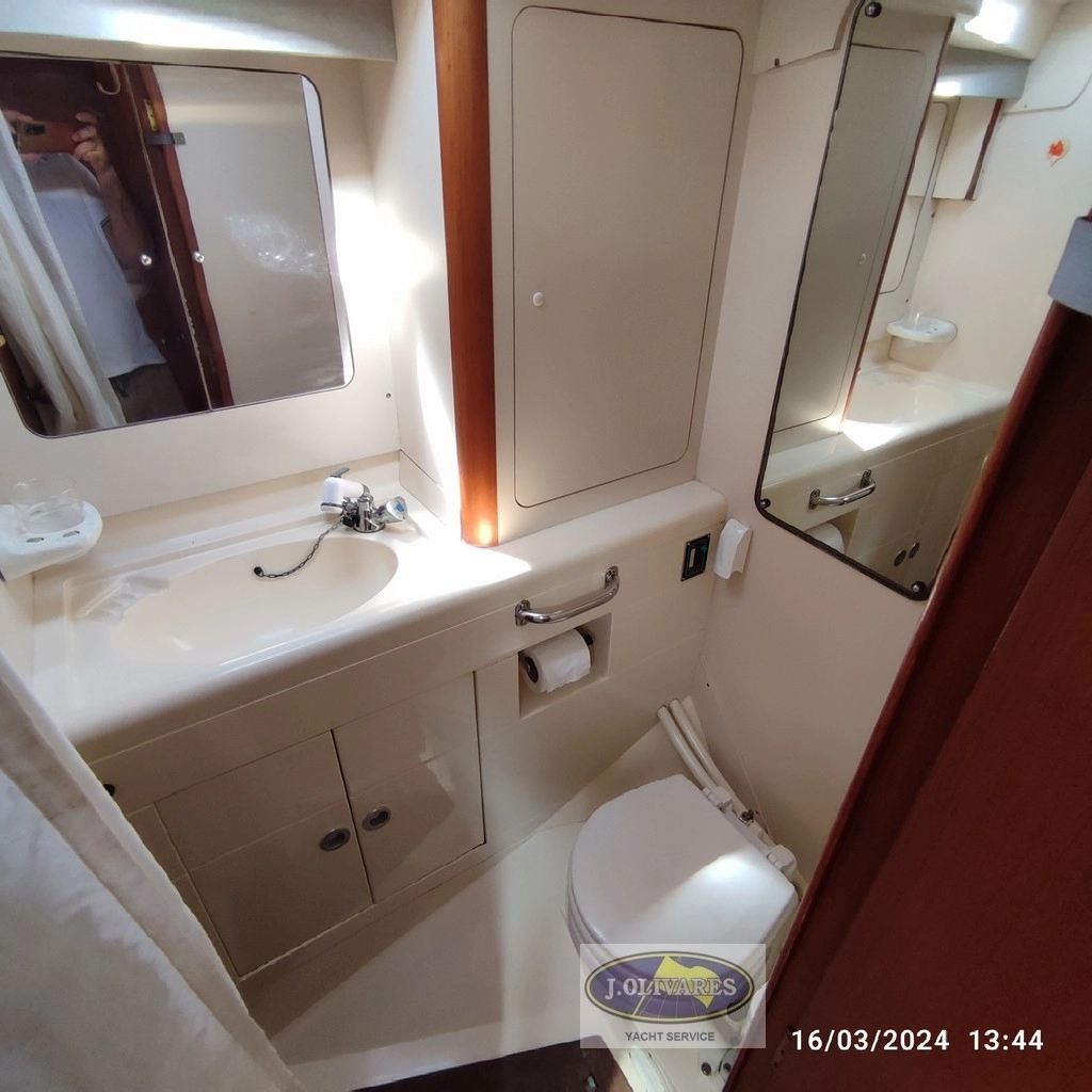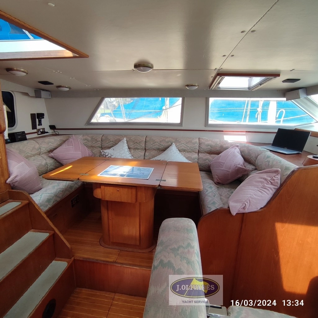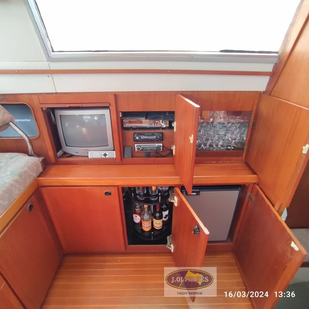 MOODY ECLIPSE 43 (1990) Año: 1990 Bandera: Reino Unido (Nunca Española) Eslora: 12,95 m Manga: 4,26 m Calado: 1,47 m Motor: Perkins Prima 80T(Diésel 80cv) Depósito combustible: 410 litros. Depósito de agua: 450 litros. Electrónica: Piloto automático, sonda, GPS, compás, corredera, plotter, equipo de viento, radar, VHF, AIS, hélice de proa. Velas: Mayor con enrollador en palo, foque con enrollador, génova con enrollador, spinnaker con tangón Equipamiento cubierta: Solarium de proa y popa con colchonetas, 2 anclas con cofre, molinete eléctrico nuevo de 1.500w, plataforma de baño con escalera, pescantes, pasarela manual, winches eléctricos, ducha en popa, asientos, mesa y altavoces en bañera, arco de radar, cierre completo para bañera con bimini. Cabinas: 3 + salón convertible Aseos: 2 Cocina: A gas, microondas, fregadero, frigorifico y congelador. Equipamiento confort: enchufes a 220v, baterías de motores y servicios(5 baterías en total), generador eléctrico Onan 5kw, cargador con toma a puerto, 2 unidades de aire acondicionado, purificadora de agua, paneles solares, calefacción, calentador de agua (Nuevo en 2023).