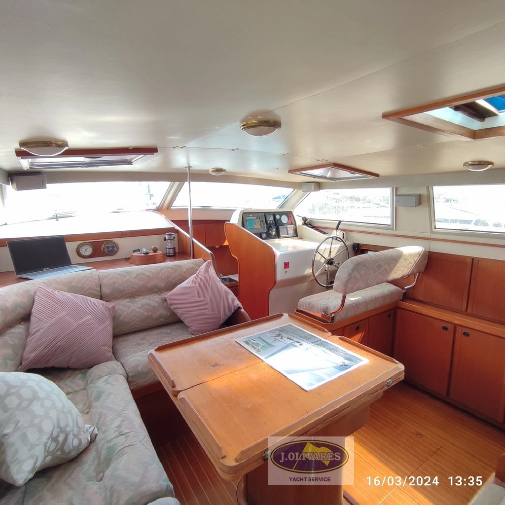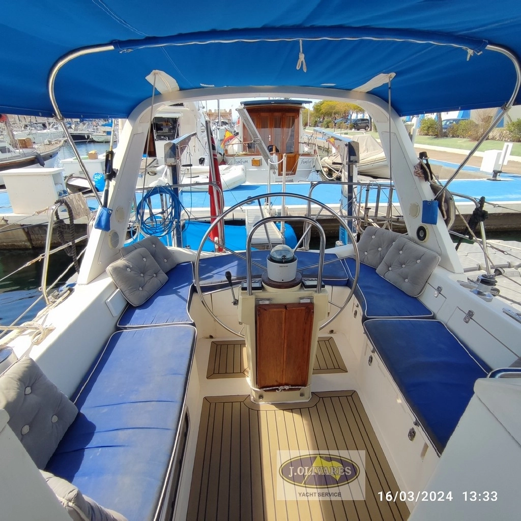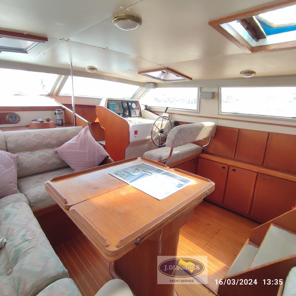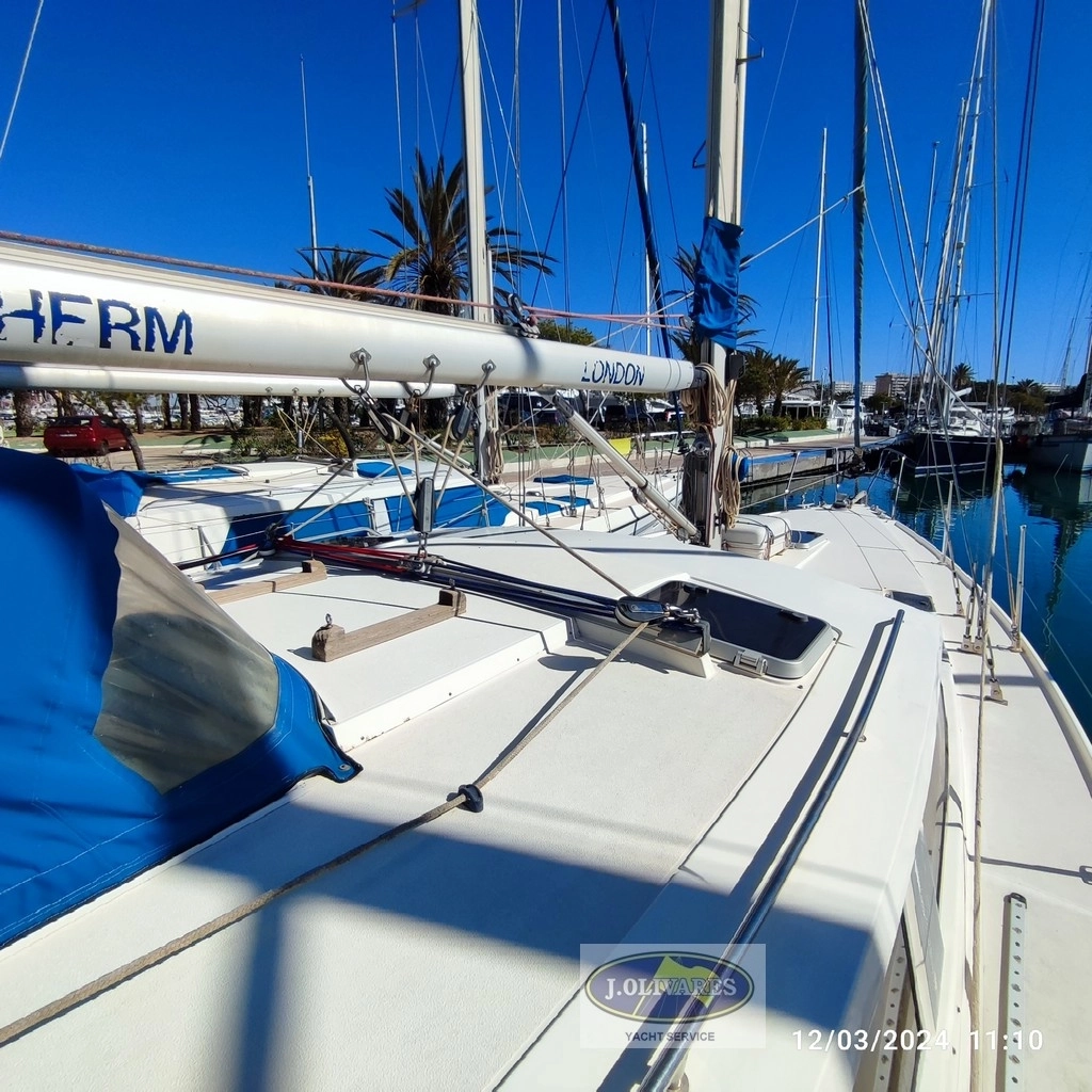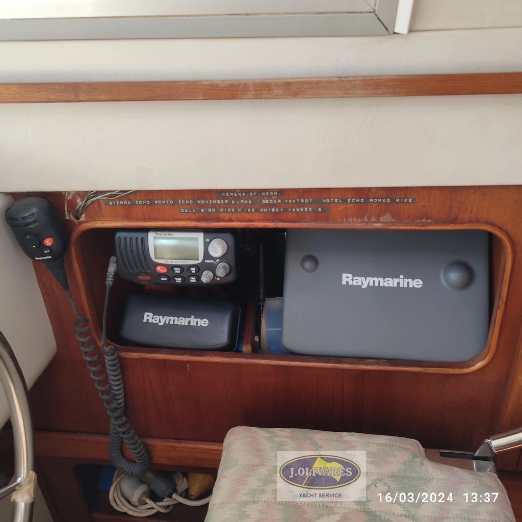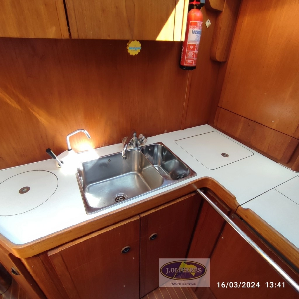 MOODY ECLIPSE 43 (1990) Año: 1990 Bandera: Reino Unido (Nunca Española) Eslora: 12,95 m Manga: 4,26 m Calado: 1,47 m Motor: Perkins Prima 80T(Diésel 80cv) Depósito combustible: 410 litros. Depósito de agua: 450 litros. Electrónica: Piloto automático, sonda, GPS, compás, corredera, plotter, equipo de viento, radar, VHF, AIS, hélice de proa. Velas: Mayor con enrollador en palo, foque con enrollador, génova con enrollador, spinnaker con tangón Equipamiento cubierta: Solarium de proa y popa con colchonetas, 2 anclas con cofre, molinete eléctrico nuevo de 1.500w, plataforma de baño con escalera, pescantes, pasarela manual, winches eléctricos, ducha en popa, asientos, mesa y altavoces en bañera, arco de radar, cierre completo para bañera con bimini. Cabinas: 3 + salón convertible Aseos: 2 Cocina: A gas, microondas, fregadero, frigorifico y congelador. Equipamiento confort: enchufes a 220v, baterías de motores y servicios(5 baterías en total), generador eléctrico Onan 5kw, cargador con toma a puerto, 2 unidades de aire acondicionado, purificadora de agua, paneles solares, calefacción, calentador de agua (Nuevo en 2023).