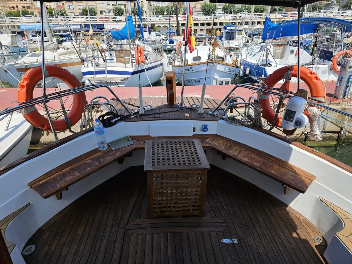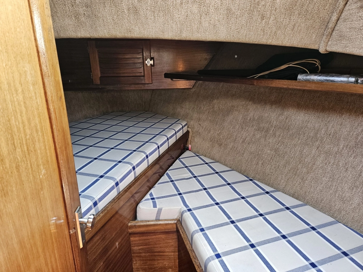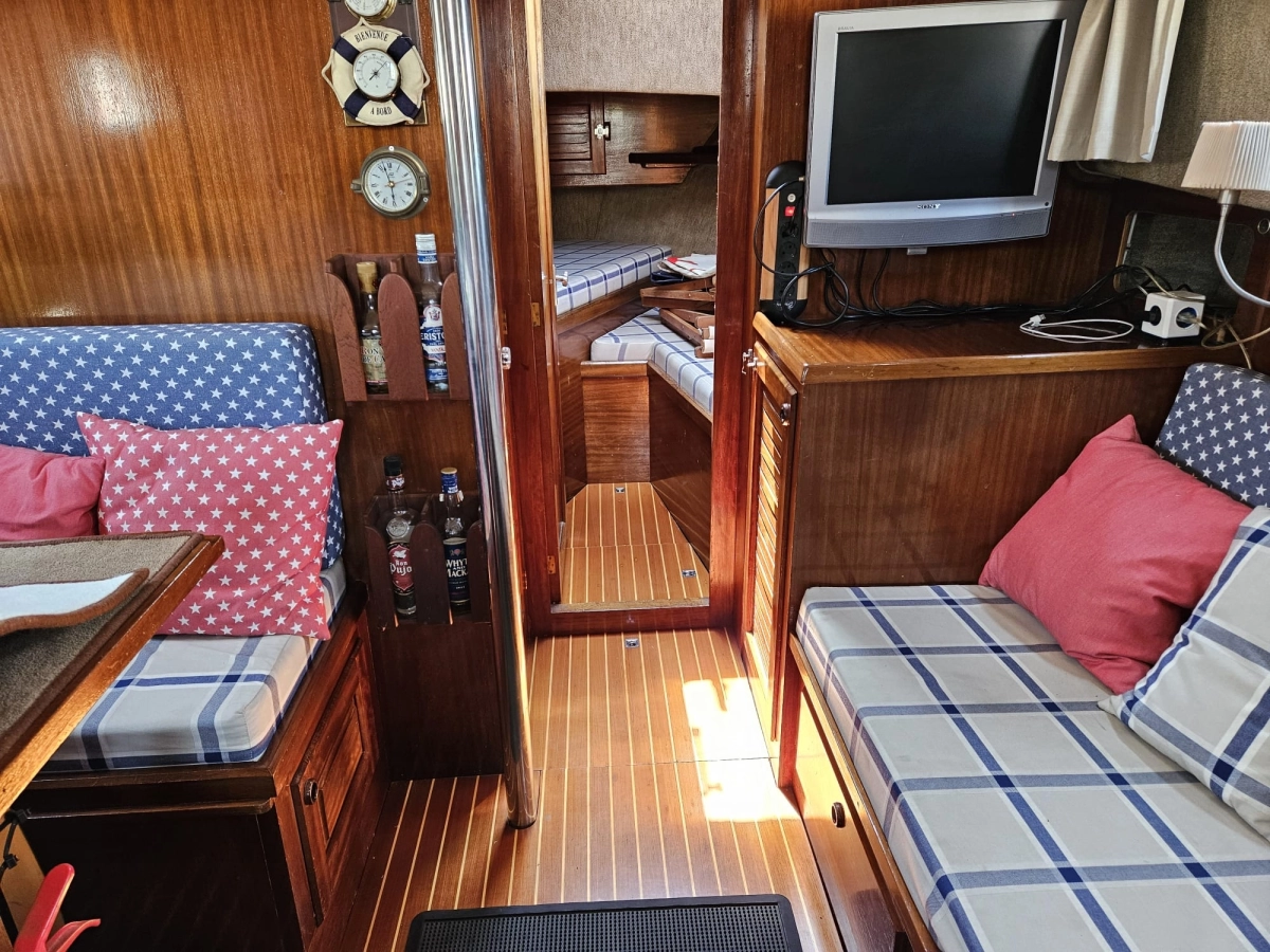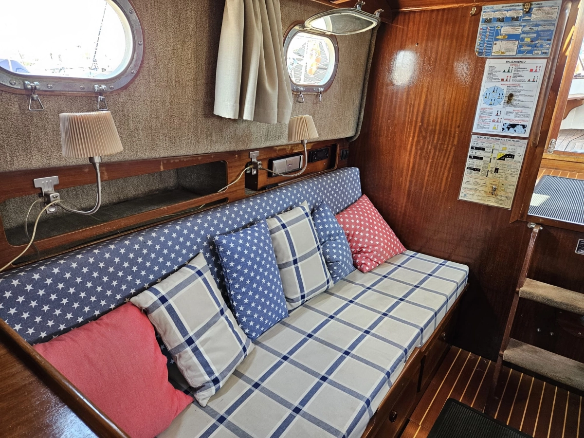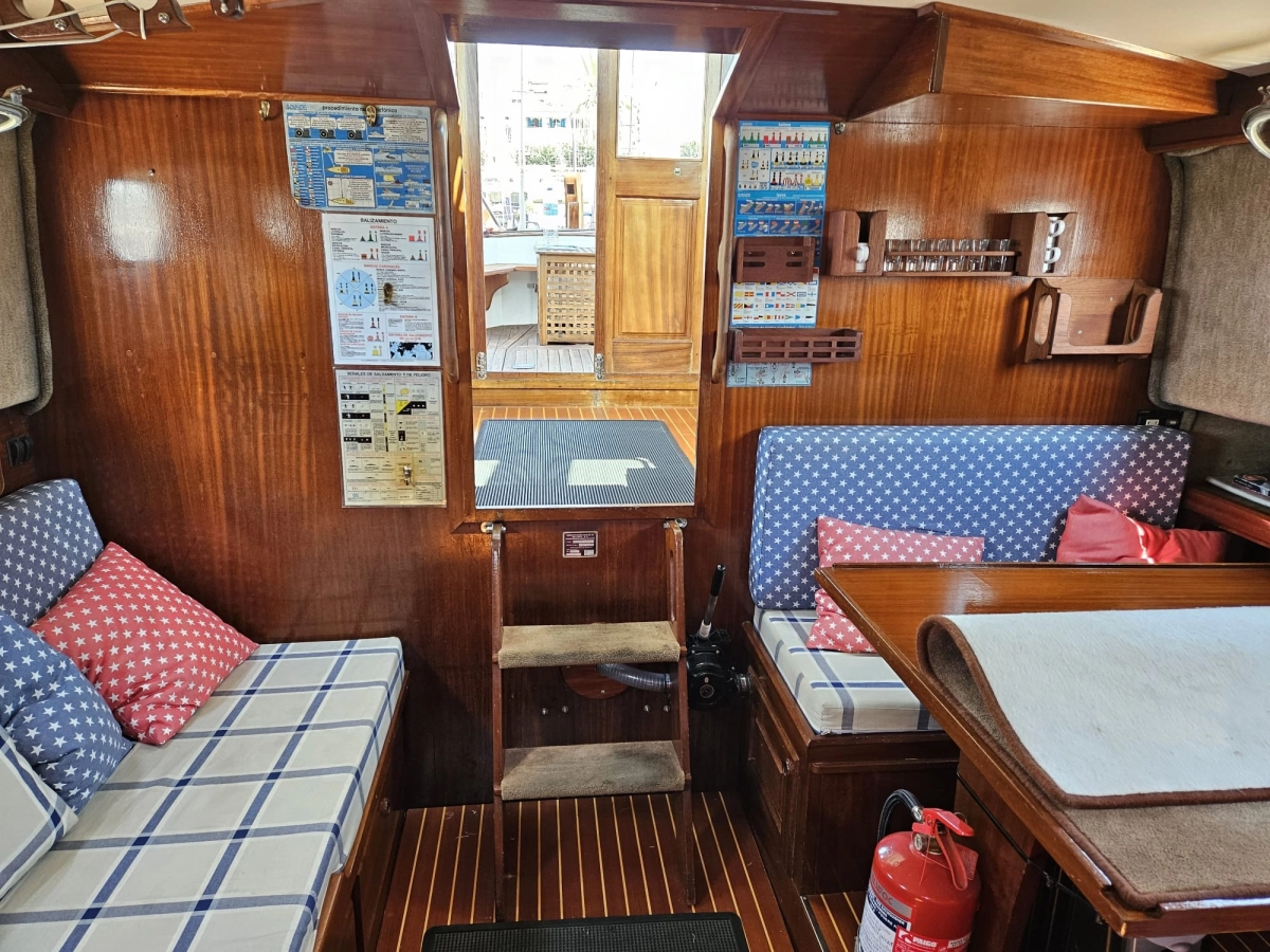 1 Cabina 1 Baño, WC eléctrico, Vela Mayor con Lazy Back, Génova enrollable, GPS Plotter Garmin 4005, Piloto automático, Equipo de viento, Cargador de baterías, Toma tierra, Hélice de proa, Molinete eléctrico, Agua caliente, Nevera eléctrica (falta carga gas), Entrada proa con escalera Inox, Plataforma de baño, 2 Escaleras de baño, Toldo popa, fundas en ventanas, Balsa y radiobaliza a revisar, Bocinas secas ejes, Motores nuevos año 2000, 1.200 horas de navegación, Bandera española, Uso privado.