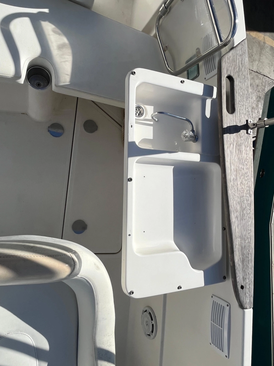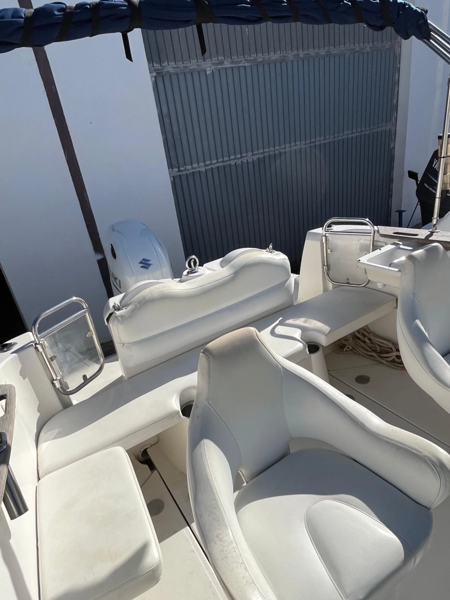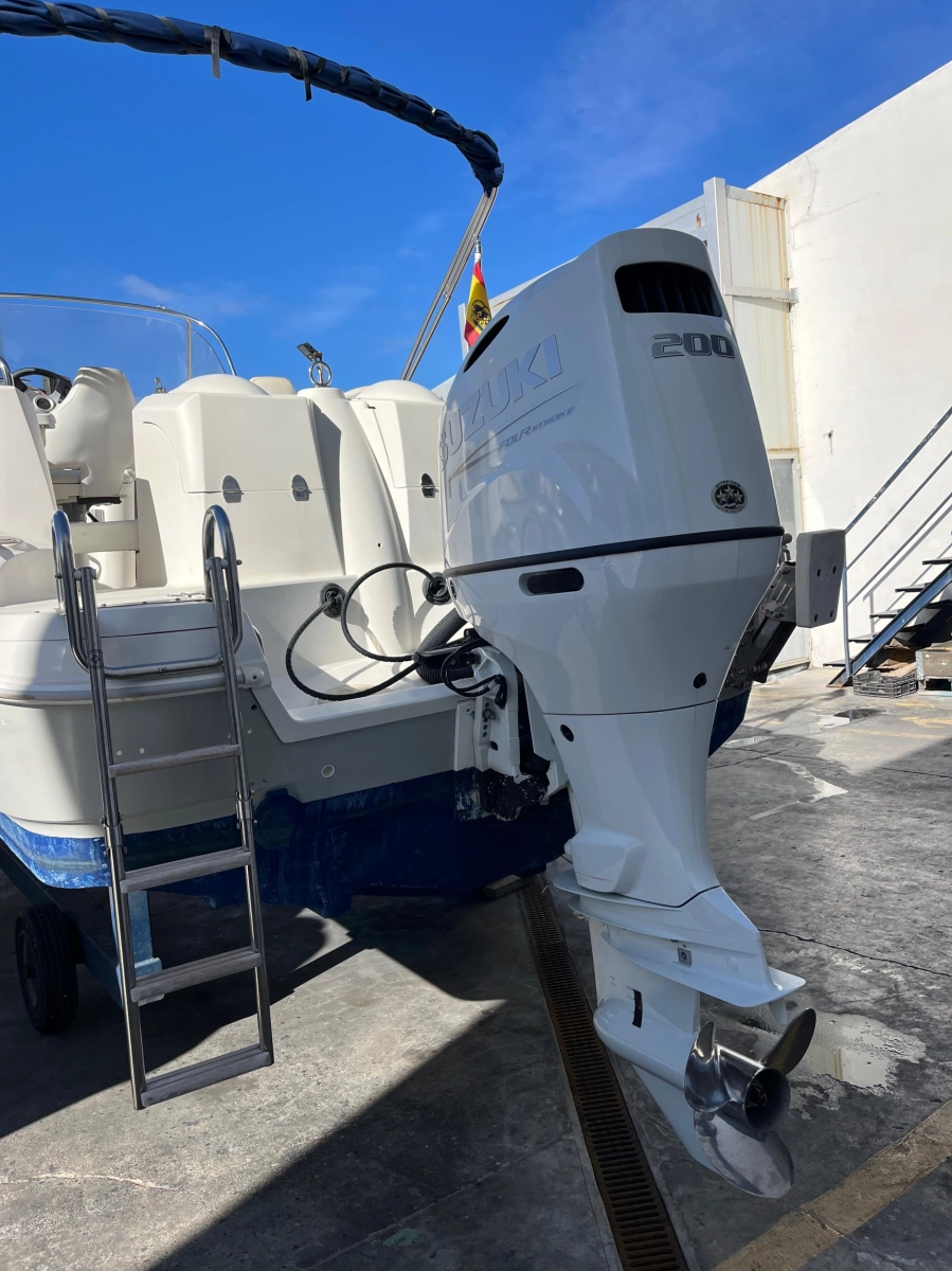Gran toldo parasol, colchonetas completas solarium y asientos de popa, lavamanos pegable en popa, MOTOR SUZUKI 200CV 2022, con sólo 70 horas de uso, espacio para estiba, molinete eléctrico, equipo de fondeo y seguridad. Escalera de baño.