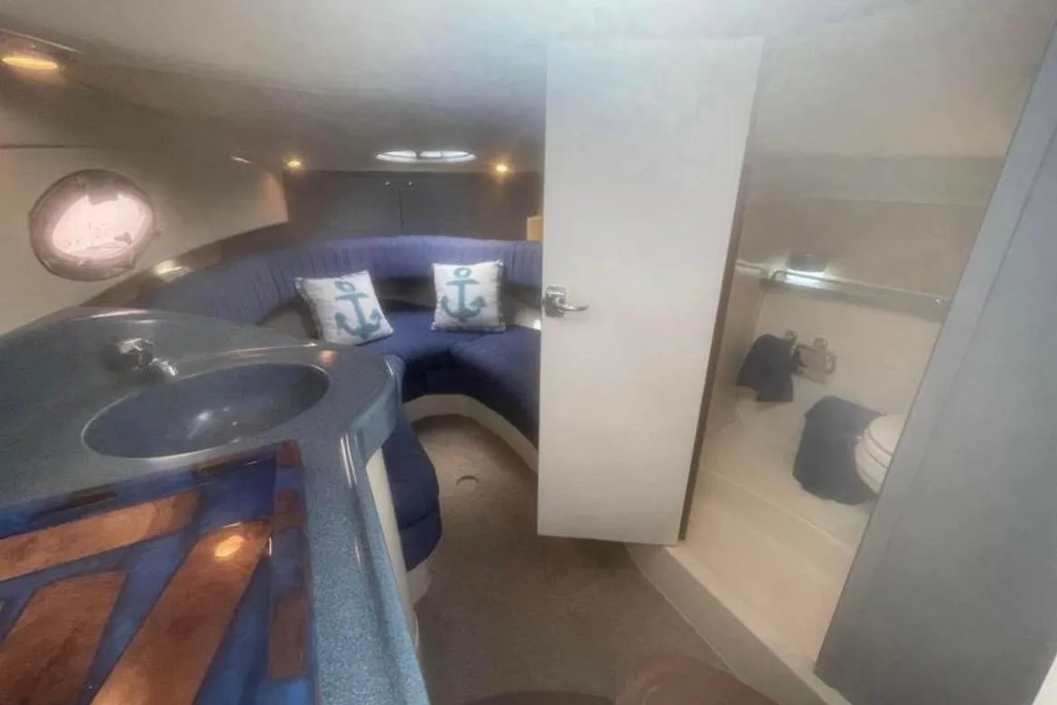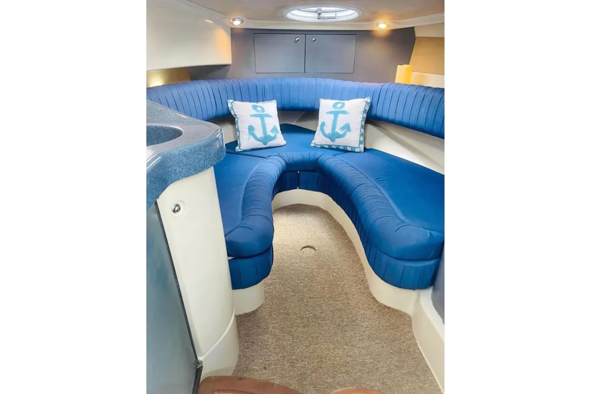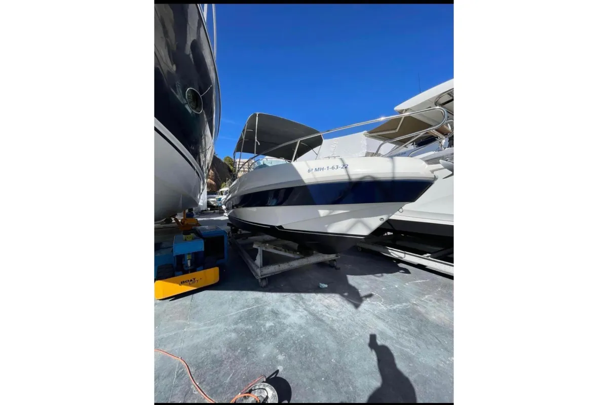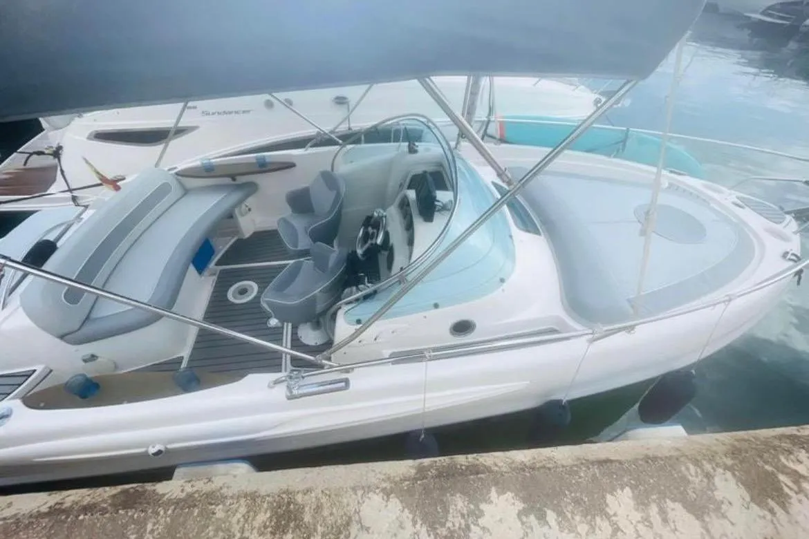 [EN] The 2006 Rio 750 Day Cruiser is a 7.46-meter fiberglass boat powered by two 135 HP Mercruiser 3.0L engines. It cruises comfortably at around 25 knots and is designed for up to 7 people. On board, you'll find a cabin and an electric marine head, making it well-suited for relaxed day trips or short overnights. Perfect for exploring nearby beaches and calas, this boat is also commercially licensed for charter. Possibility to have a mooring at Club Nautico Palma.